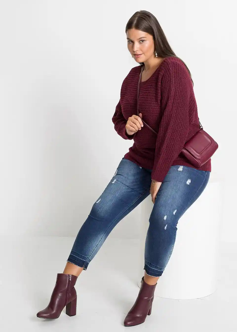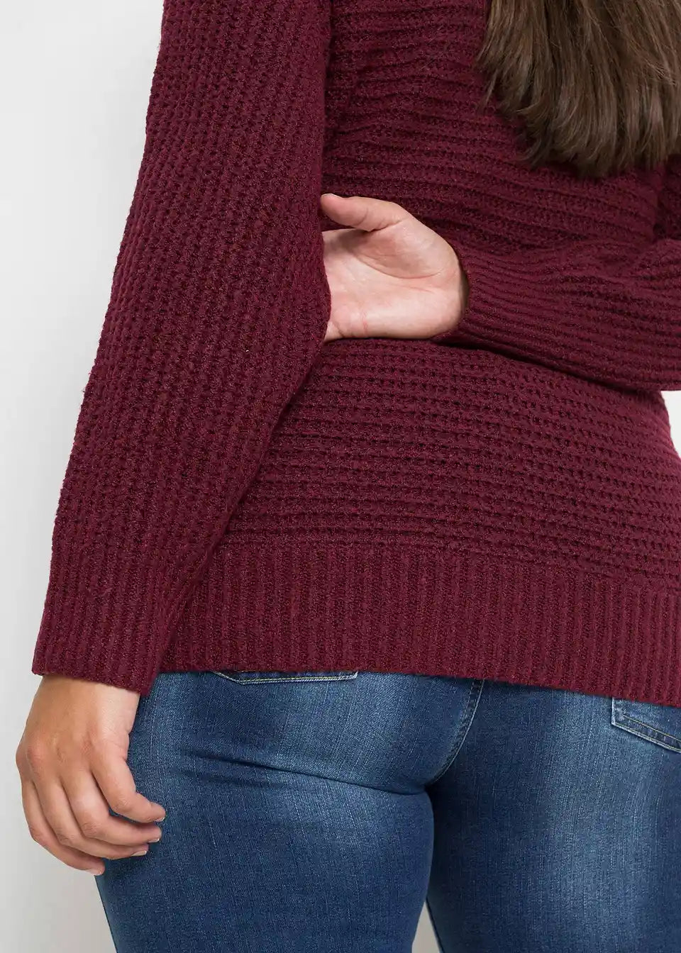 Razni elementi kod ovog privlačnog pulovera doprinose podjednako bezvremenskoj ležernosti i visokom faktoru udobnosti. Dizajn grubog pletiva daje ovom posebnom modelu s U-izrezom modernu notu. Ramena se bešavno spajaju sa široko krojenim rukavima u stilu šišmiša. Kul izgled postiže se tajicama od imitacije kože i čizmama s uzorkom leoparda. Skinny traperice i elegantne salonke također odlično pristaju uz pulover s velikim rebrastim obrubima na izrezu, rukavima i rubu od BODYFLIRT.