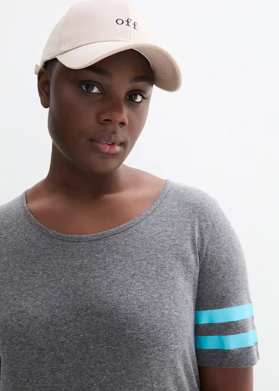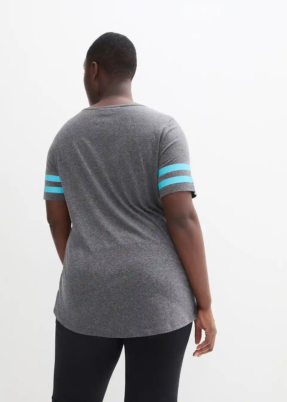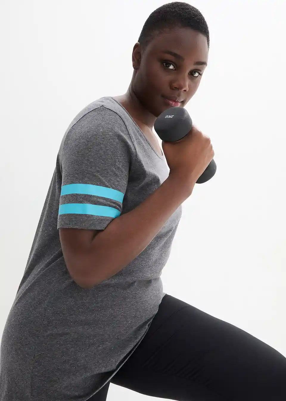 Sportska majica s prugama na rukavima, kratkih rukava, blago trapez oblikovana, periva u perilici, duljina u veličini 40/42 cca 70 cm.