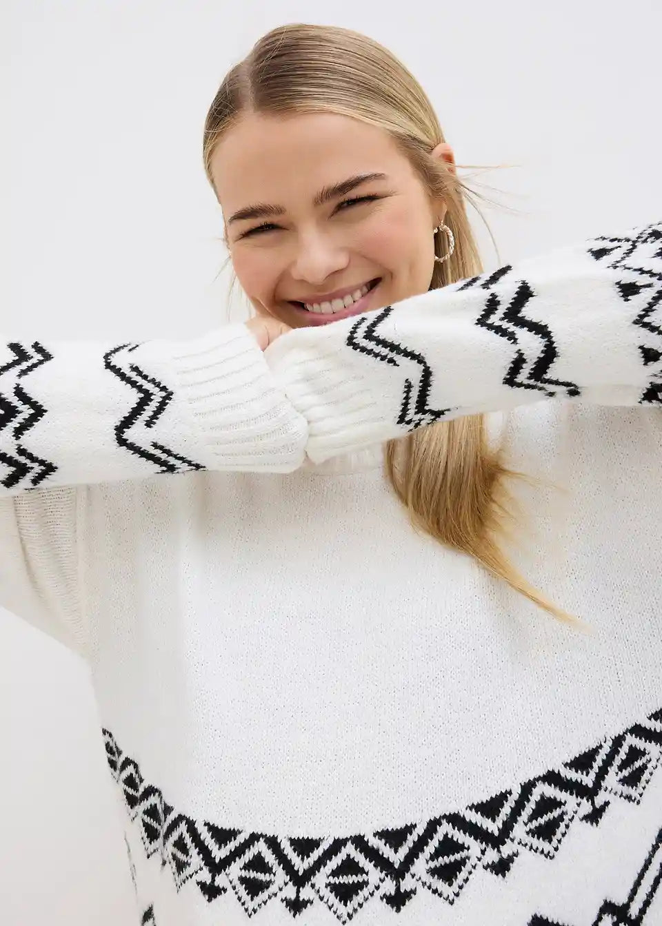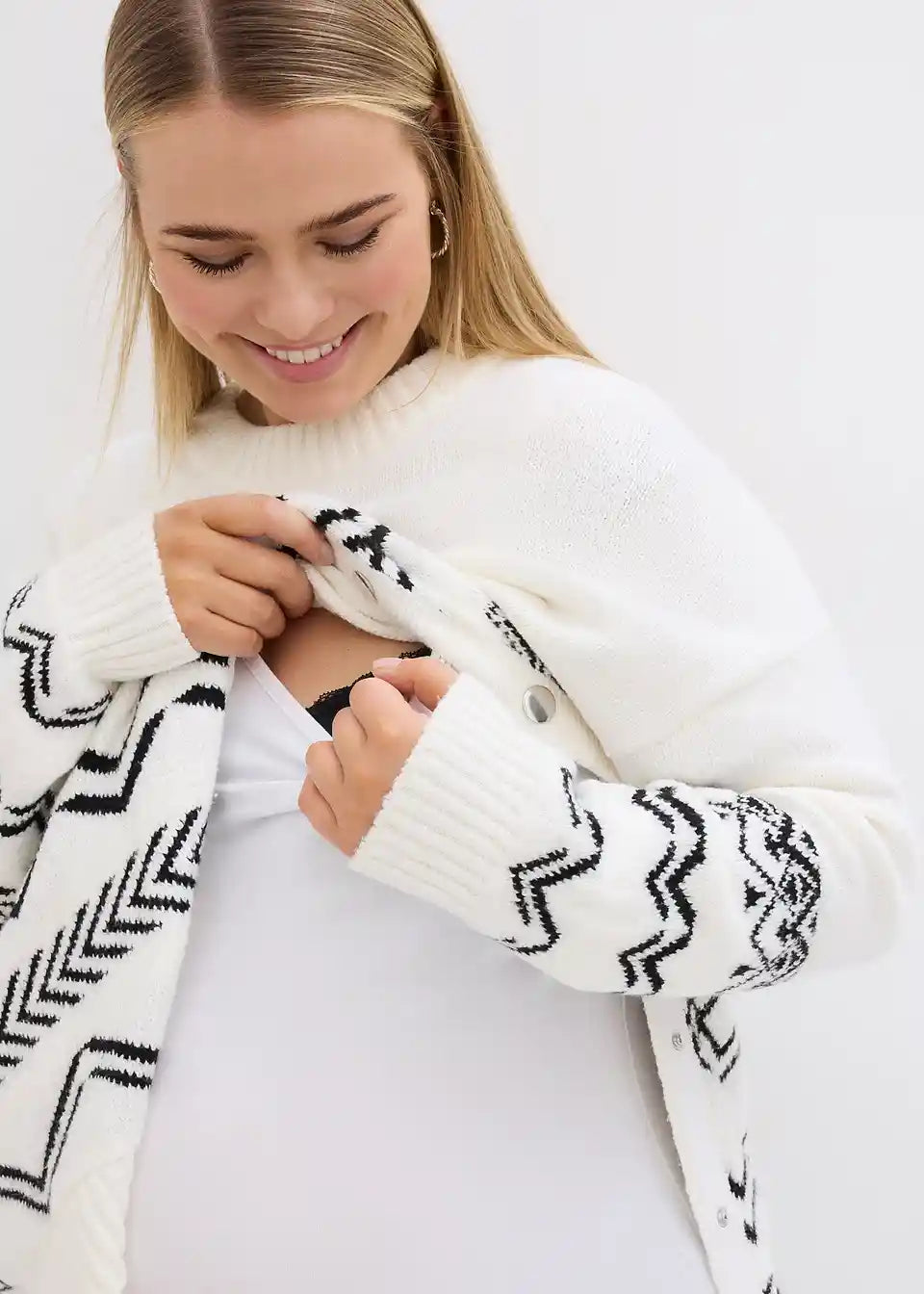 Mekani pulover za trudnice od mješavine pamuka s norveškim uzorkom. Dekorativni drukeri na oba bočna šava nude praktičnu i diskretnu funkciju za dojenje i mogu se koristiti za proširenje pulovera.