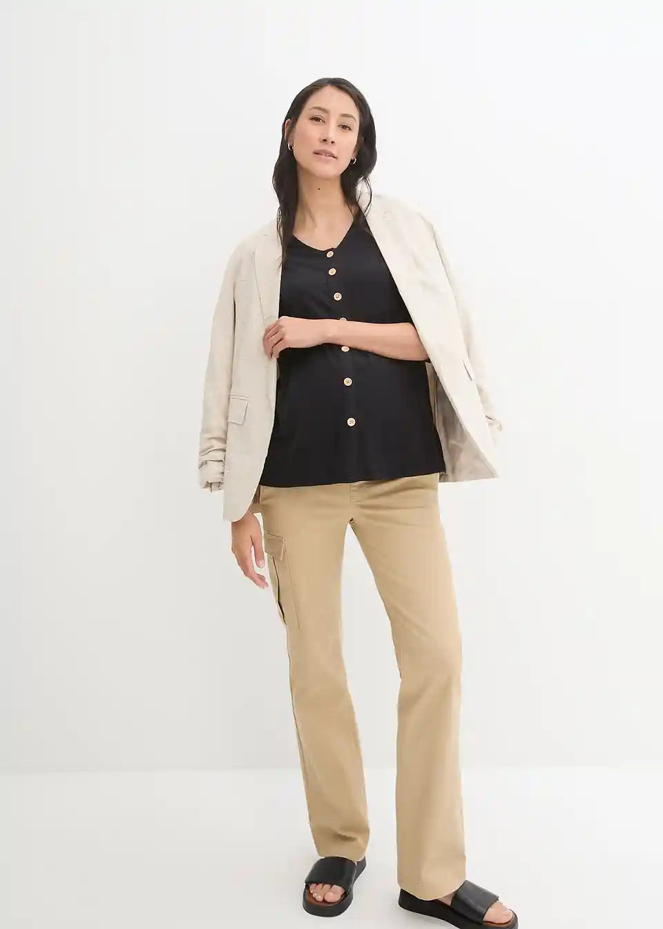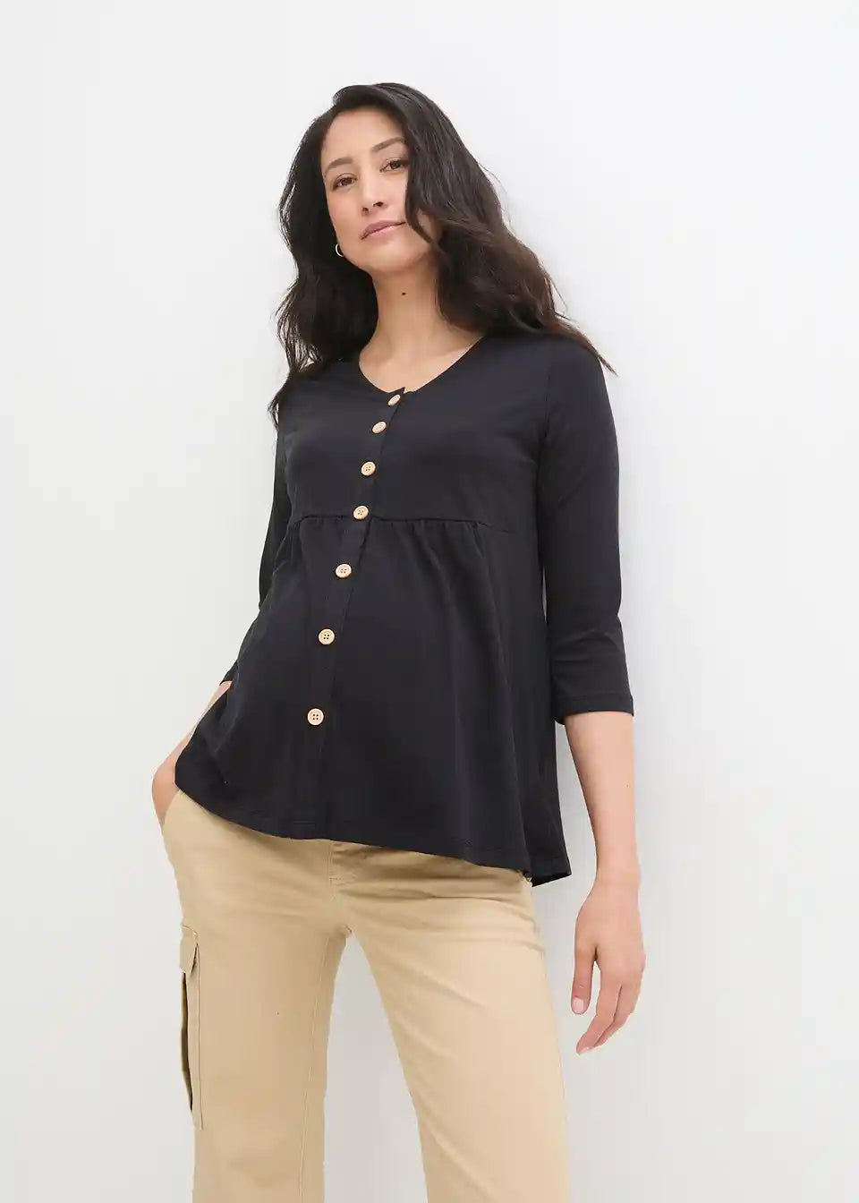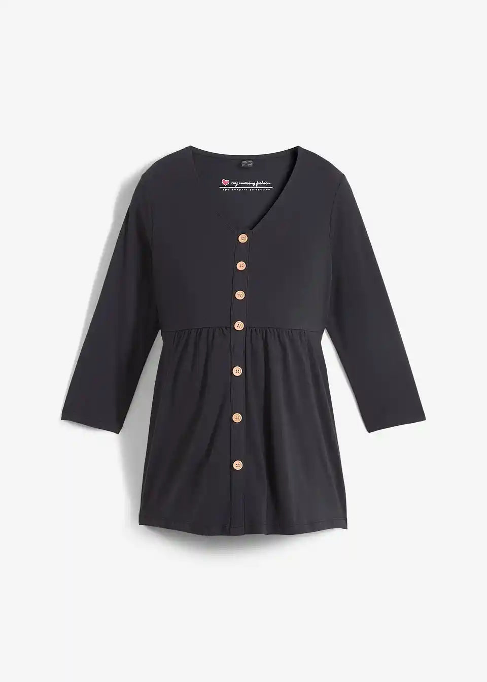 Mekana majčica za trudnice od elastičnog trikota od organskog pamuka. S okruglim izrezom i 3/4 rukavima. Dekorativni gumbi olakšavaju dojenje.