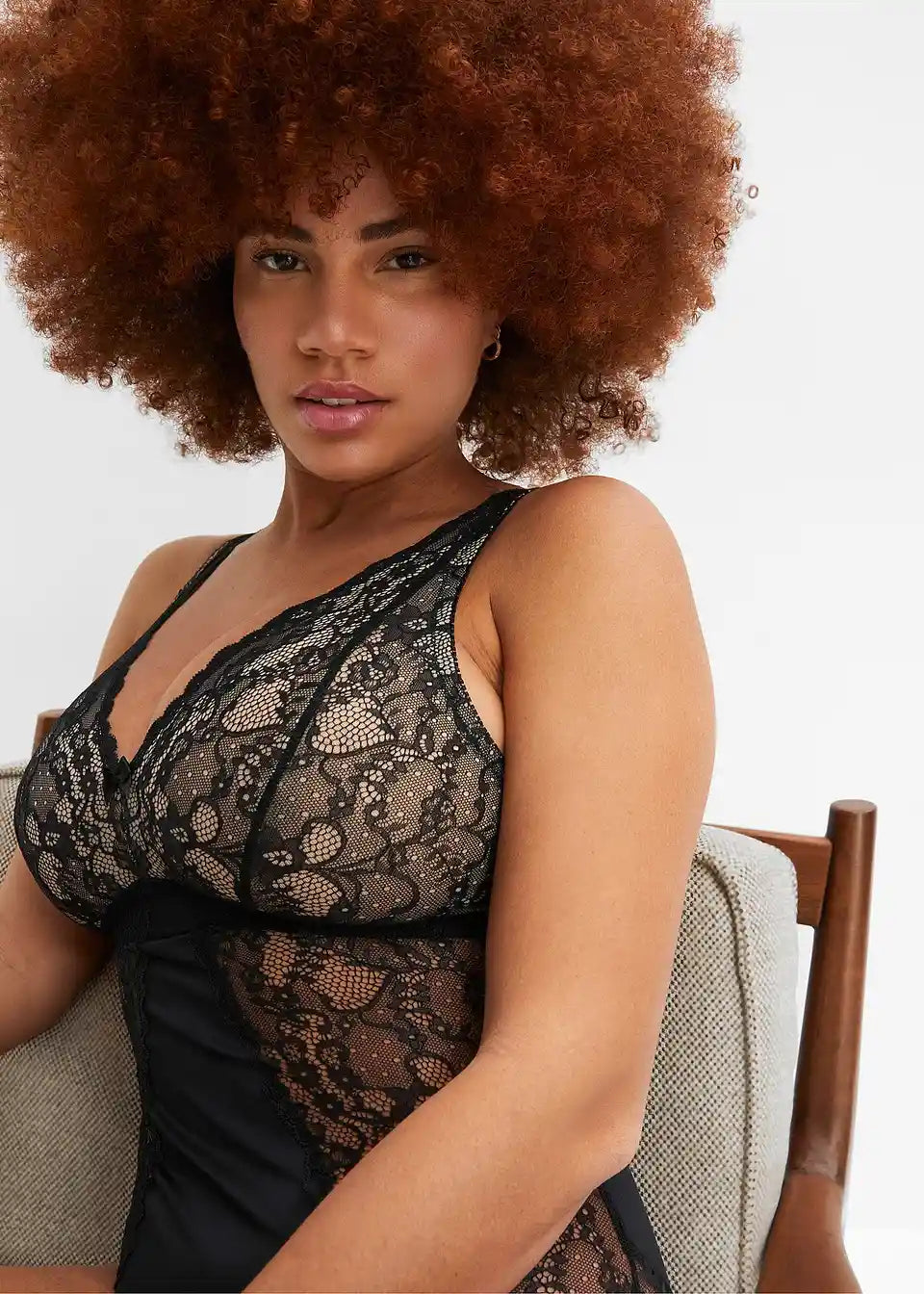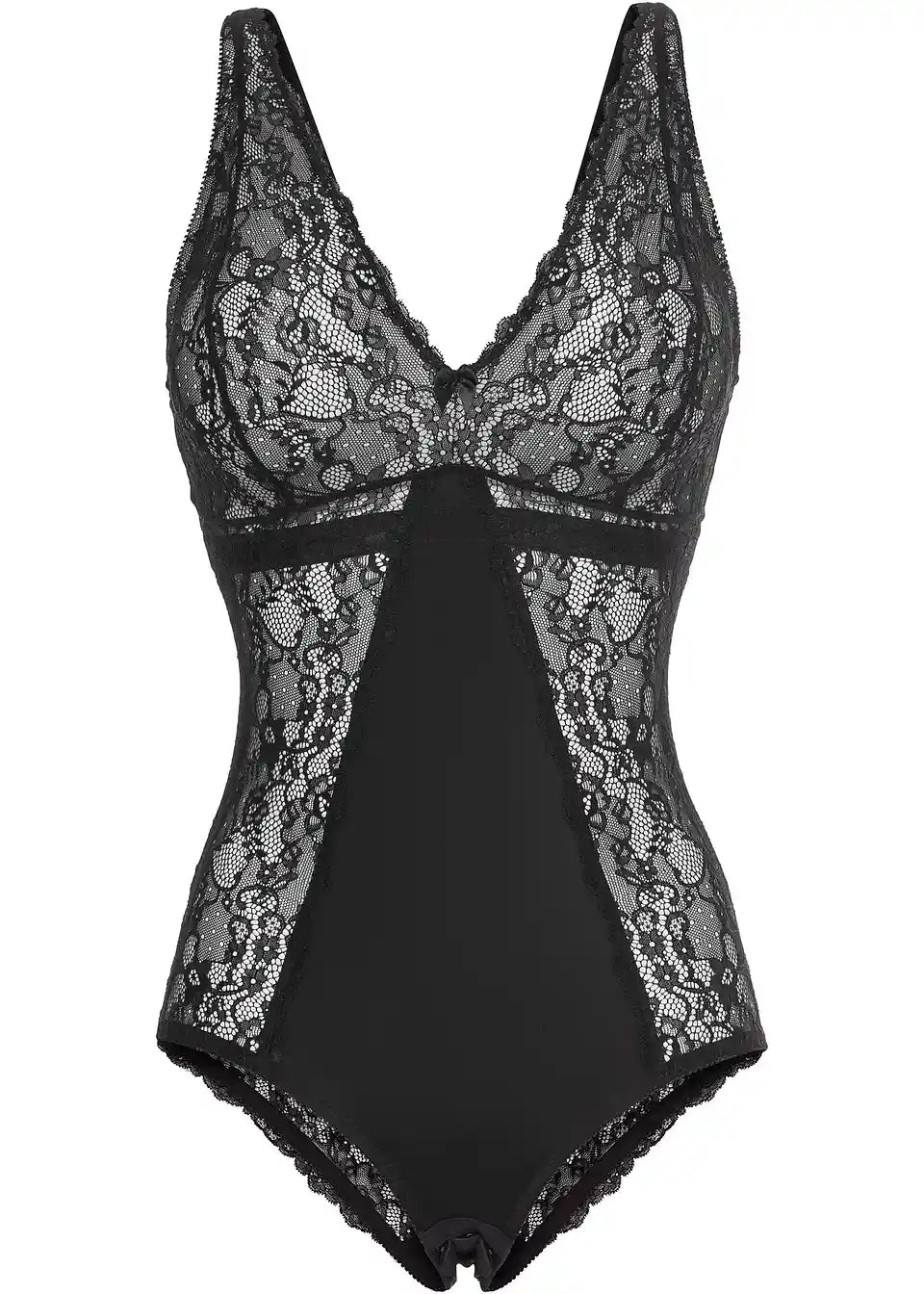 Ovaj elastični body marke bpc selection ugodno se prilagođava ženskim konturama. Otmeni jednodijelni odjevni predmet od fine čipke je bez žice i ima podesive naramenice. Na preponama se može otvoriti pomoću sitnih kukica i ima uložak od pamuka. Kod većih košarica naramenice i kopča su šire kako bi osigurali bolju udobnost.