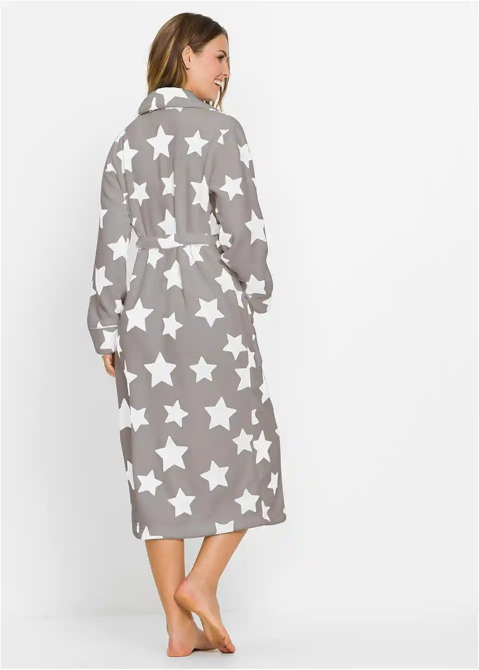 Ogrtač za kupanje izrađen je od flisaste Fleece tkanine i pruža udoban osjećaj nošenja. Ovaj lijepi model dolazi u klasičnom kroju s pojasom za vezanje i dva naprijed našivena džepa. Uzorak zvijezda dodaje moderan naglasak. Kao udoban pratitelj tijekom odlaska u saunu, ogrtač impresionira.