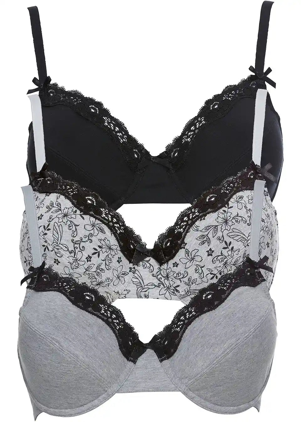 Tri atraktivna grudnjaka s žicom marke bpc nude ugodnu udobnost nošenja zahvaljujući uravnoteženoj mješavini pamuka i elastana. Istovremeno, ugrađena žica pruža optimalnu potporu. Čak i bez podstave, grudi se formiraju u svoju prirodnu obliku. U paketu se nalaze dva različita jednobojna grudnjaka. Uz to, jedan grudnjak je ukrašen očaravajućim cvjetnim uzorkom. Svi grudnjaci su na gornjem dijelu košarice ukrašeni lijepom, elastičnom čipkom.