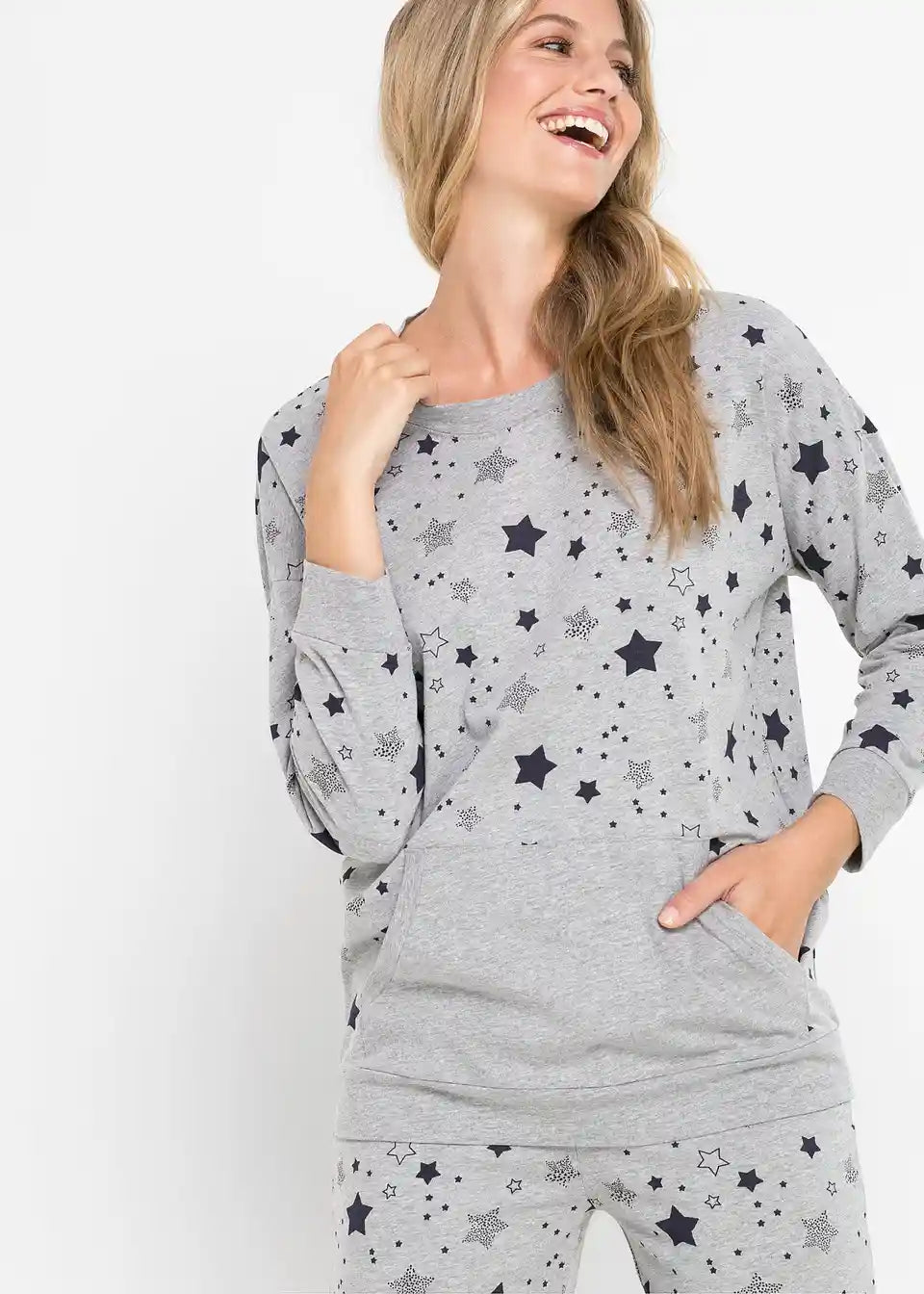 Materijal ovog udobnog kućnog odijela je zahvaljujući Peach-touch efektu iznimno mekan i svilenkast. Pidžama impresionira svojim modernim printom zvijezda.