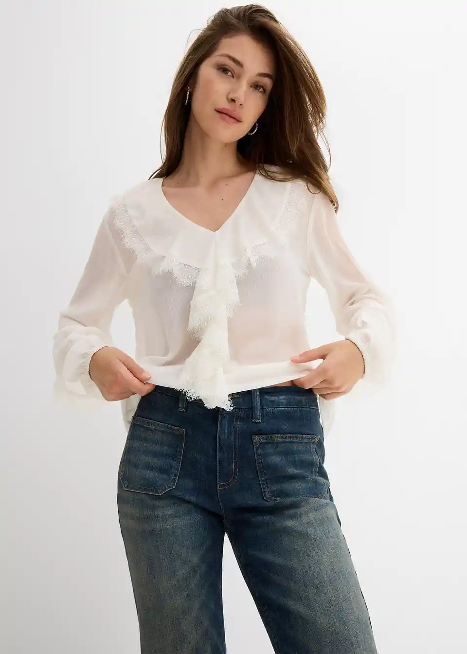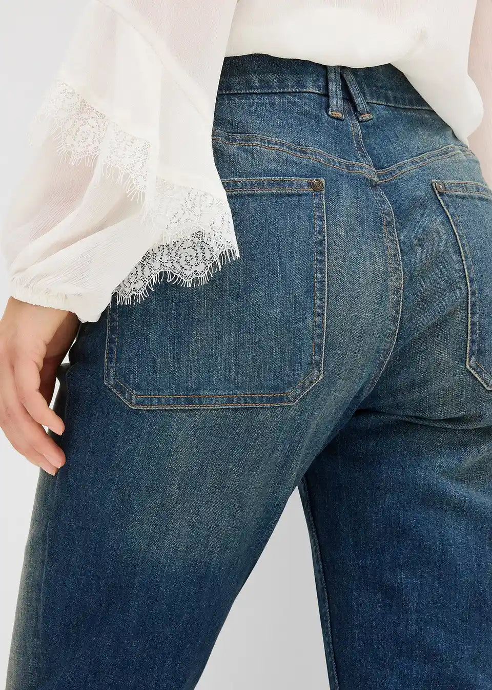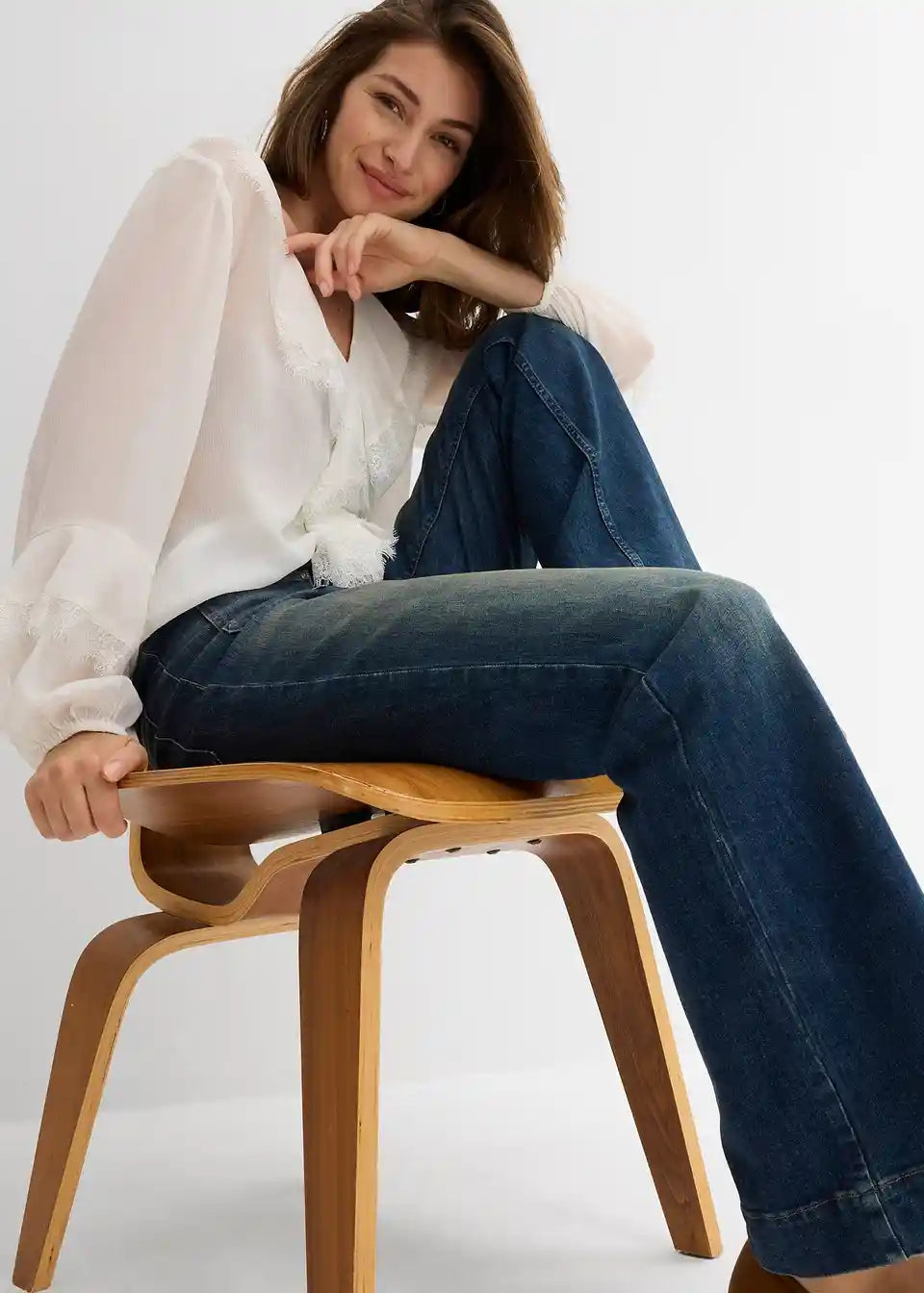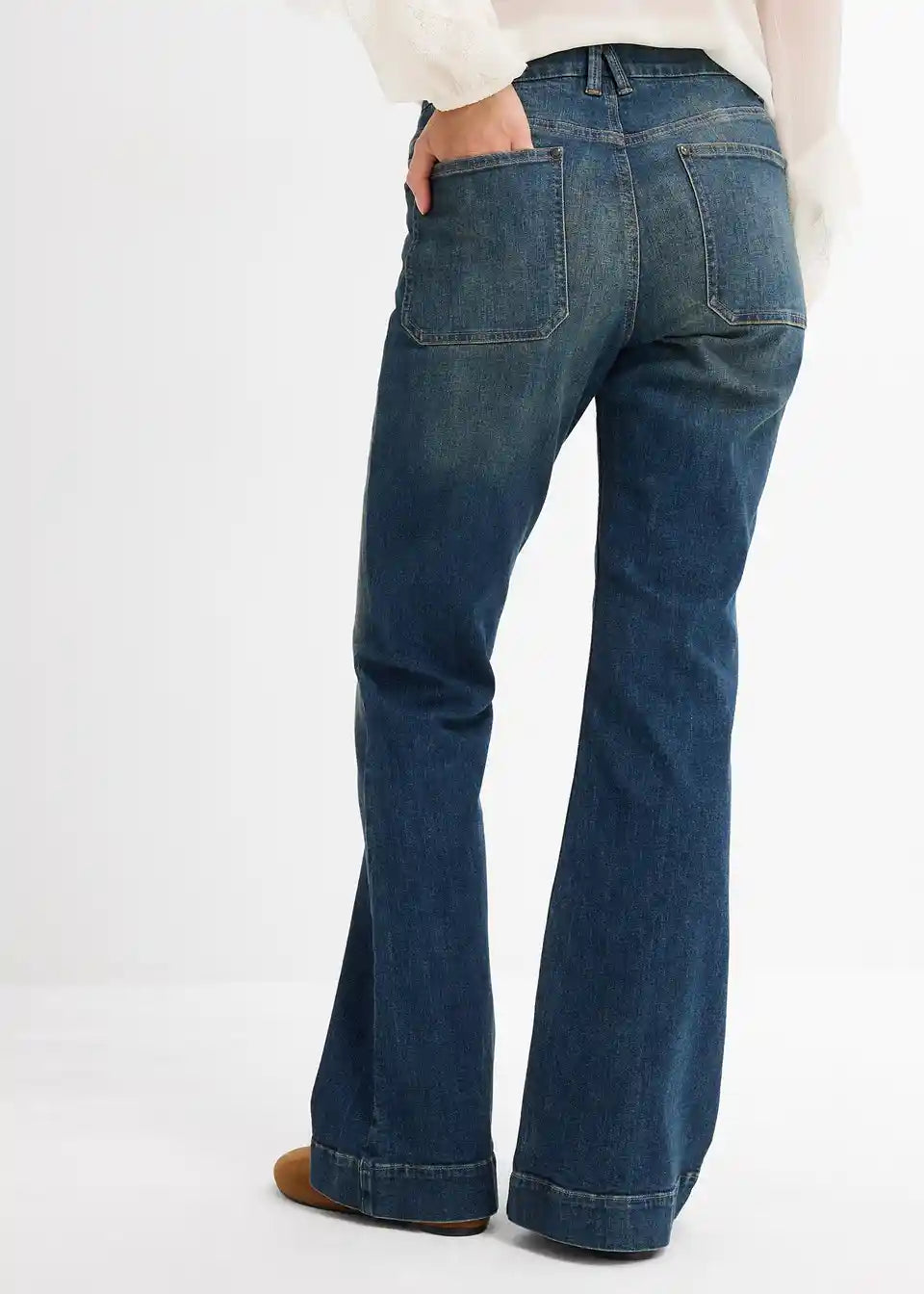 Flared 5-džepne traperice od čvrstog pamučnog trapera koji je u početku malo krut, ali nošenjem postaje mekši i opušteniji. Visok struk sa Zip Fly zatvaračem i gumbom. Dulja dužina za lagani stacking-efekt na dnu. Ove traperice zahvaljujući ispranom završnom sloju imaju moderan used-efekt. Lagano otpuštanje boje tijekom nošenja i pranja karakteristično je za ove traperice. Unutarnja duljina nogavice u veličini 42 cca 80,5 cm, perivo u perilici.