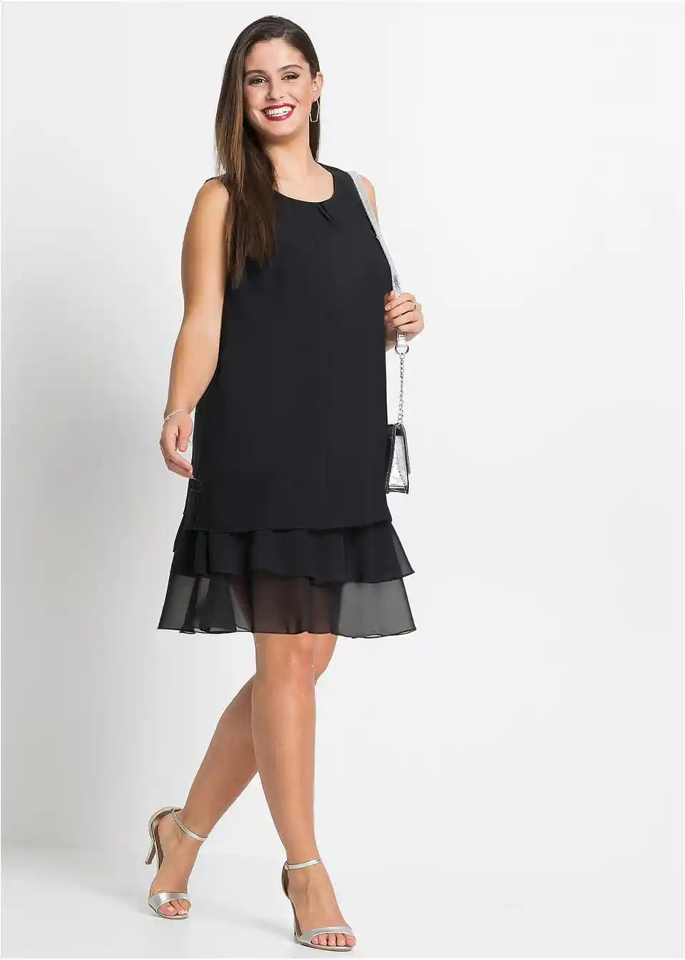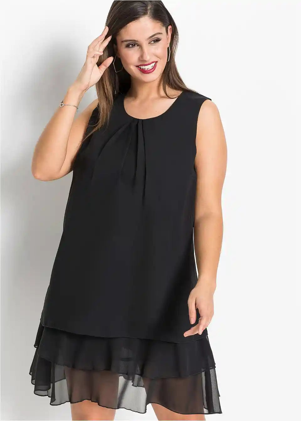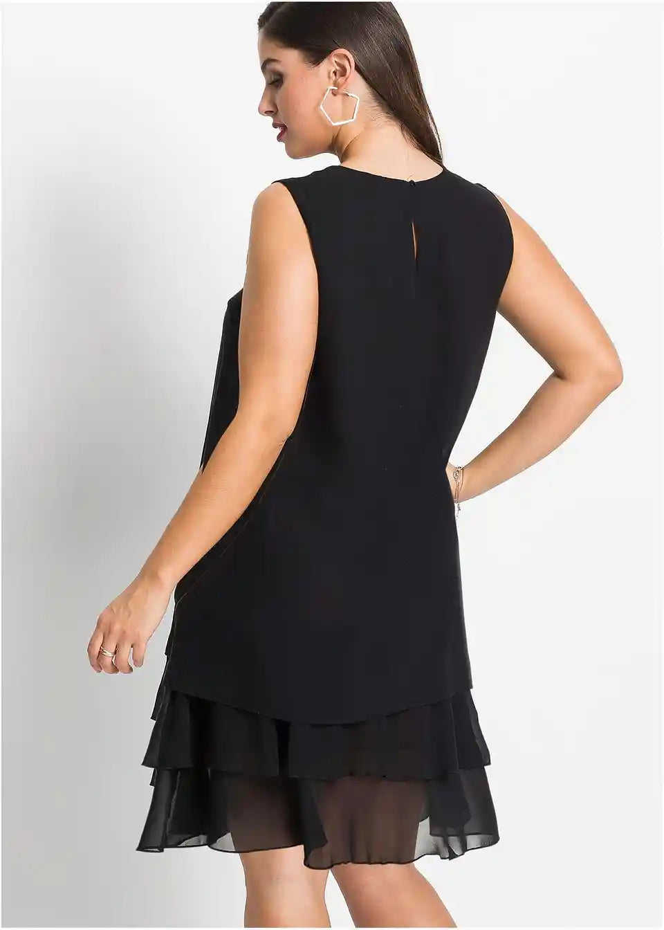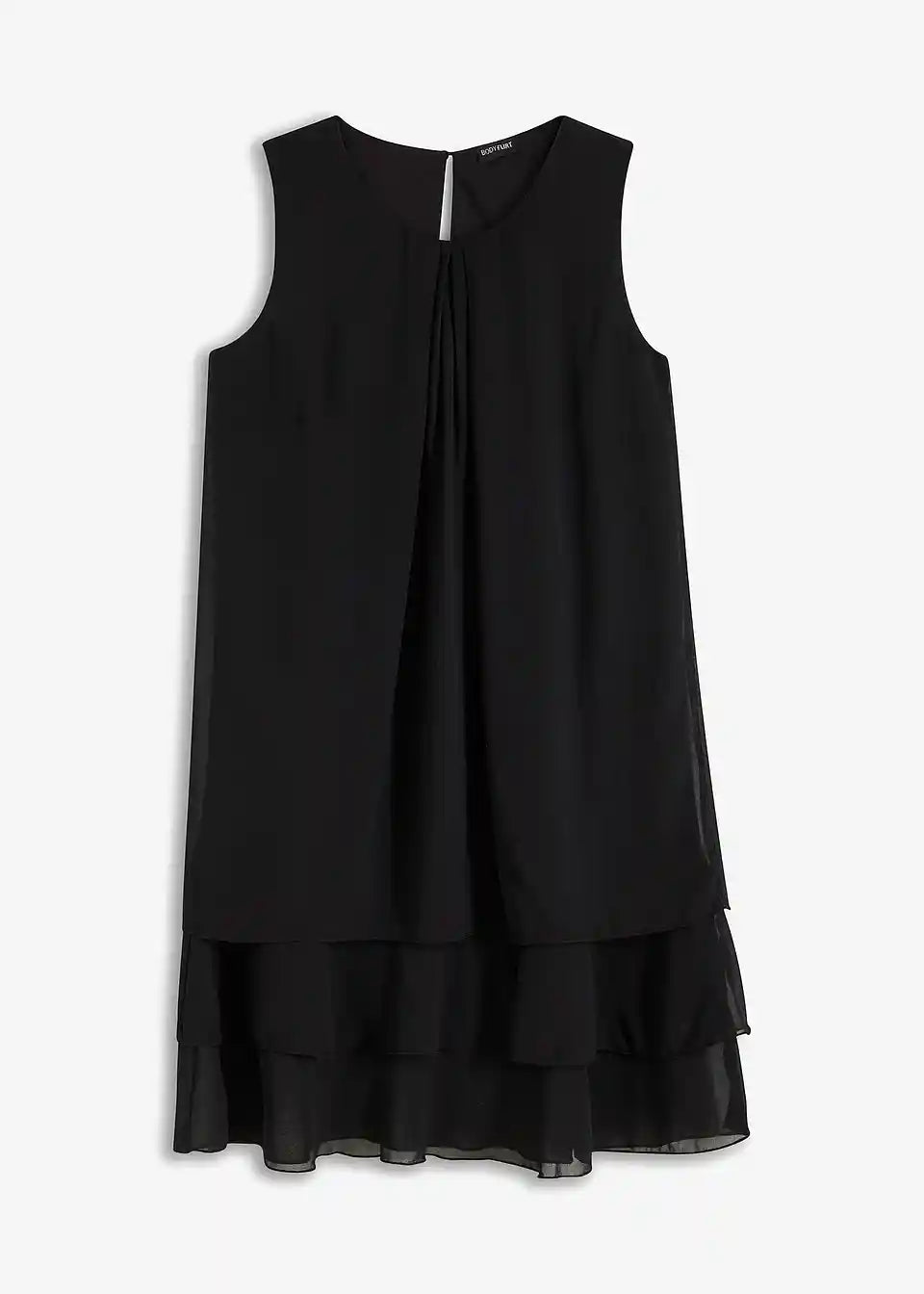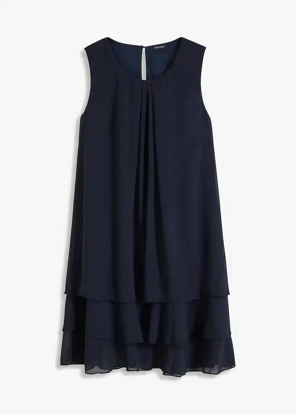 Fini detalji rafinirano naglašavaju jasne linije ovog modela. Tu se ubrajaju mali nabori na okruglom izrezu, koji prelaze u lepršavi materijal. Višeslojni volani na rubu daju romantični izgled šifonskoj haljini. A-kroj nježno prekriva tijelo. Naušnice i narukvice ukrašene svjetlucavim kamenčićima, kao i diskretne salonke, čine privlačnu kombinaciju s ovom šifonskom haljinom bez rukava iz kolekcije BODYFLIRT.