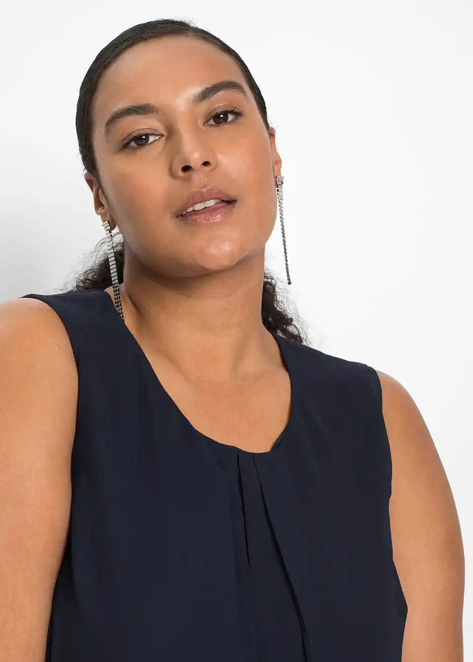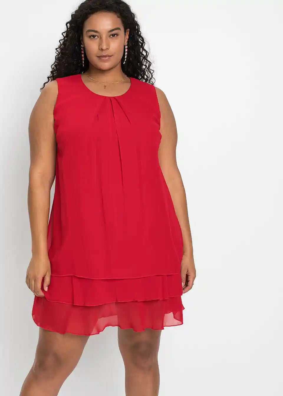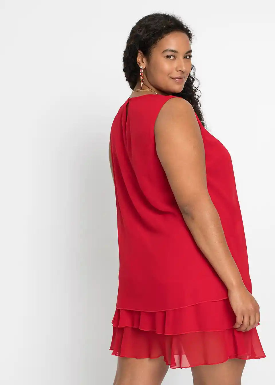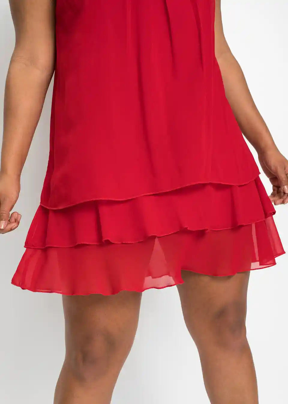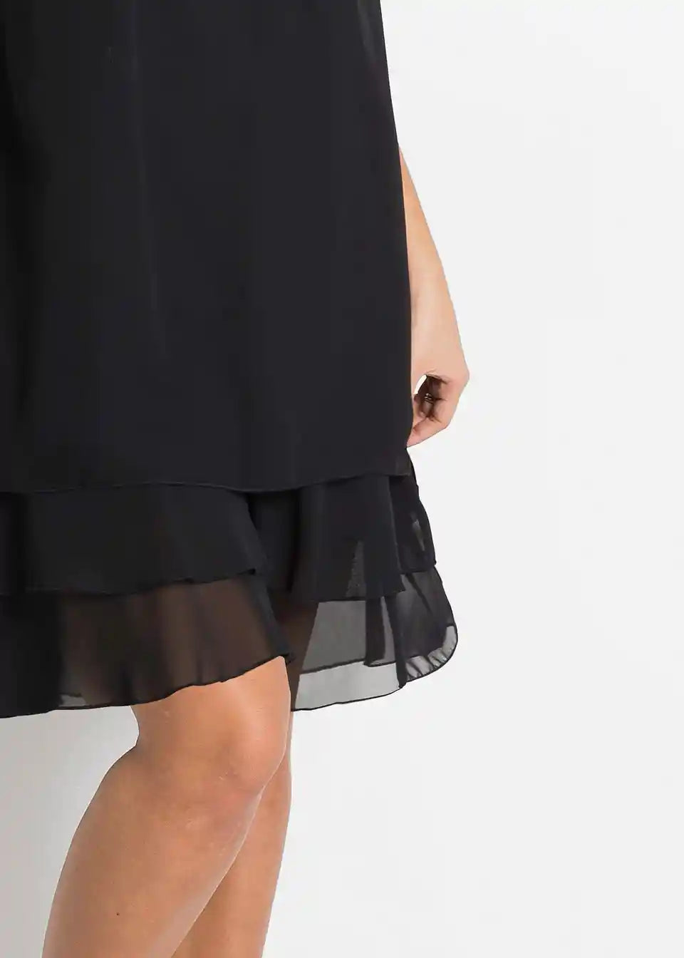 Fini detalji rafinirano naglašavaju jasne linije ovog modela. Tu se ubrajaju mali nabori na okruglom izrezu, koji prelaze u lepršavi materijal. Višeslojni volani na rubu daju romantični izgled šifonskoj haljini. A-kroj nježno prekriva tijelo. Naušnice i narukvice ukrašene svjetlucavim kamenčićima, kao i diskretne salonke, čine privlačnu kombinaciju s ovom šifonskom haljinom bez rukava iz kolekcije BODYFLIRT.