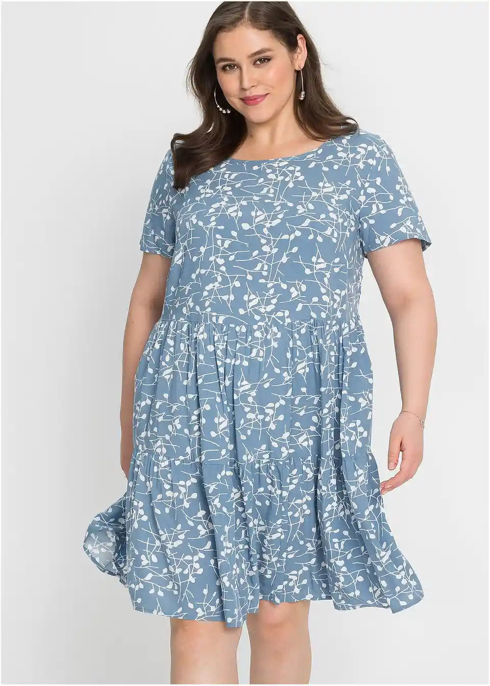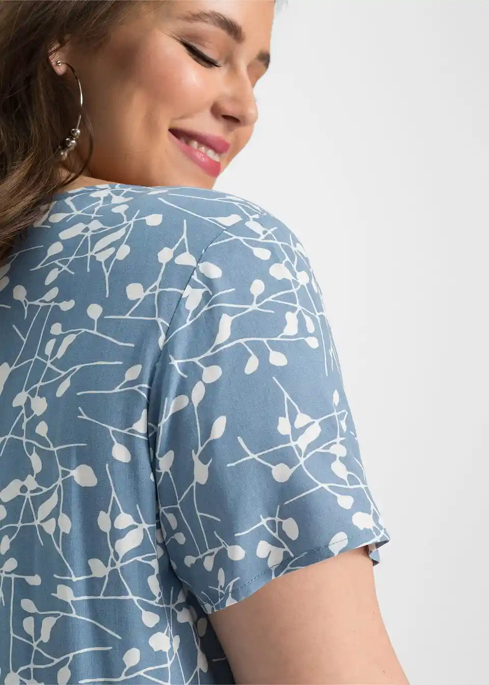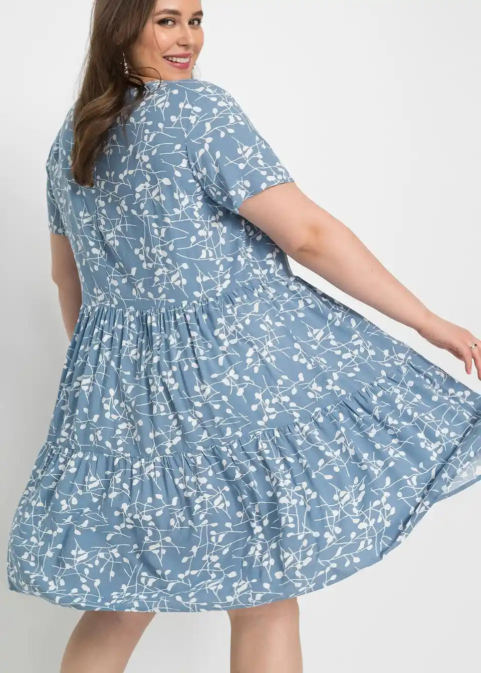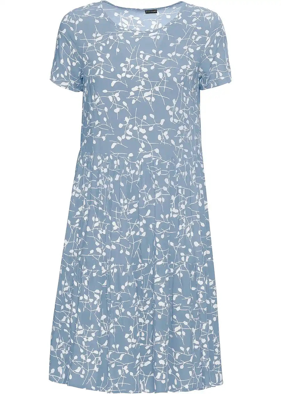 Tiskana haljina s okruglim izrezom koja seže tik do koljena. Ležeran kroj i mali nabori na šavovima stvaraju efekt prikrivanja i djeluju vrlo ženstveno.