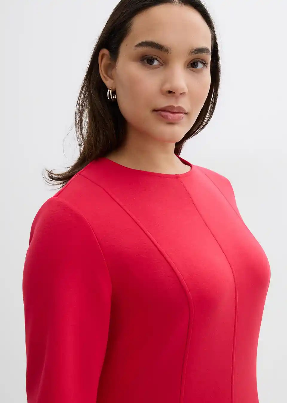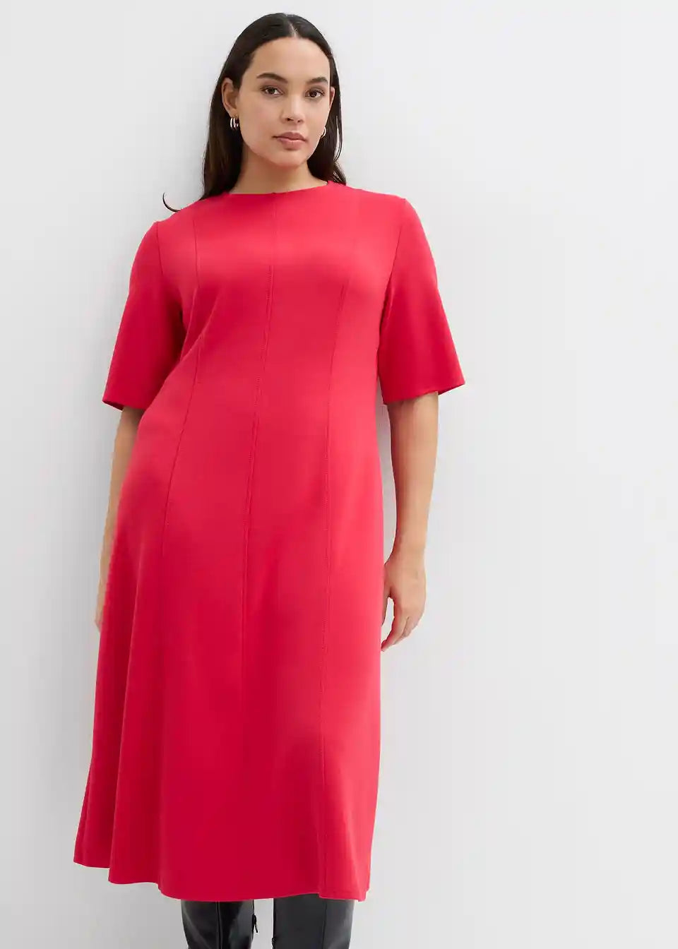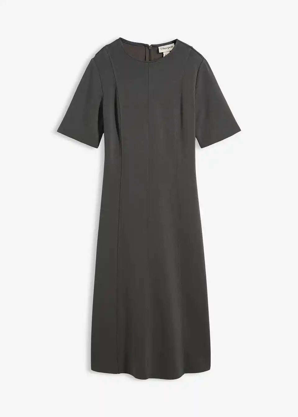Midihaljina s vertikalnim prešivima i voluminoznom, zvonolikom suknjom. Skriveni patentni zatvarač straga.