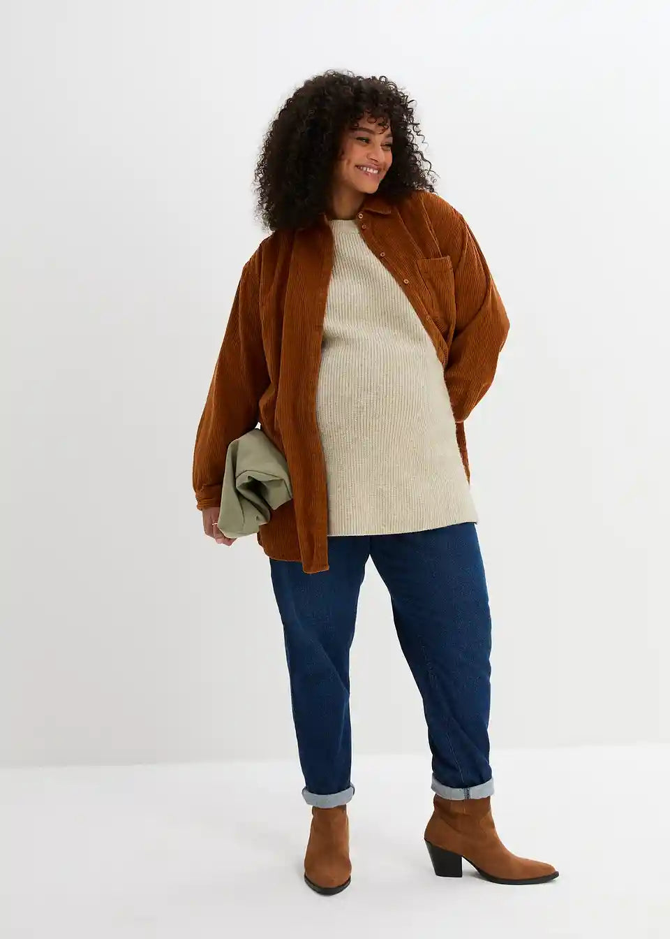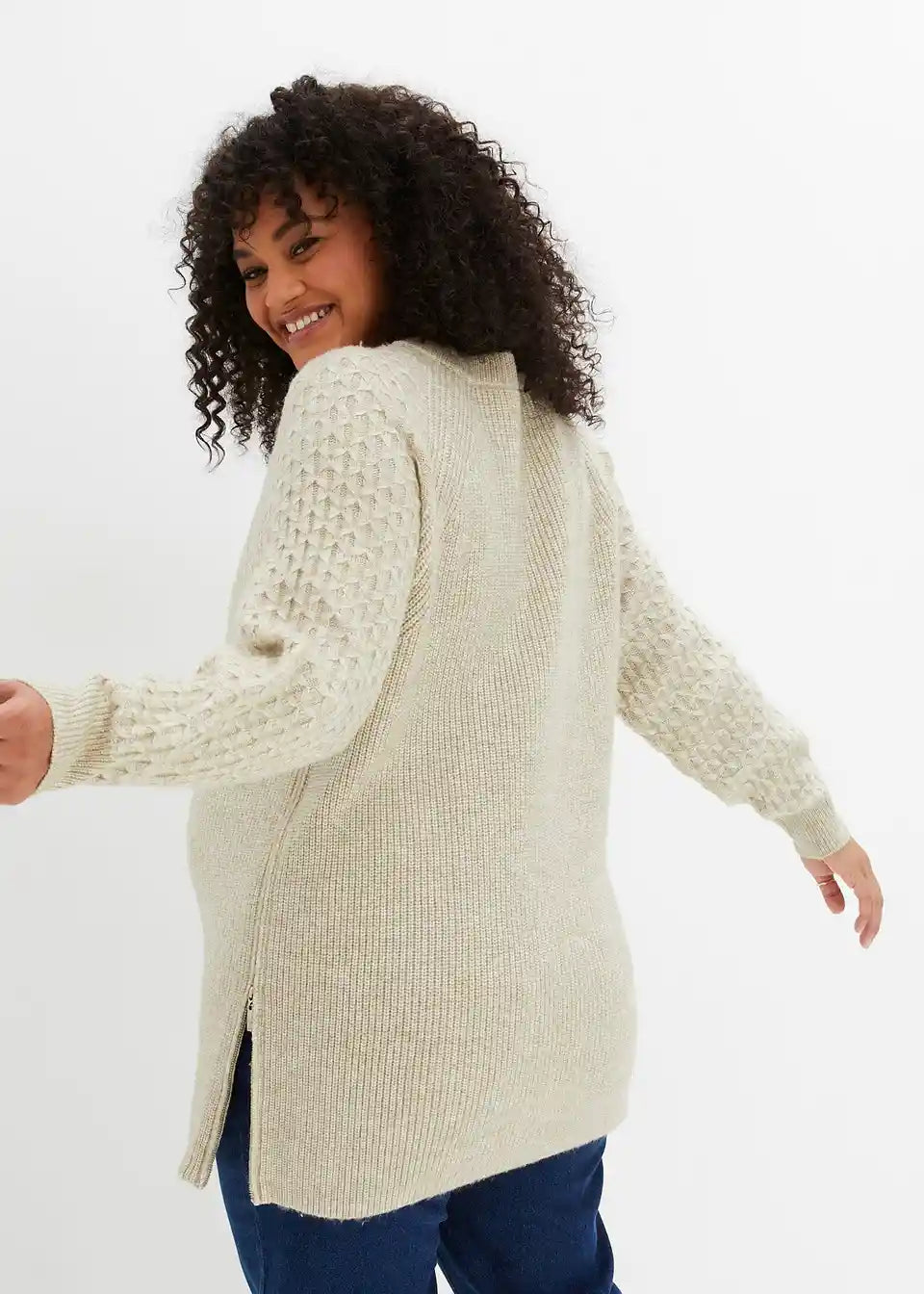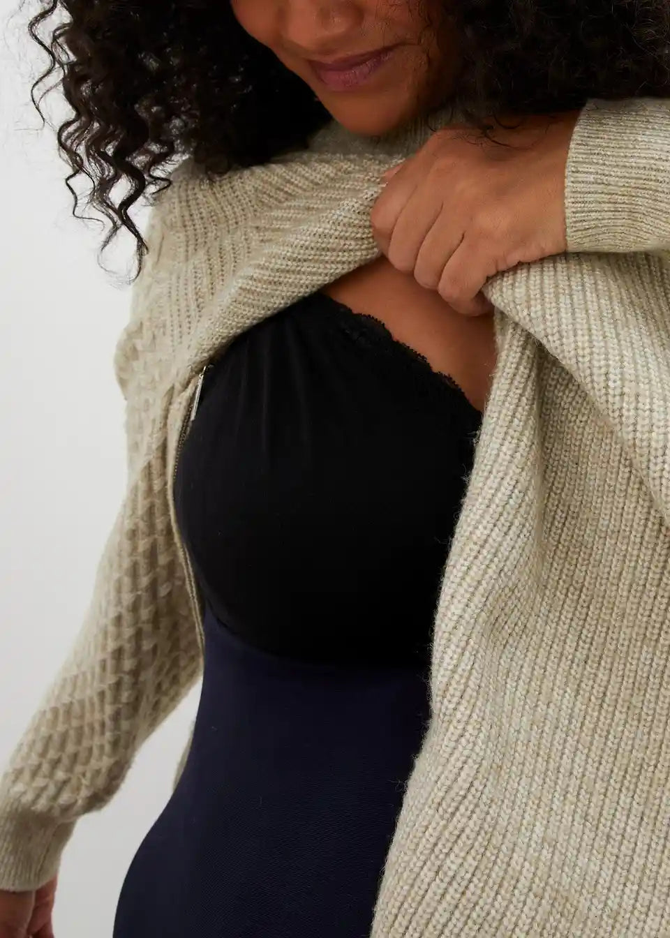 Mekan pleteni pulover za trudnoću i razdoblje dojenja. Na bočnim stranama nalaze se otvori s patentnim zatvaračem koji omogućuju udobno dojenje za majku i dijete.