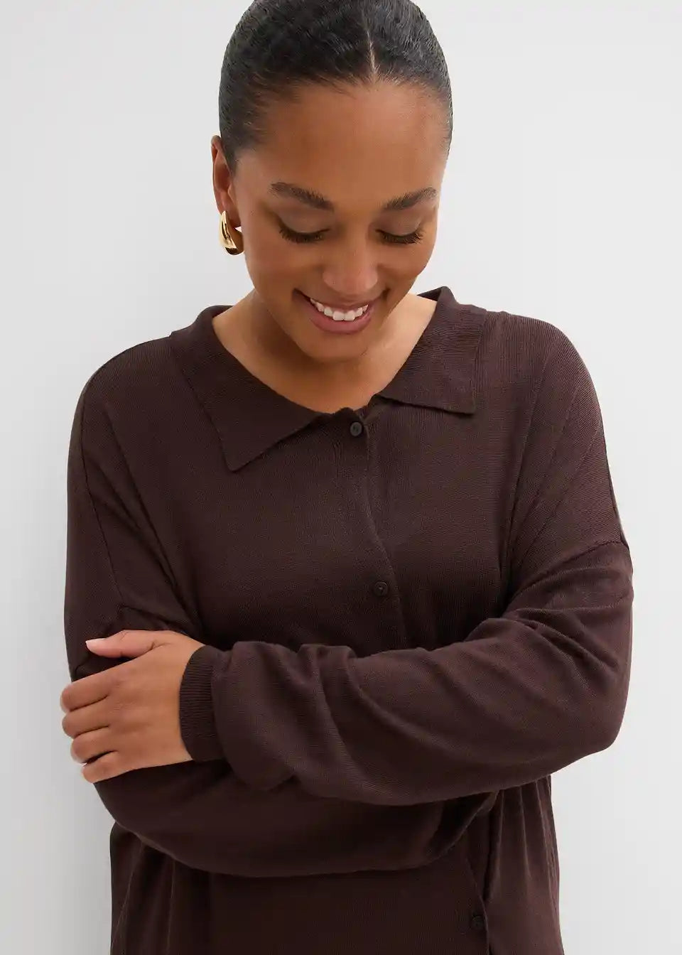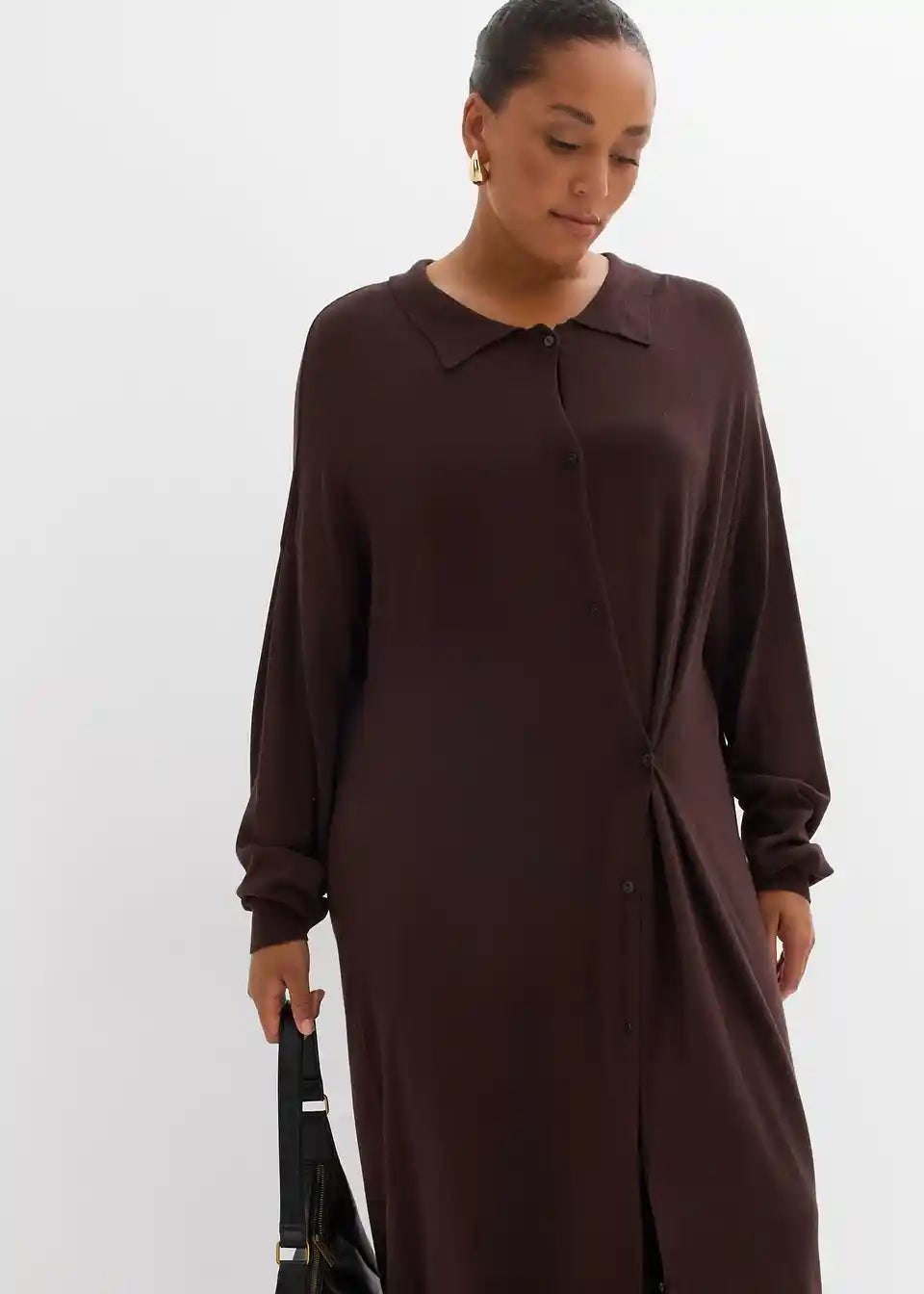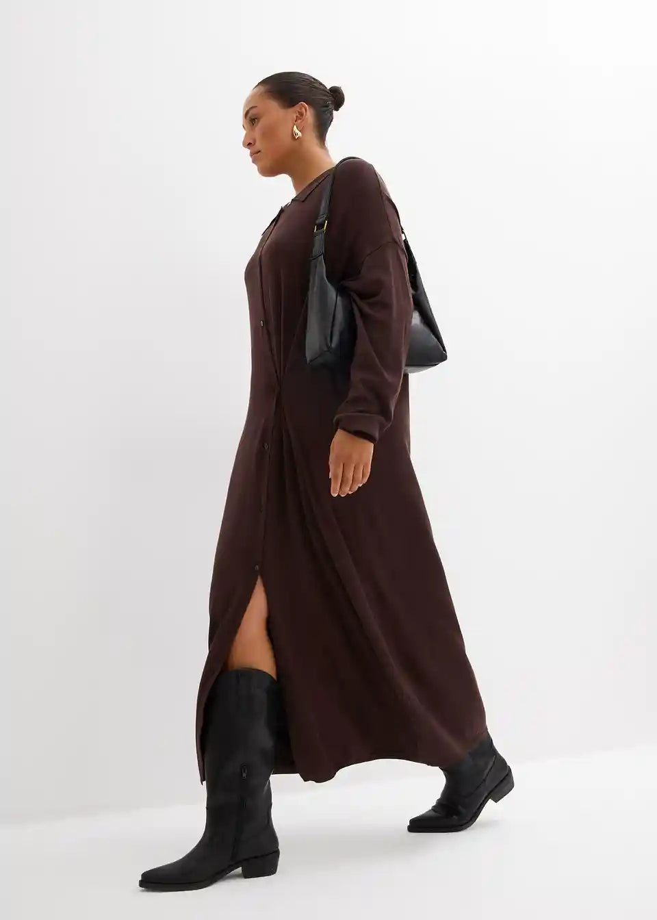 Fino pletena haljina s otvorenim ovratnikom, dugim rukavima i kopčanjem s gumbima sprijeda