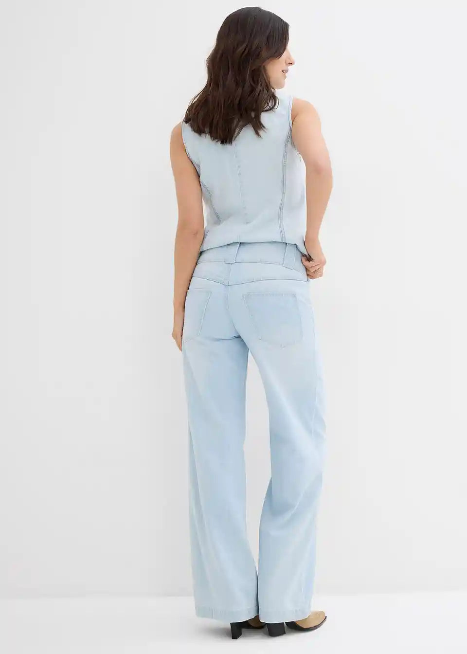 Široke 5-džepne traperice od supermekog, laganog trapera. Ležeran kroj sa širokim pojasom. Visoki struk. Unutarnja duljina nogavice za veličinu 42 cca 78,5 cm, perivo u perilici