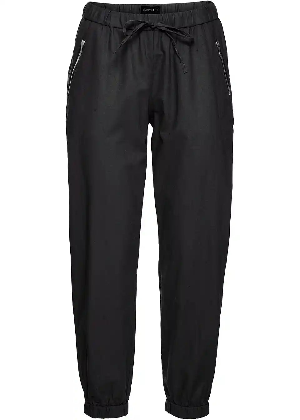 Široki, lijepo krojeni kroj daje ovim 7/8 lanenim hlačama od BODYFLIRT vrlo ženstven izgled. Široke elastične manžete na rubu nogavica i djelomično elastičan pojas s vezicom na struku osiguravaju izvrsno pristajanje i atraktivan izgled. Dekorativni detalji uključuju bočne džepove, koji se mogu zatvarati patentnim zatvaračem. Hlače se mogu kombinirati s majicama i bluzama u različitim odjevnim kombinacijama za ured i svakodnevnicu.