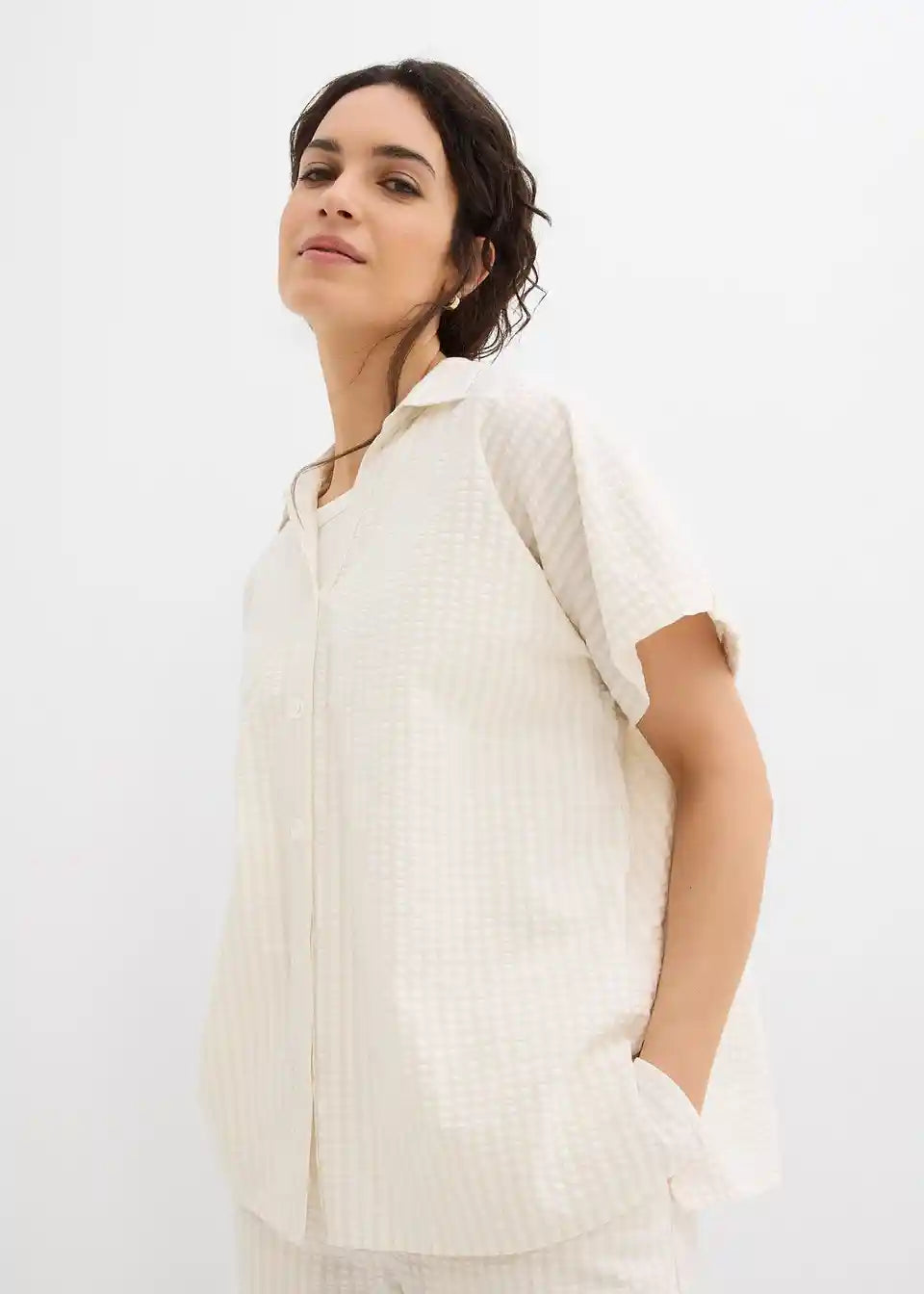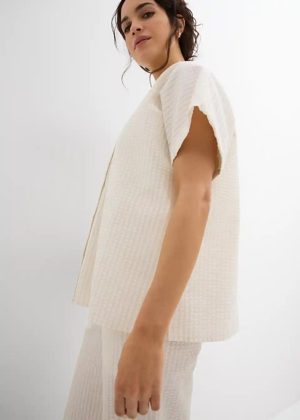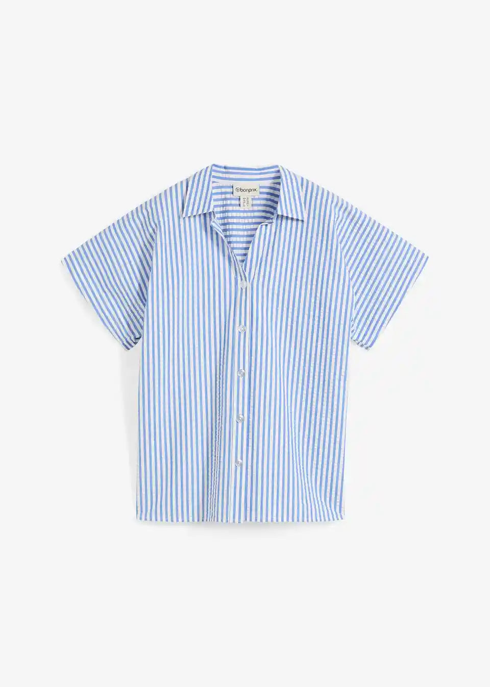 Košulja s kratkim rukavima od laganog strukturiranog materijala s kopčanjem na gumbe. Široki kroj.