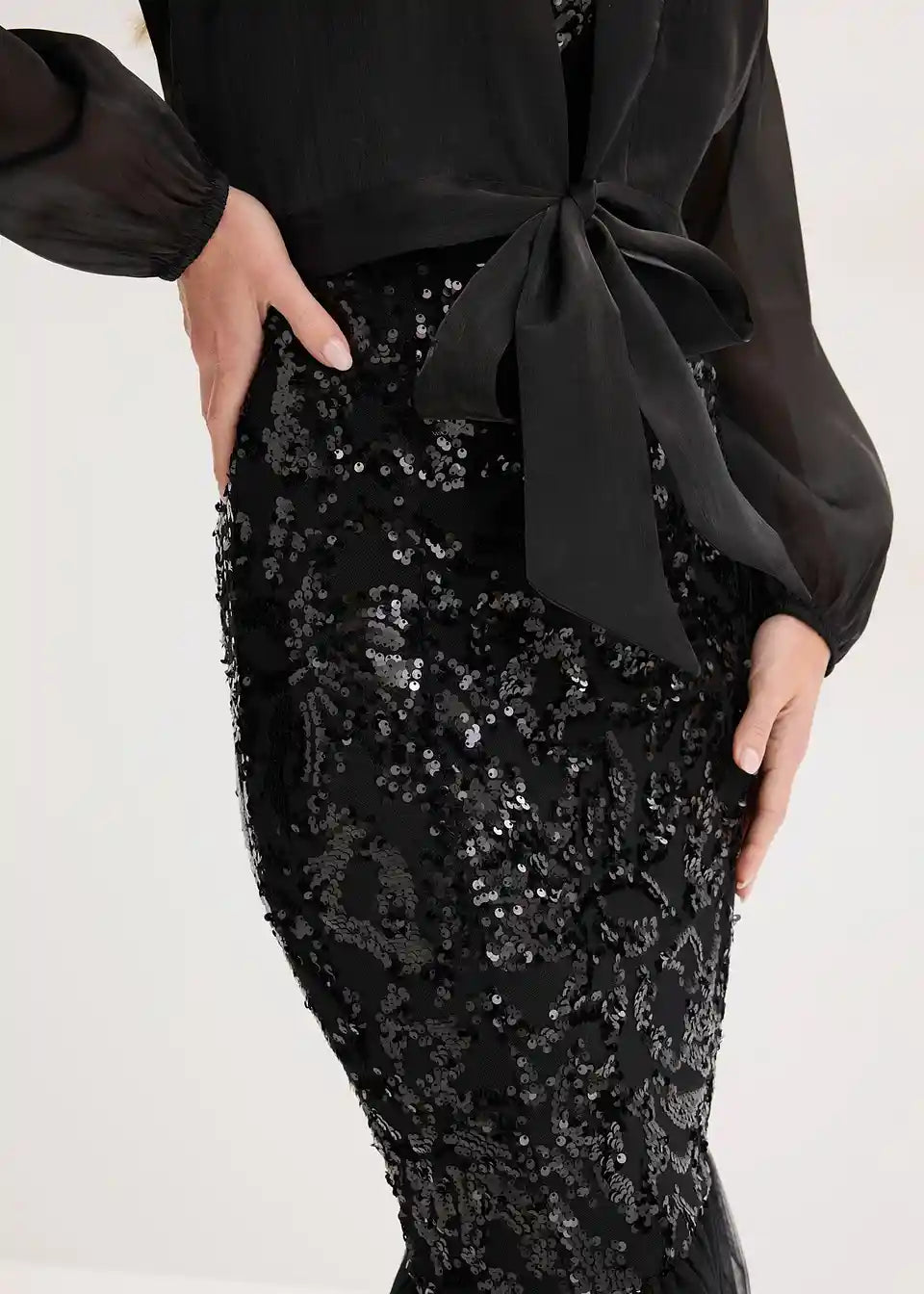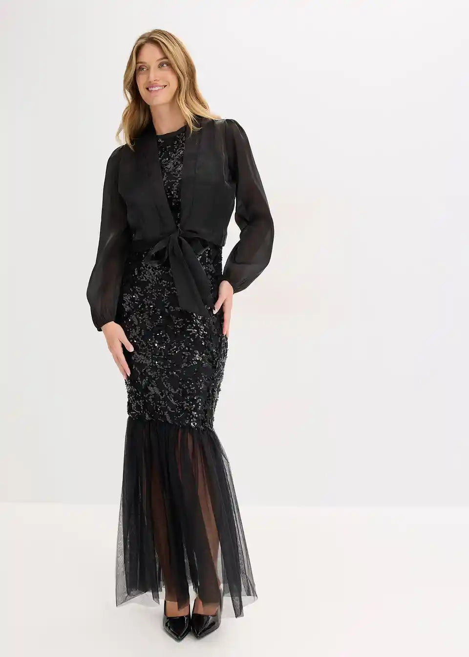 Moderan i ženstven: bolero od sjajnog tila s detaljem za vezanje i balon rukavima