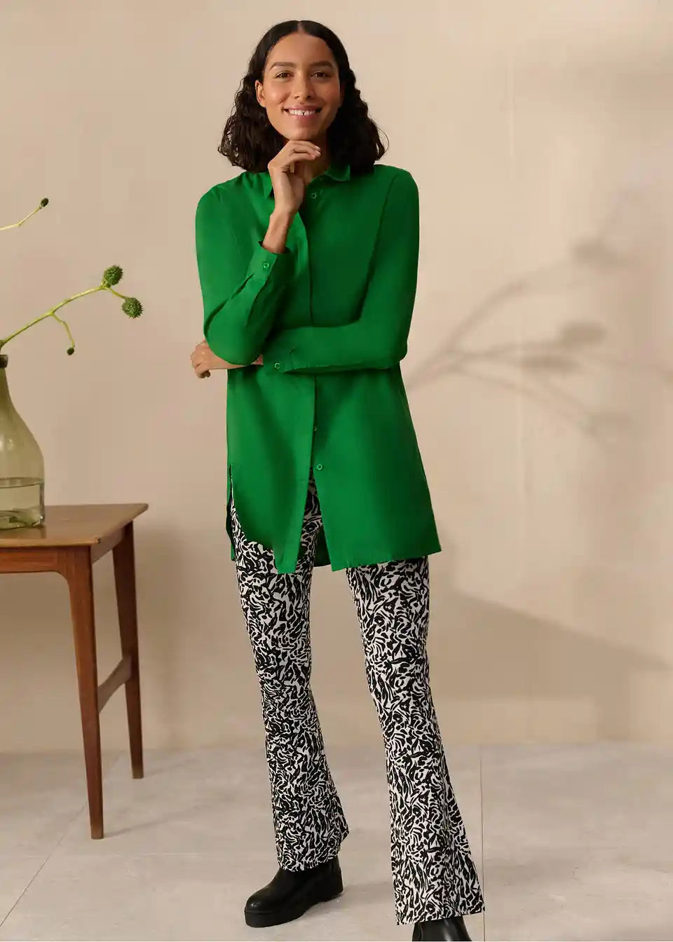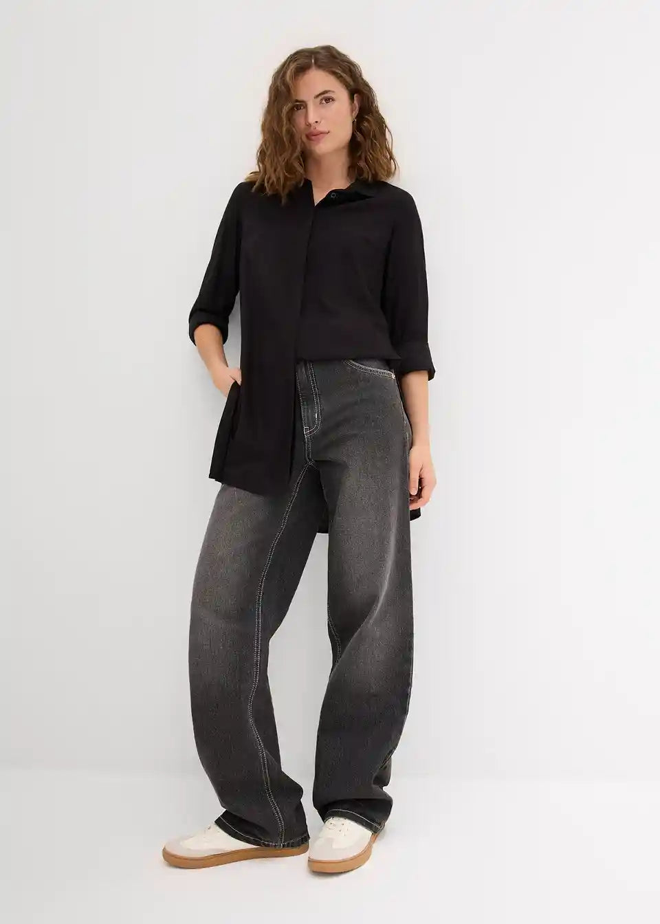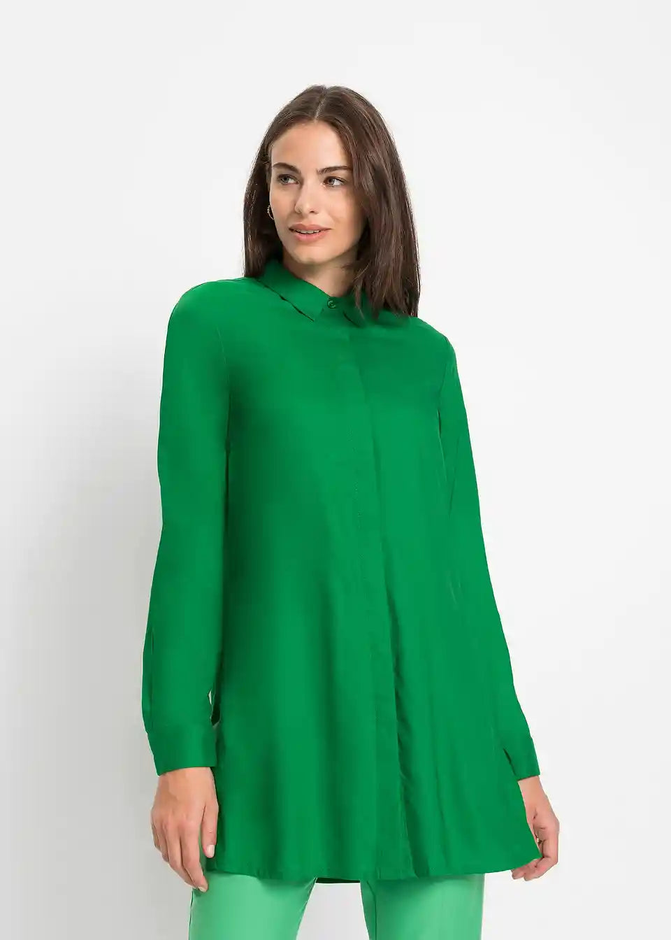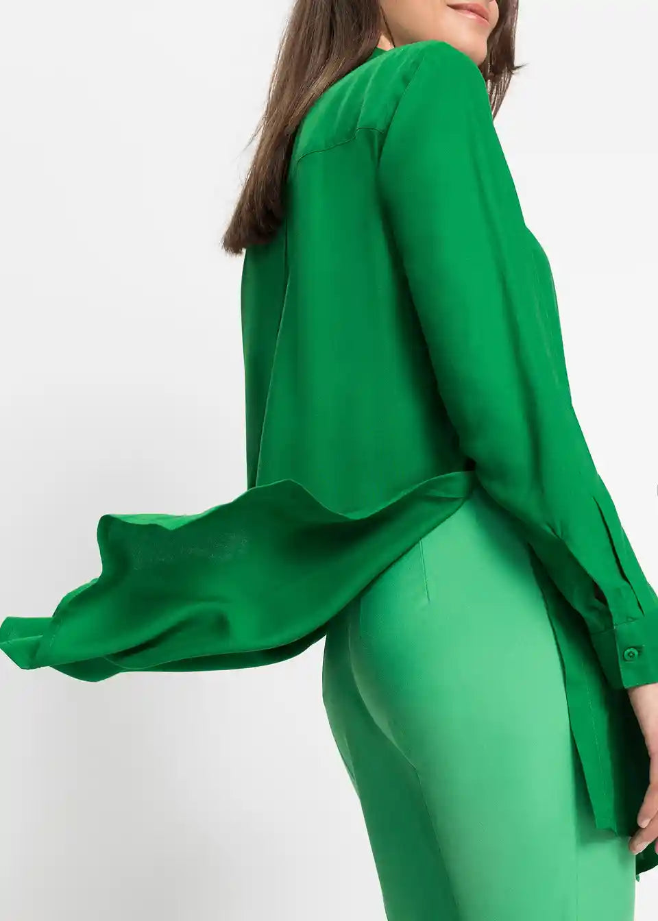 Moderna duga bluza s atraktivnim detaljem proreza i skrivenim kopčanjem na gumbima.