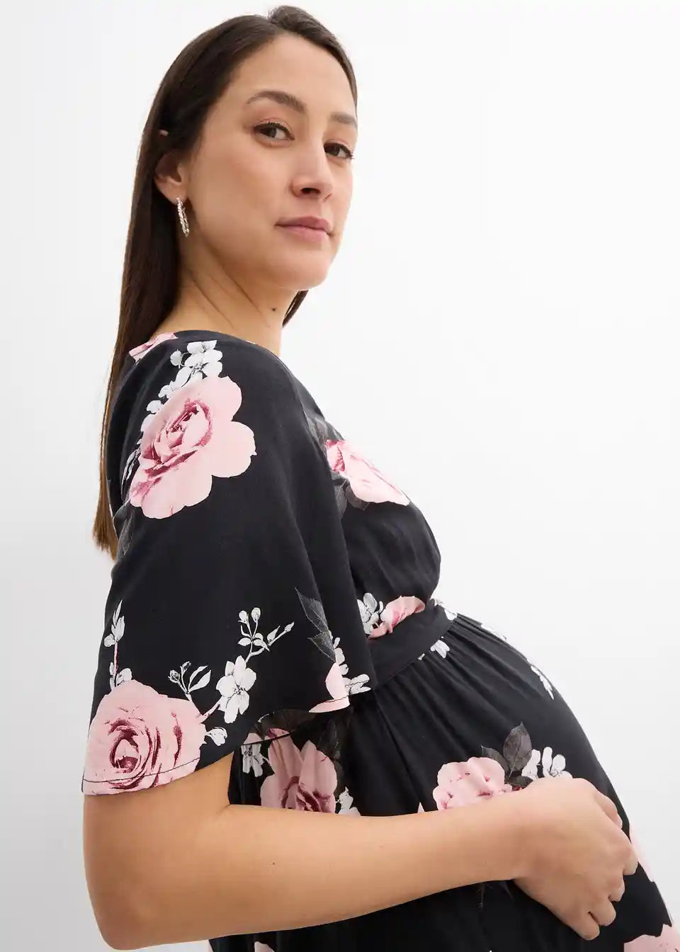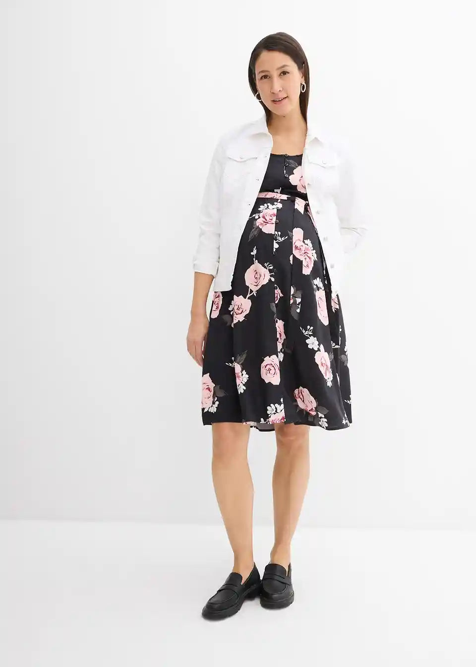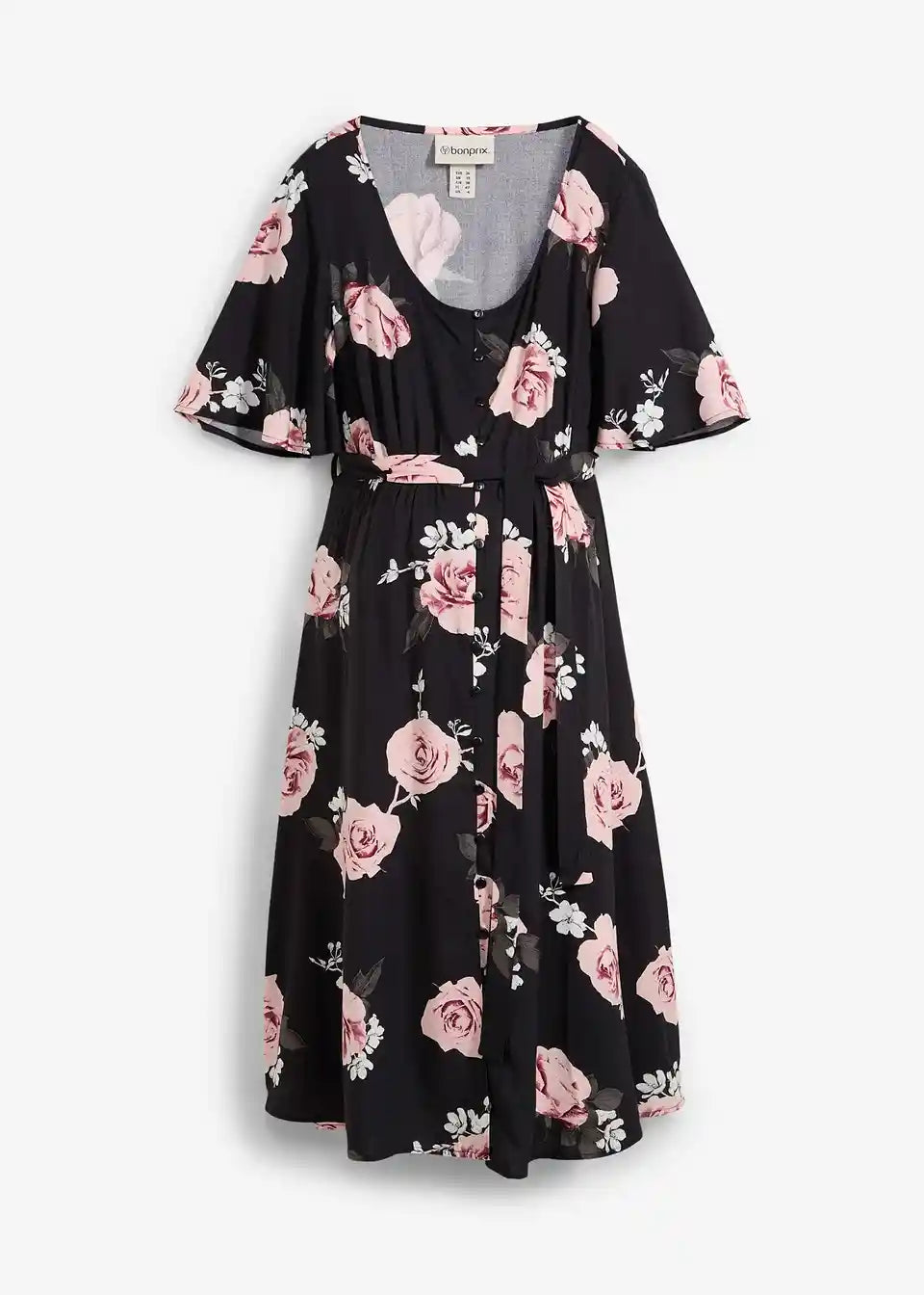 Haljina do koljena od lepršave viskoze s lijepim okruglim izrezom i širokim rukavima. Cijeli red gumba sprijeda omogućuje jednostavno dojenje i udobno oblačenje/izlačenje. Meki elastični pojas u struku i odvojivi pojas na vezanje osiguravaju individualno pristajanje.