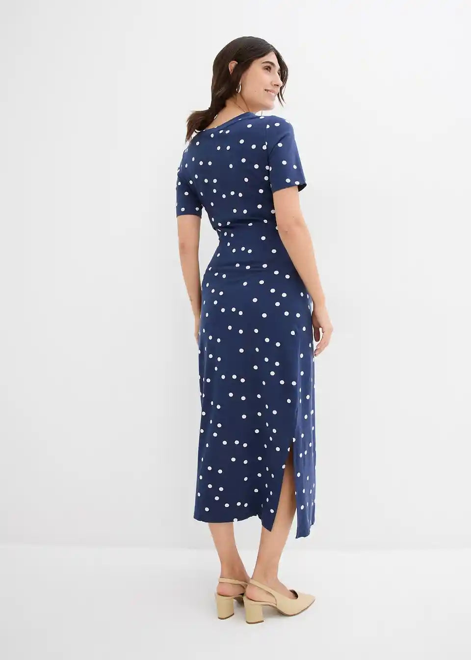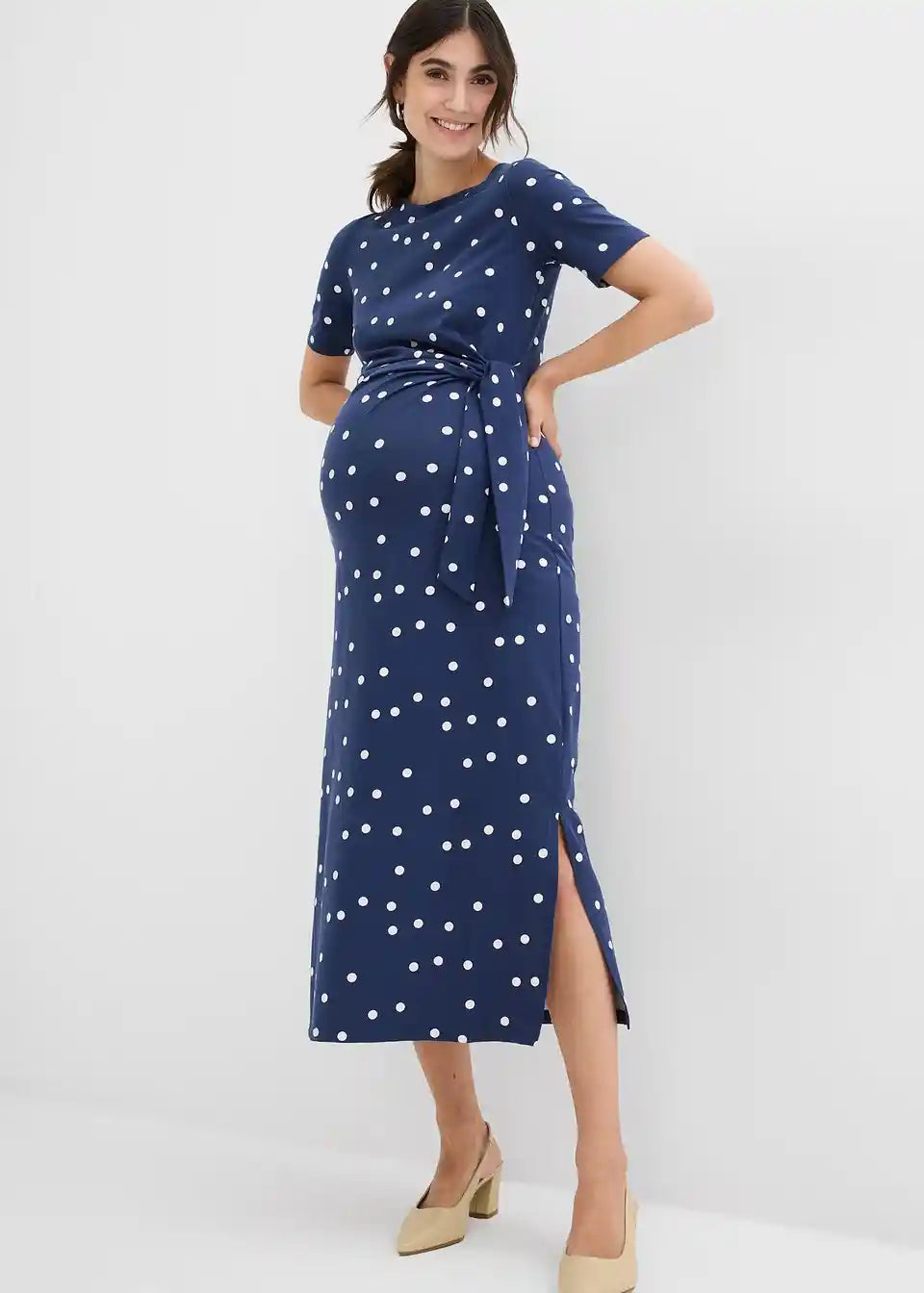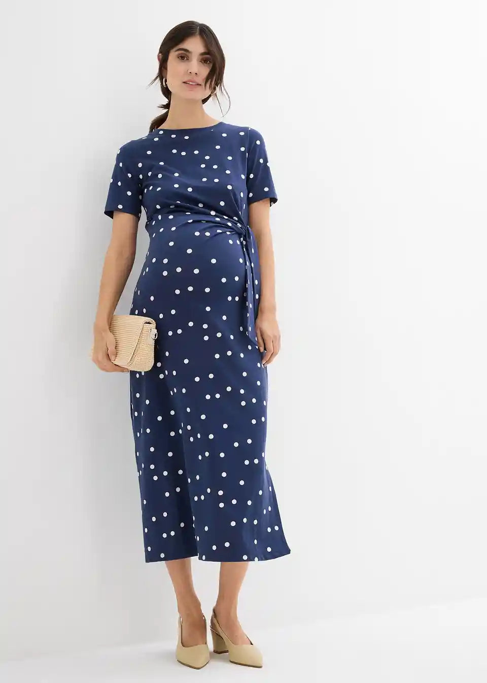 Mekana jersey trudnička haljina od organskog pamuka s okruglim izrezom i kratkim rukavima laskave dužine. Ljetna haljina ima lijepi uzorak točkica i bočne proreze na porubu. Dekorativni čvor naglašava slatki trudnički trbuščić.