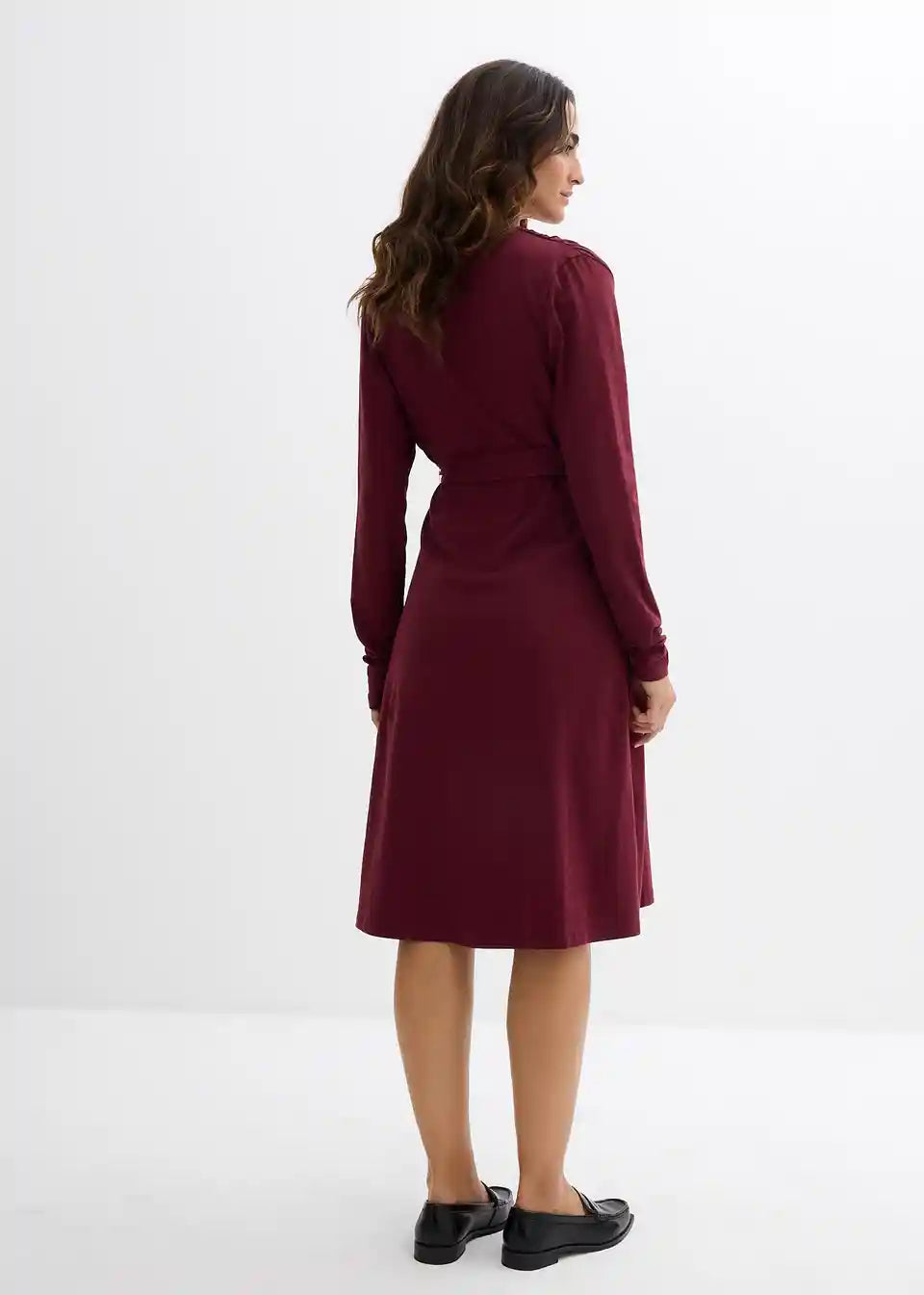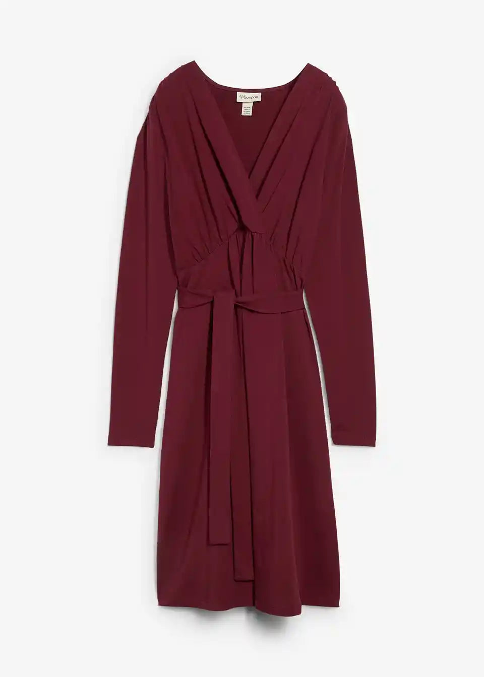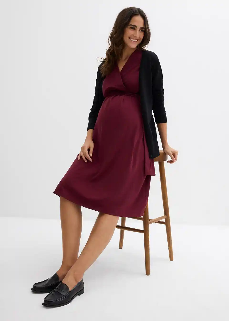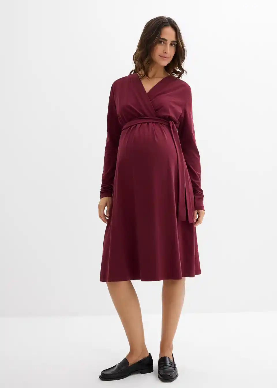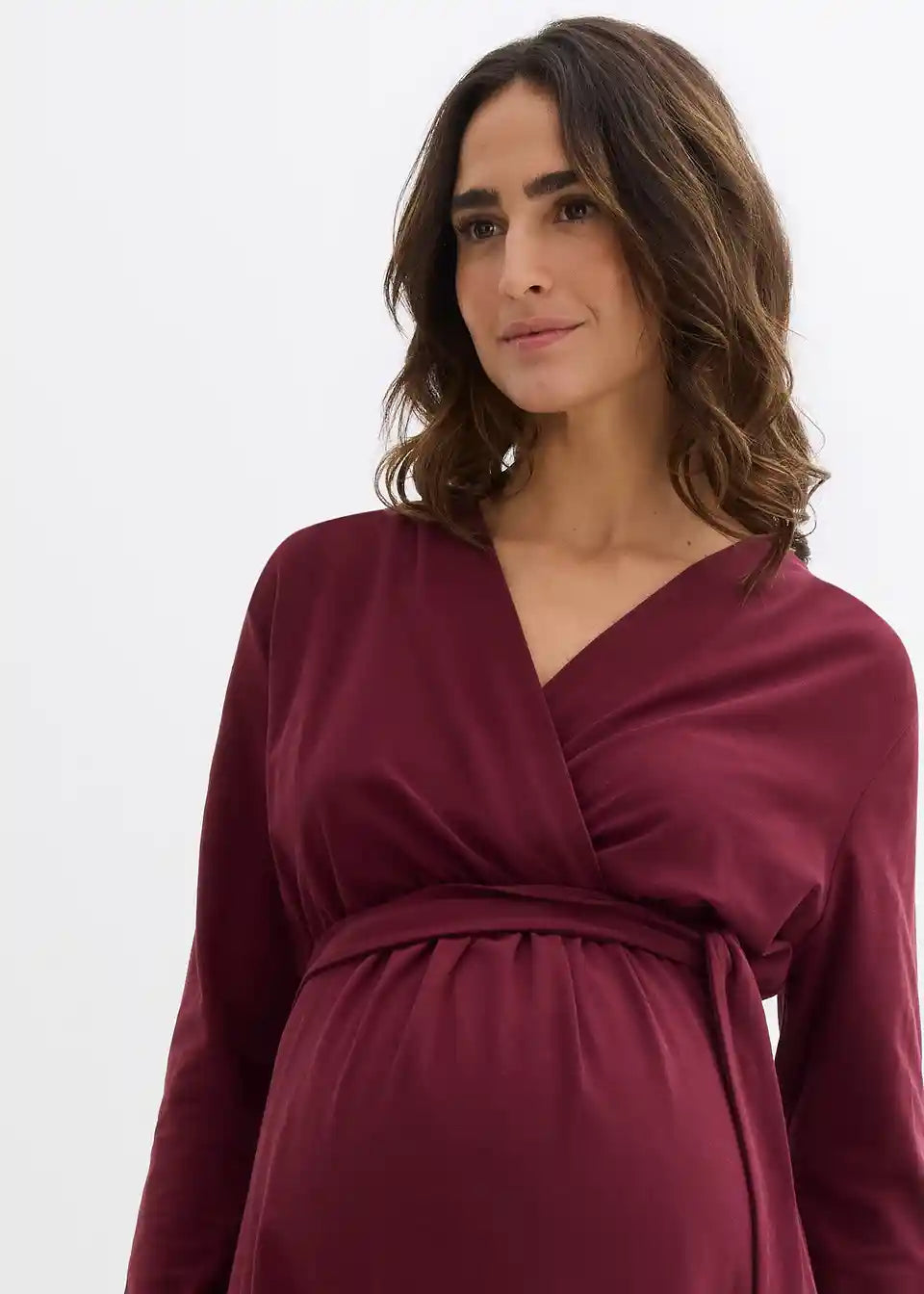 Meka jersey haljina od organskog pamuka s malim udjelom elastana, dužine do koljena i laskavog preklopnog izgleda. Gornji dio je krojen tako da omogućuje lako dojenje. Odvojivi pojas za vezanje omogućuje individualno podešavanje širine struka i osigurava laskavu siluetu.
