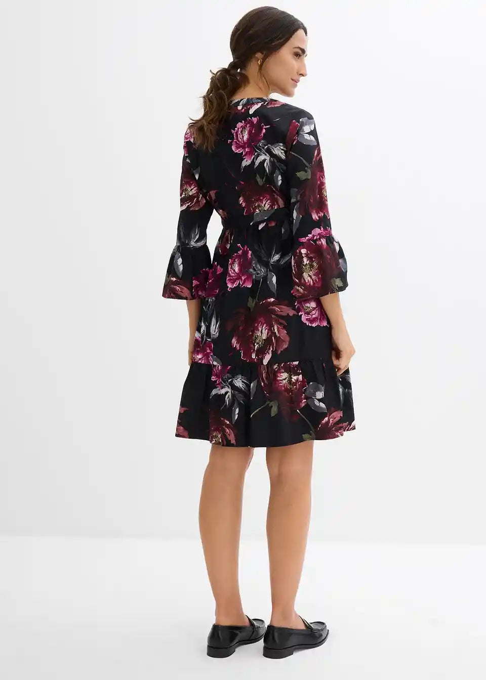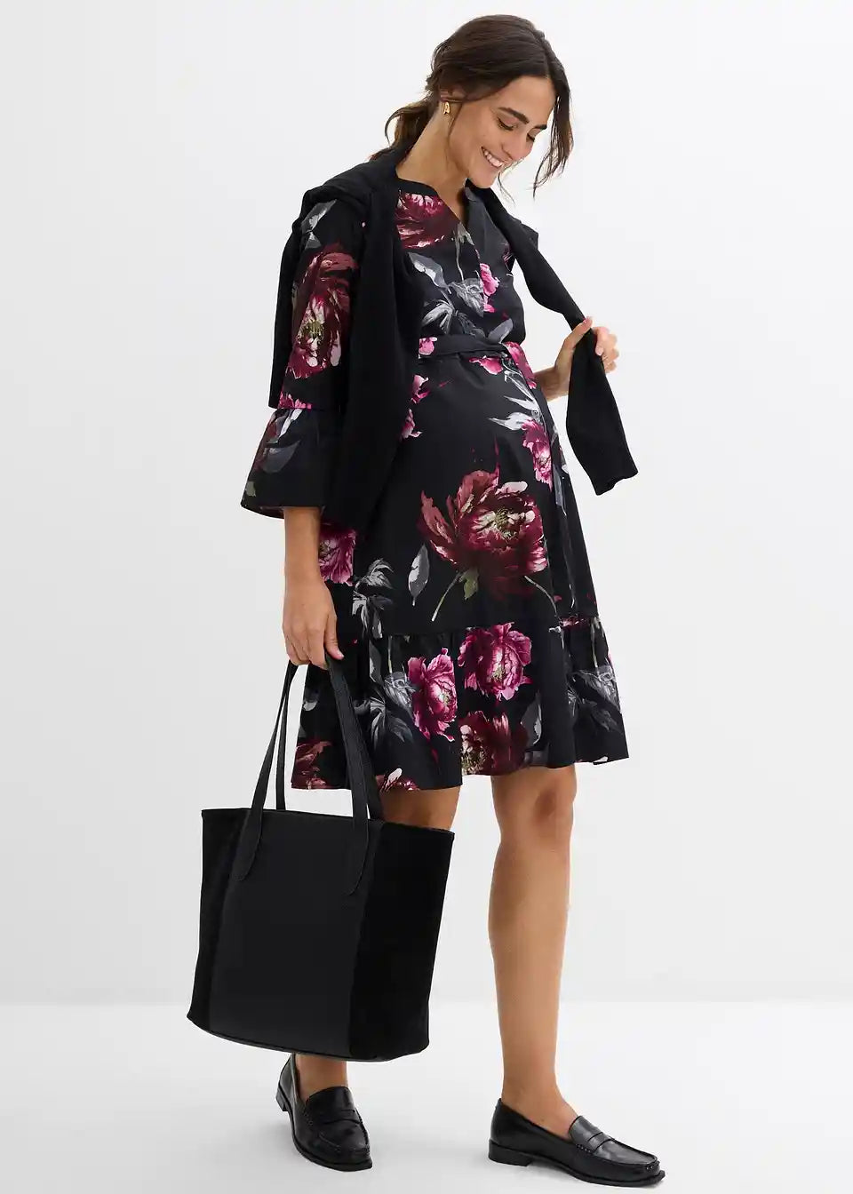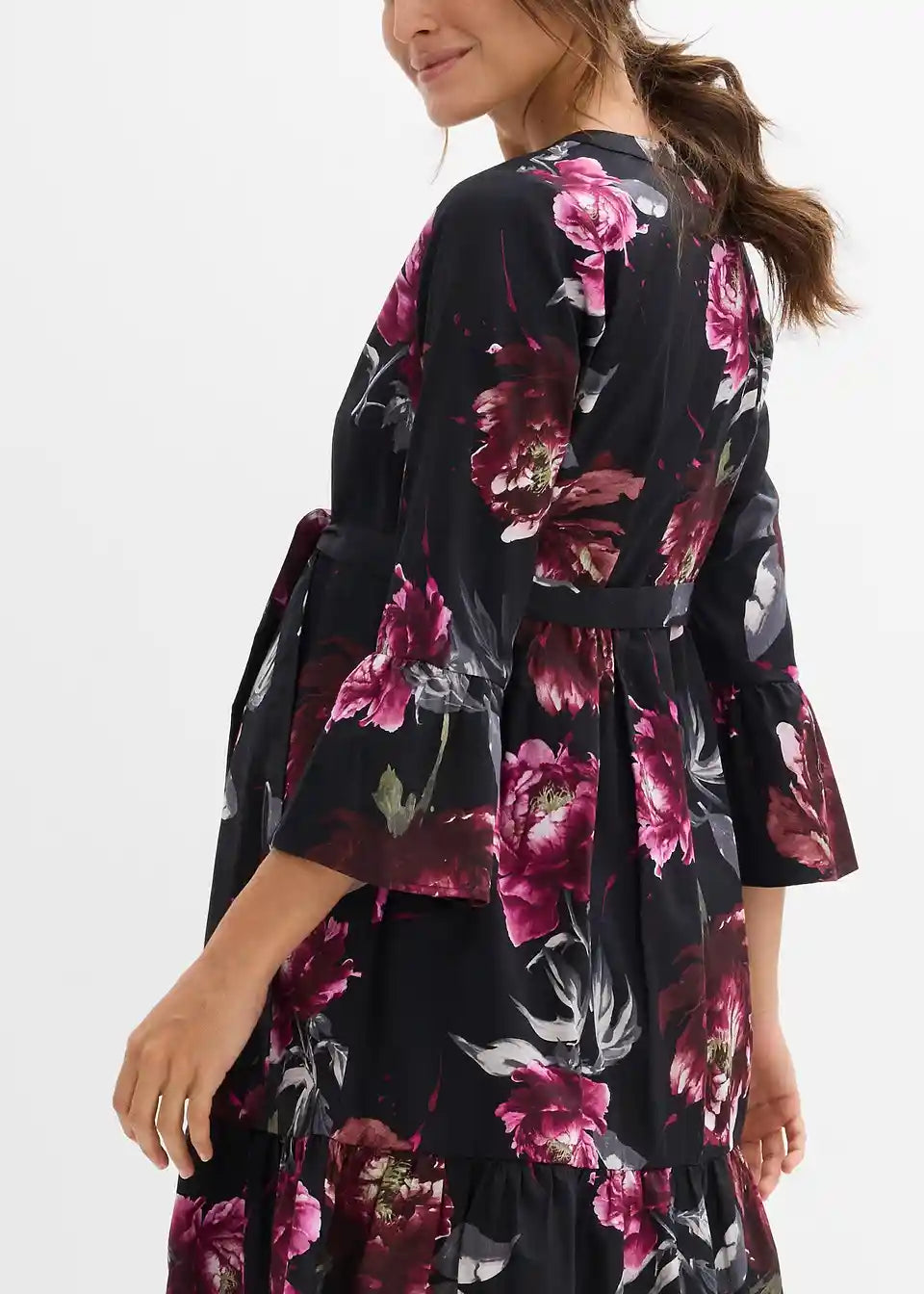 Haljina-bluza do koljena od mekane, lepršave pamuka s elegantnim sjajem. S okruglim izrezom, malom stajaćom kragnom i produženom lajsnom s gumbima koja omogućuje jednostavno dojenje. Rukavi i rub suknje ukrašeni su volanom. Odvojivi vezni pojas omogućuje individualno podešavanje širine struka i stvara laskavu siluetu.