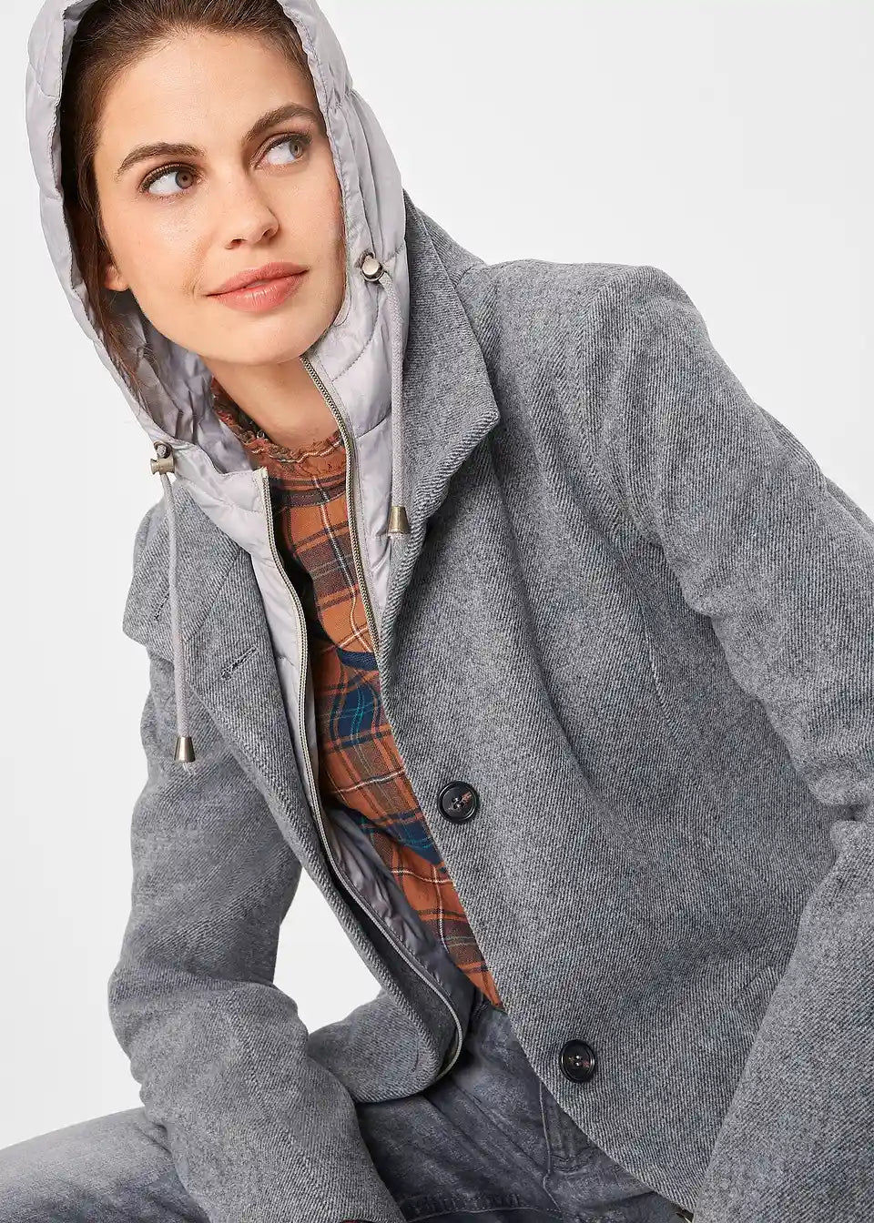 Ovaj moderni zimski kaput u 2-u-1 izgledu kombinira klasičan kroj kaputa s prošivenim umetkom. Gornji kaput impresionira čistim linijama i zatvara se ukrasnim gumbima.