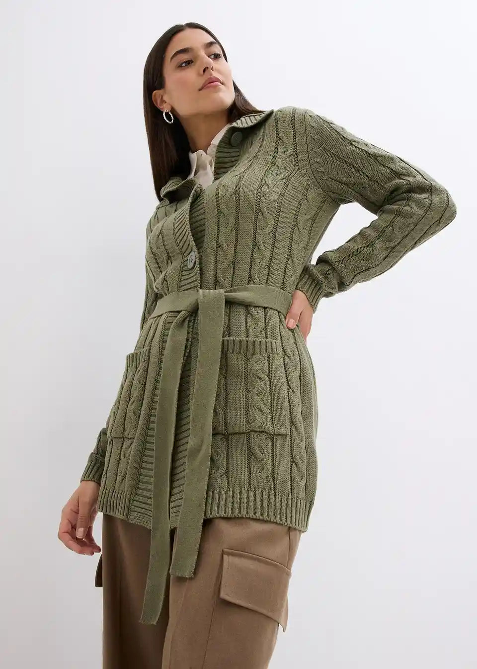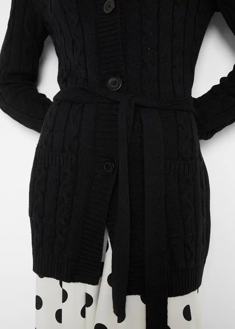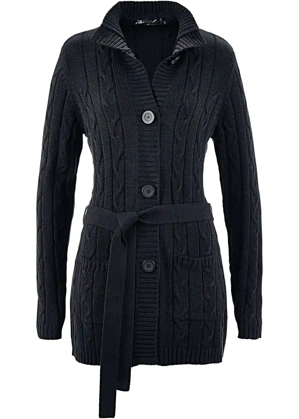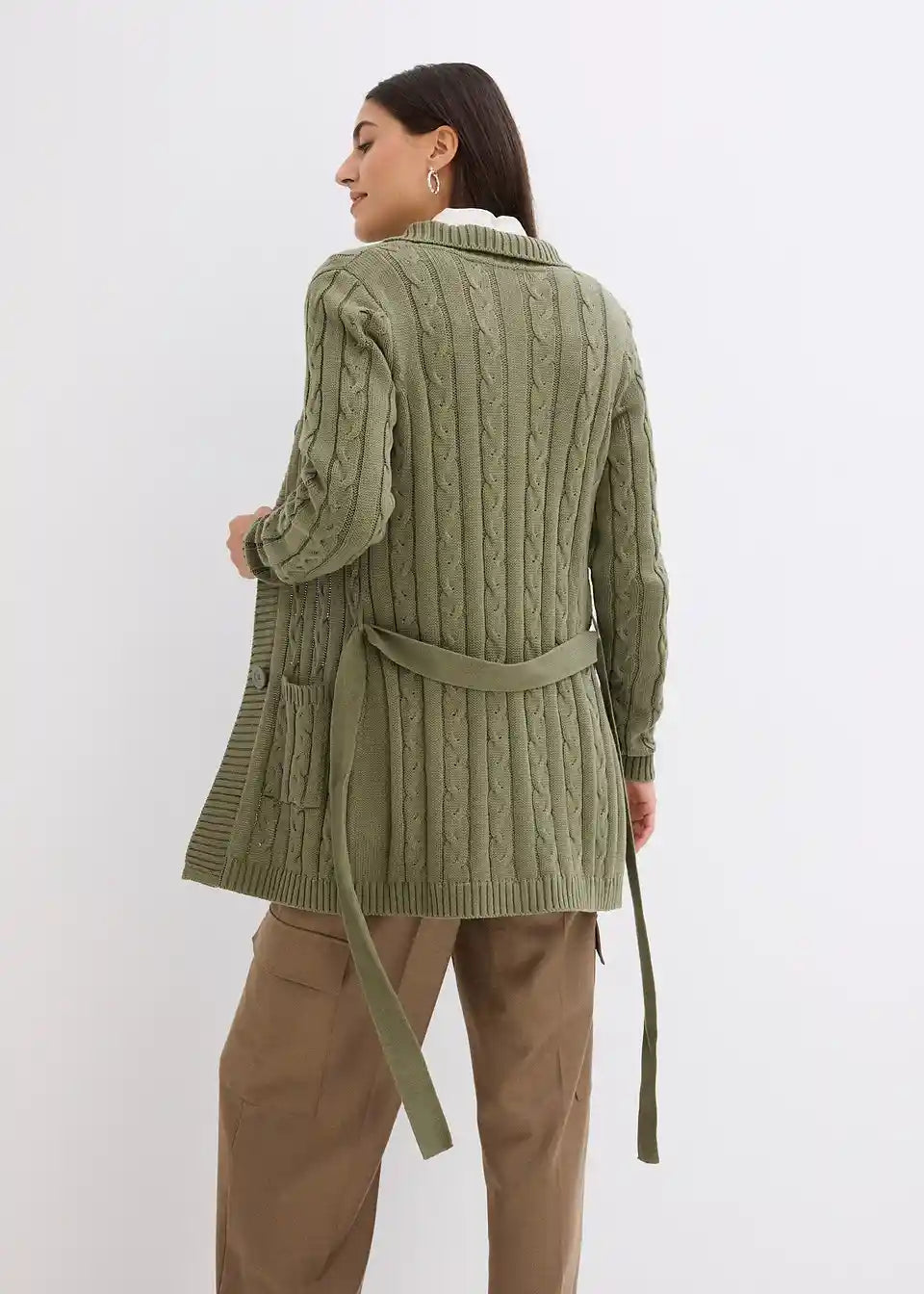 Udobna duga pletiva jakna s uzorkom pletenica i vezicom