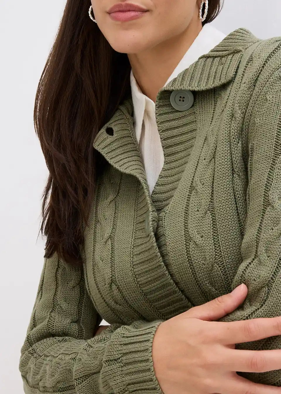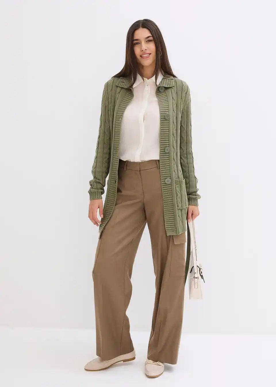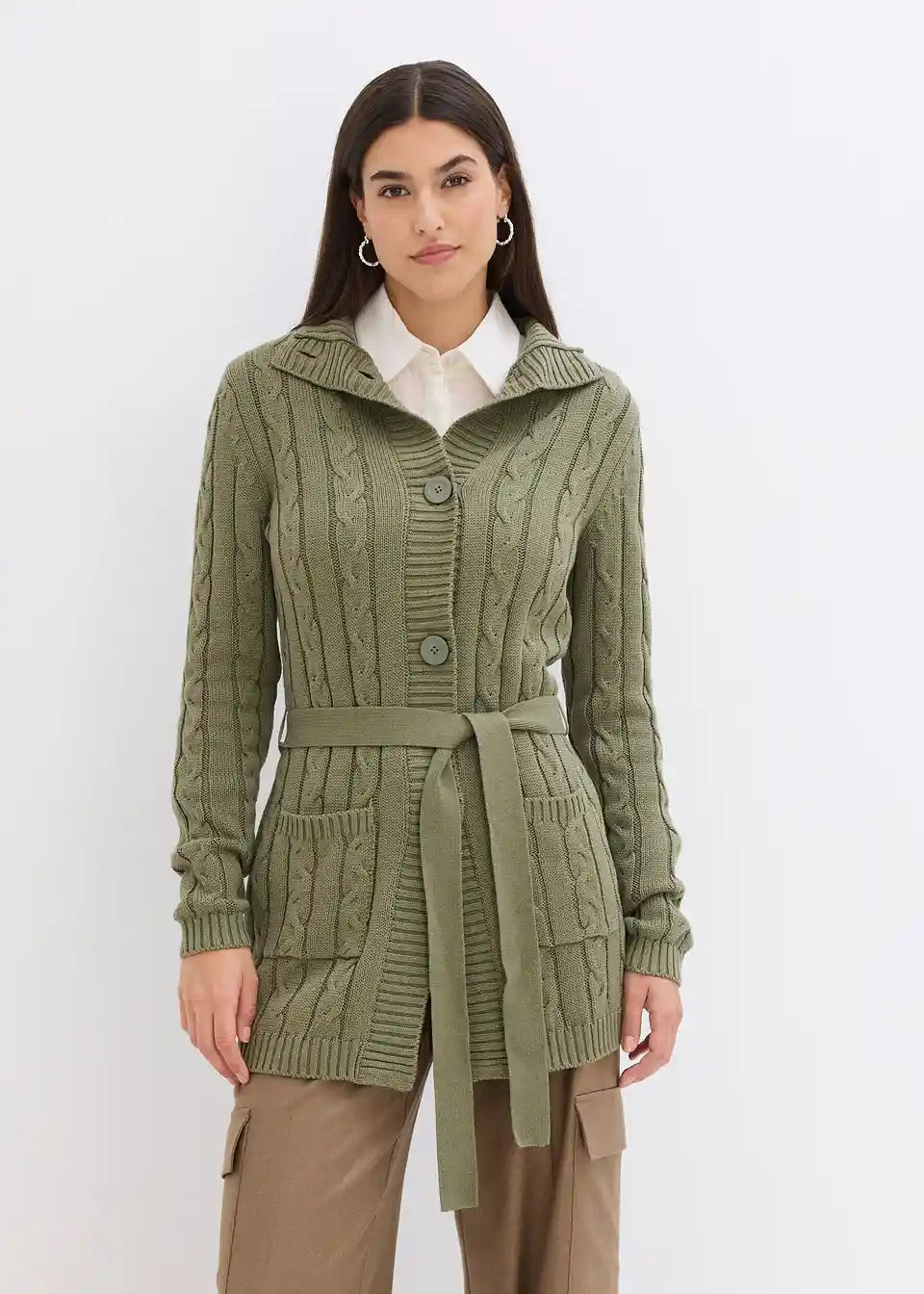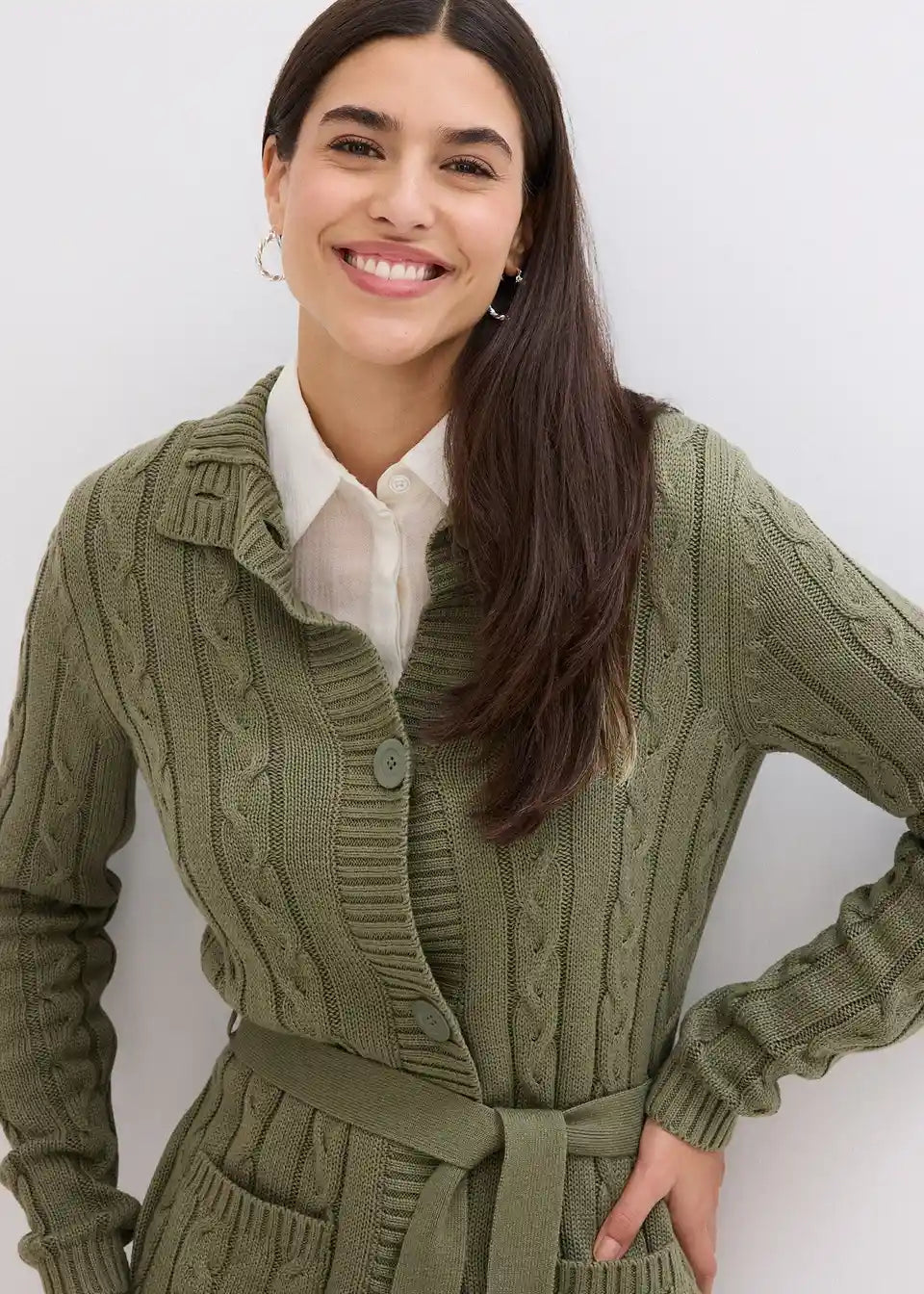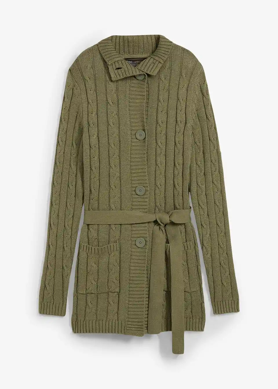 Udobna duga pletiva jakna s uzorkom pletenica i vezicom