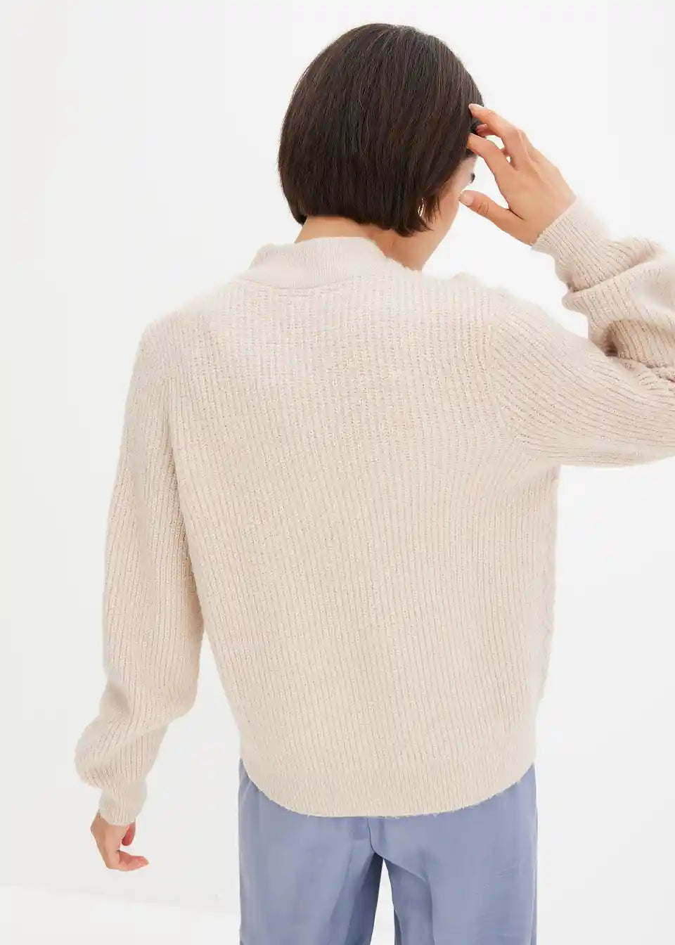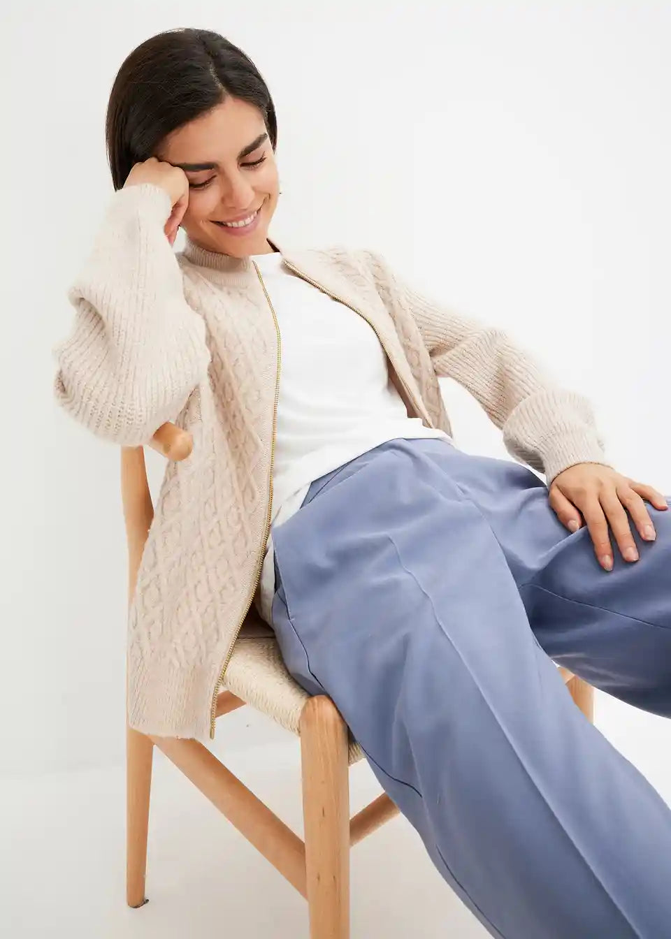 moderan pleteni kardigan s uzorkom pletenica i patentnim zatvaračem sprijeda