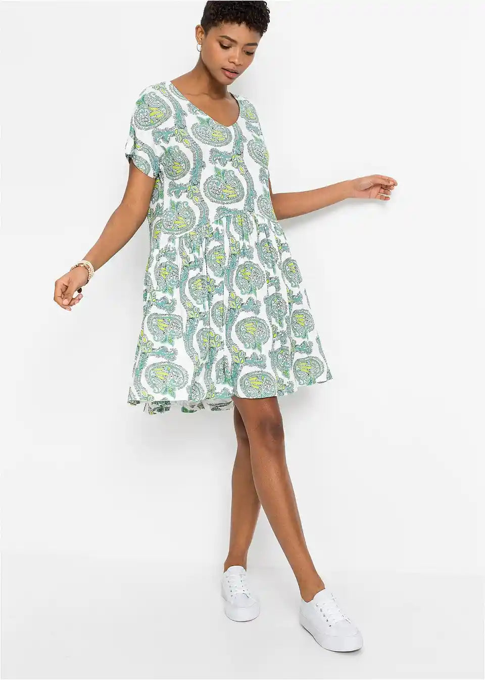 Kratka i široka haljina s rukavima u stilu šišmiša, V-izrezom i šavom u struku