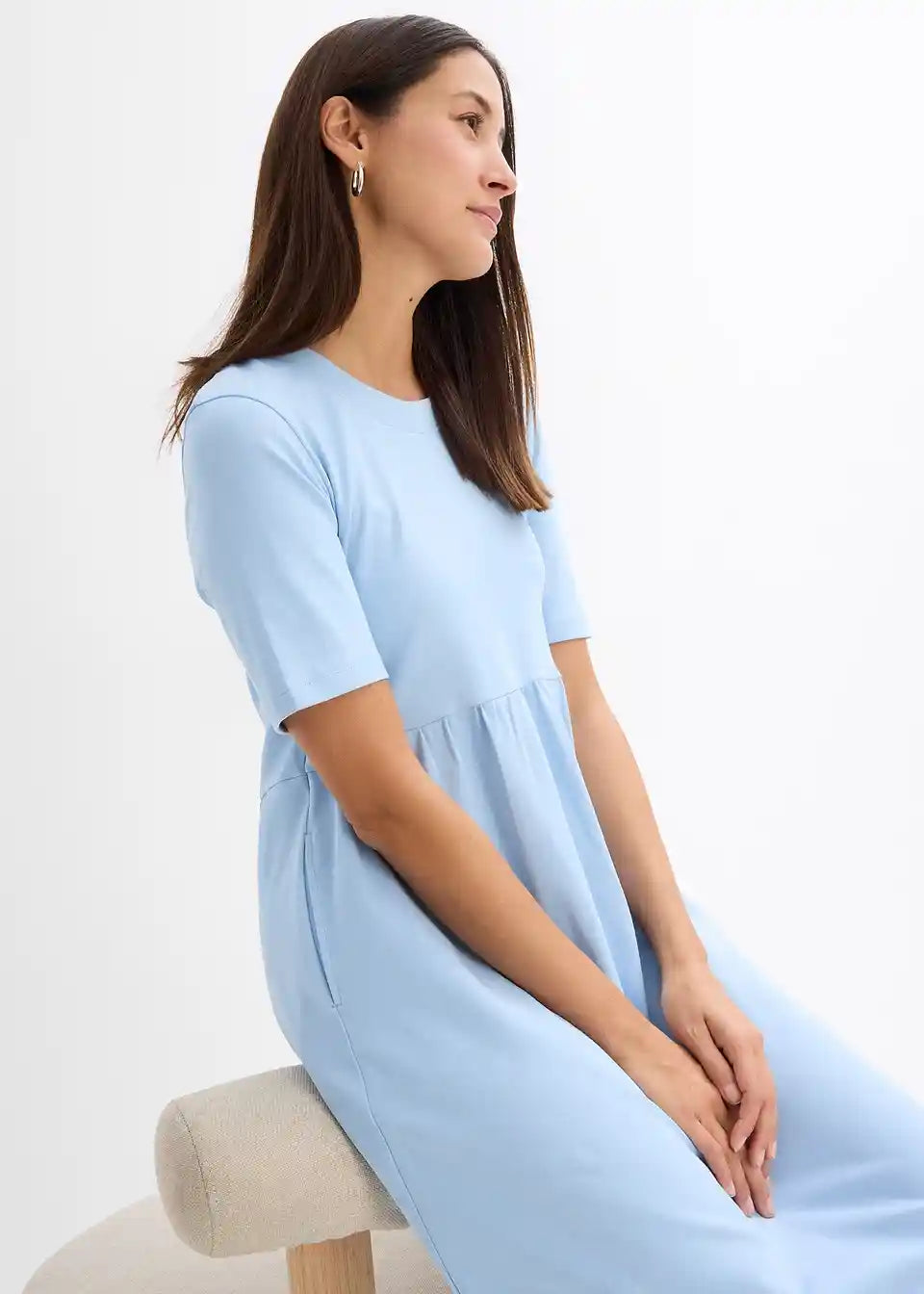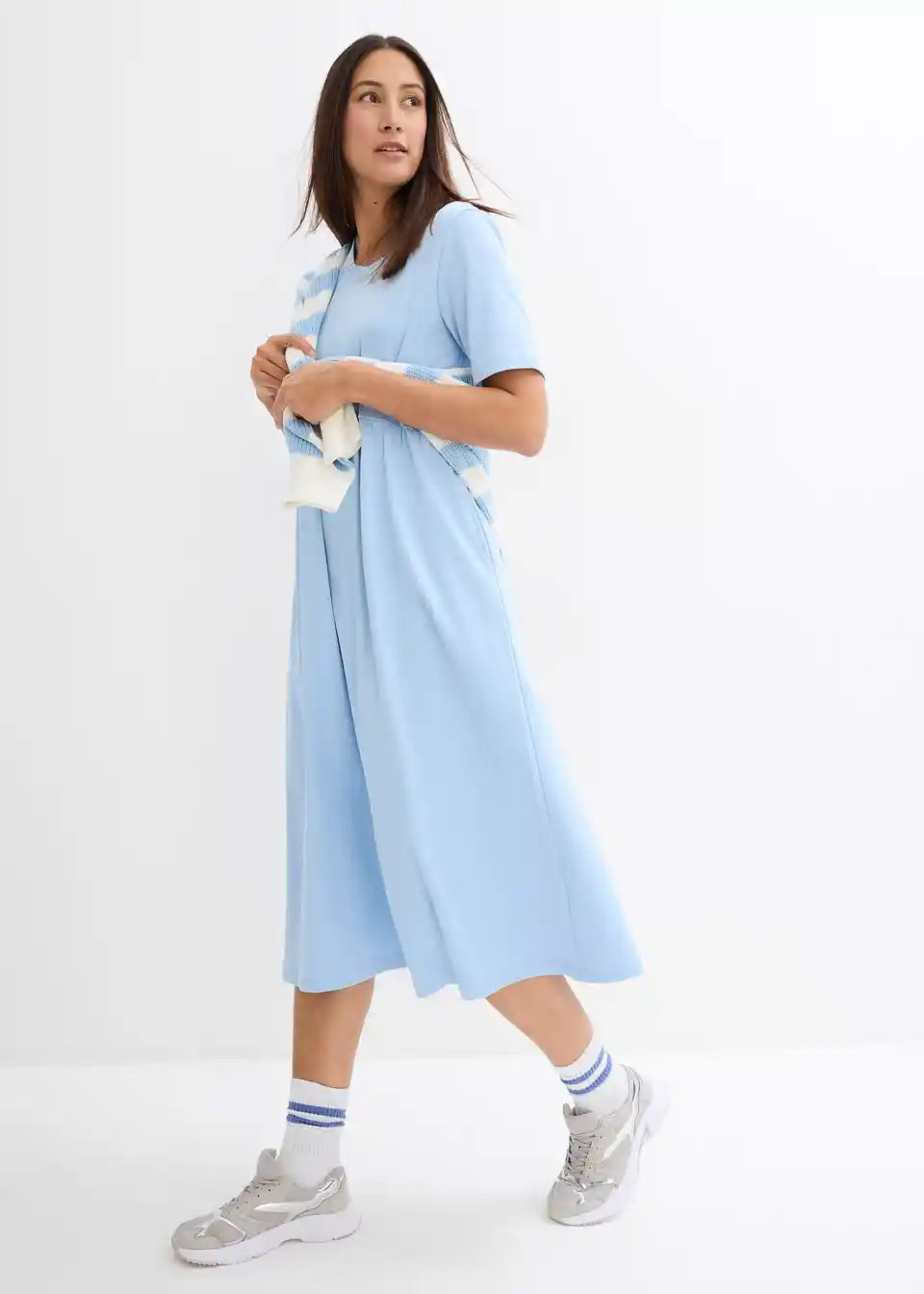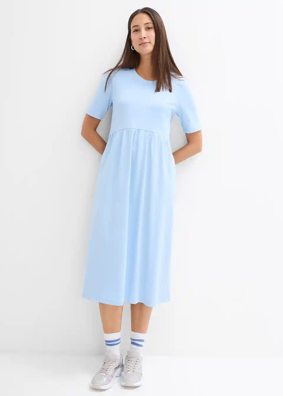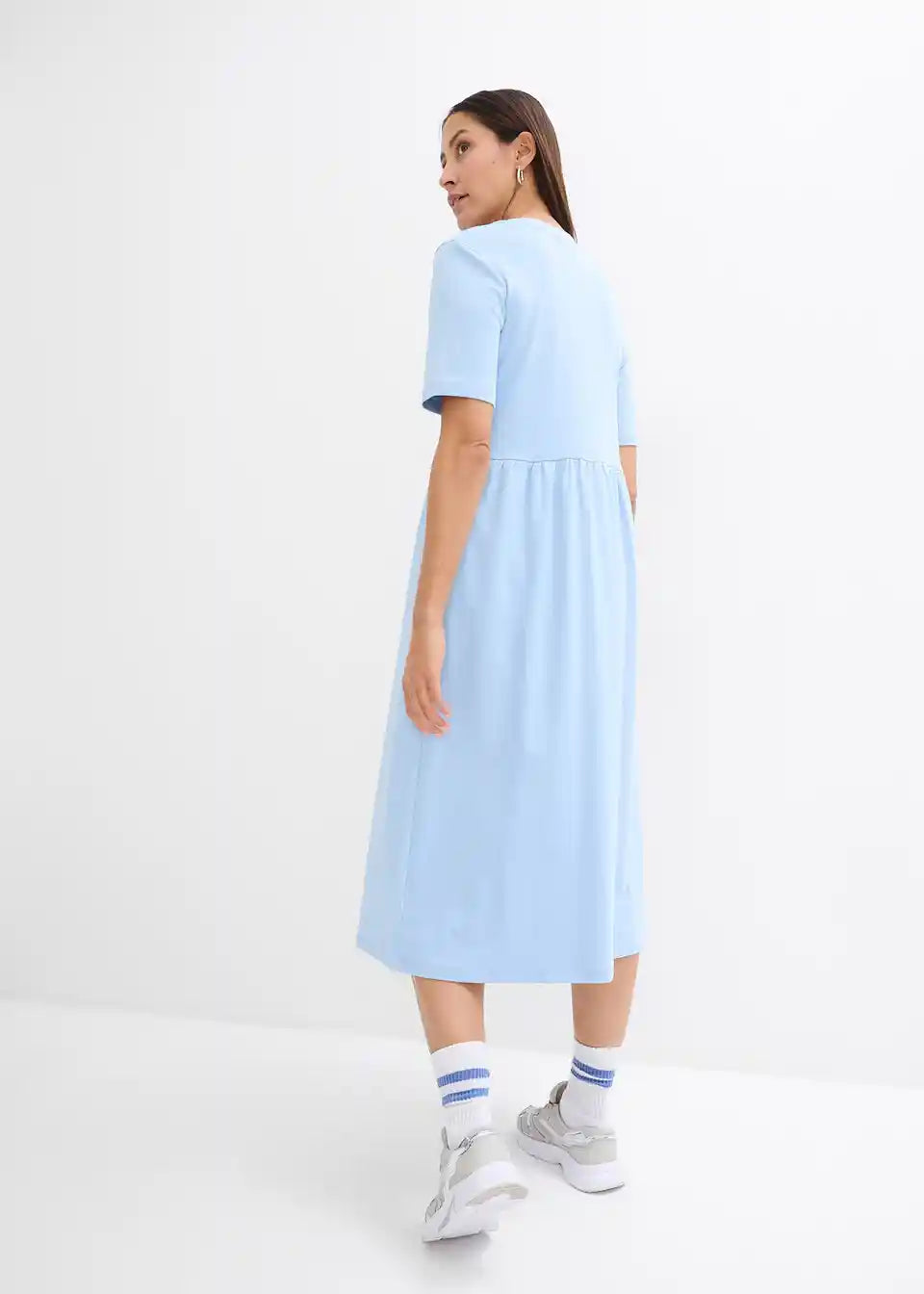 Lepršava jersey haljina s bočnim prorezom, visokim okruglim izrezom i kratkim rukavima