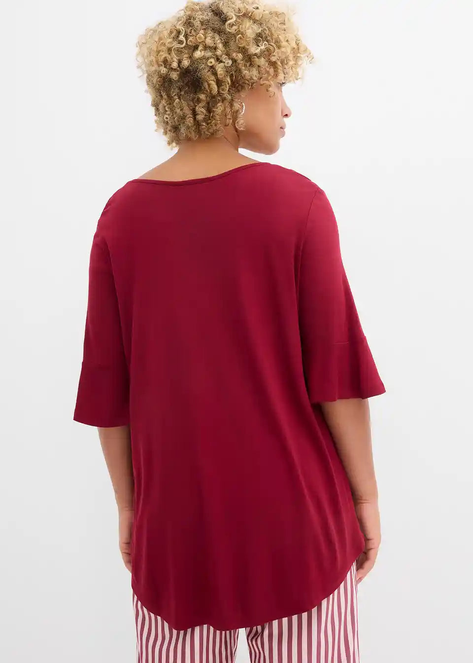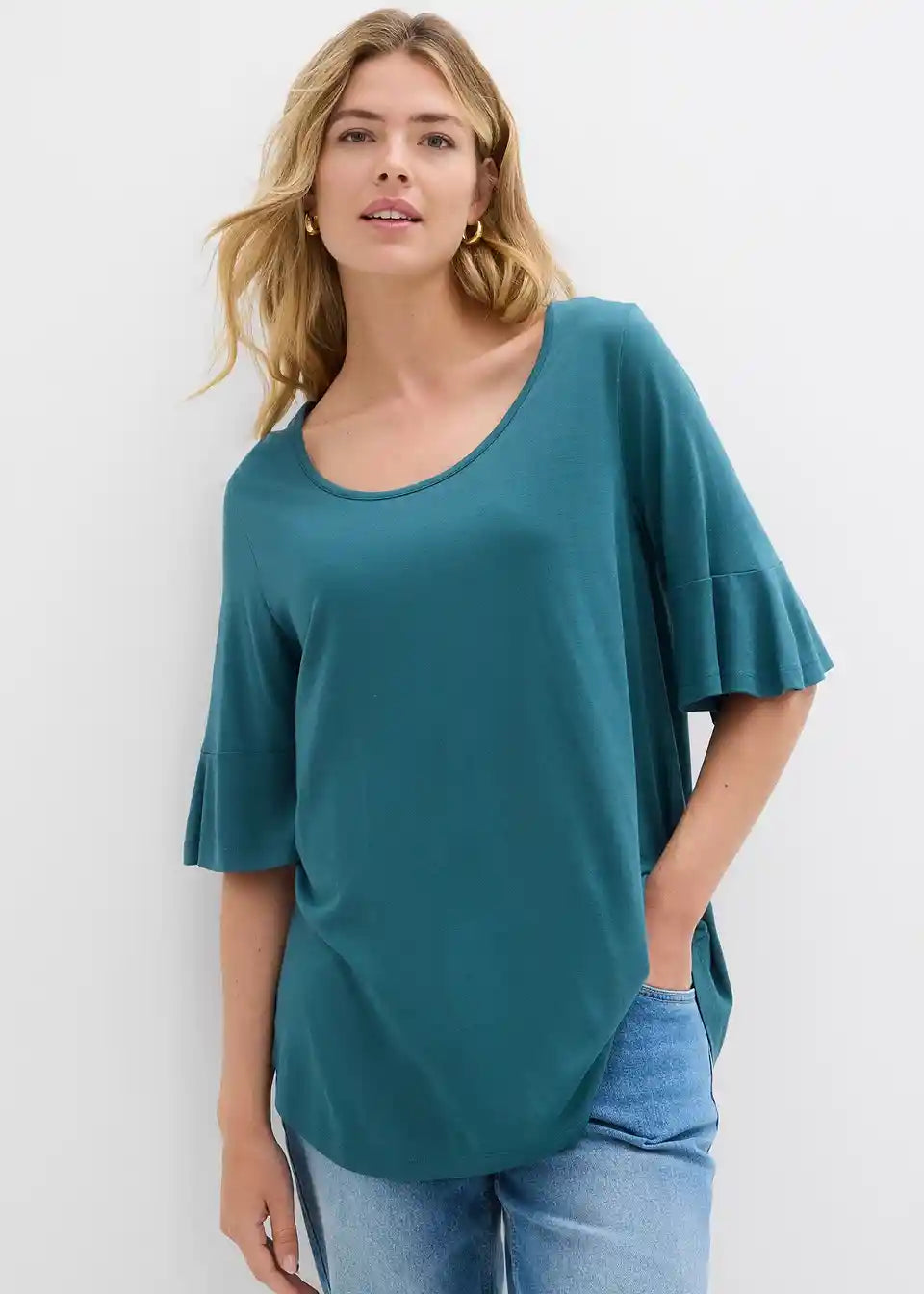 Majica s okruglim izrezom u A-kroju. S zaobljenim porubom i volan detaljima na završetku rukava.