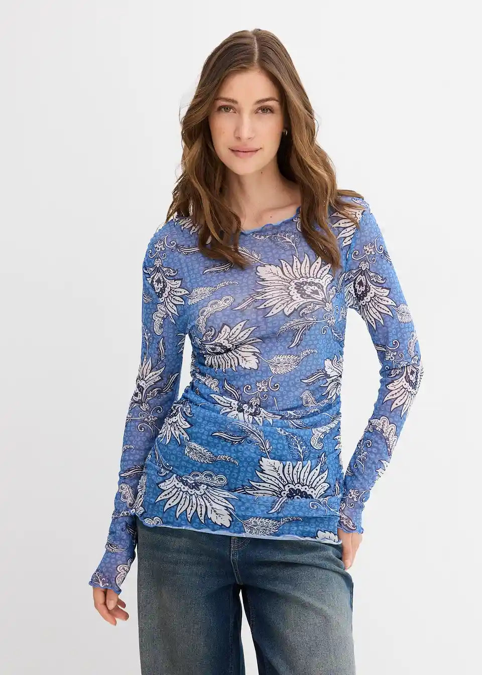 Tištana majica s dugim rukavima od fine Mesh mreže s naborima