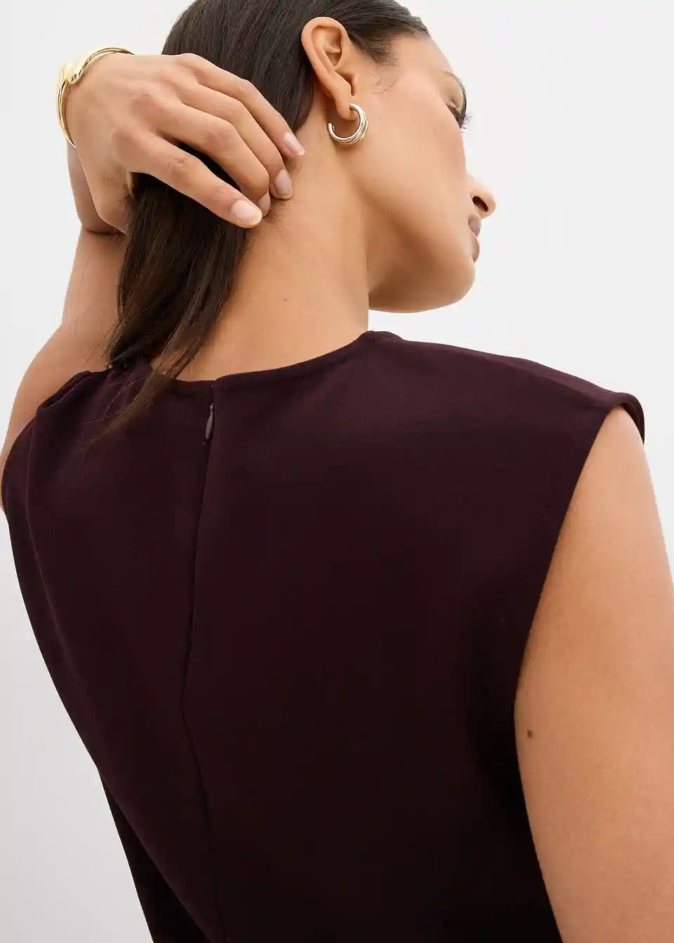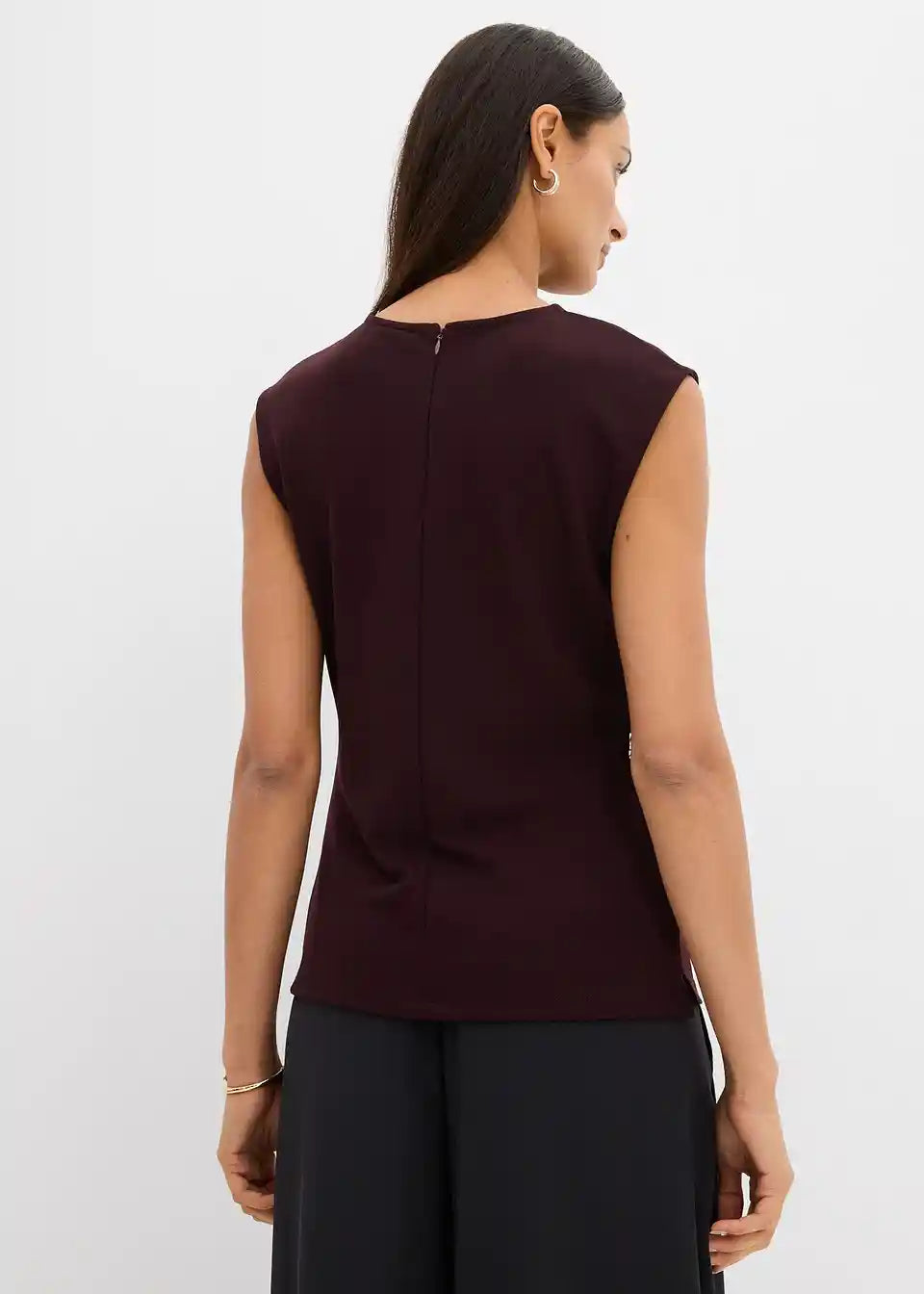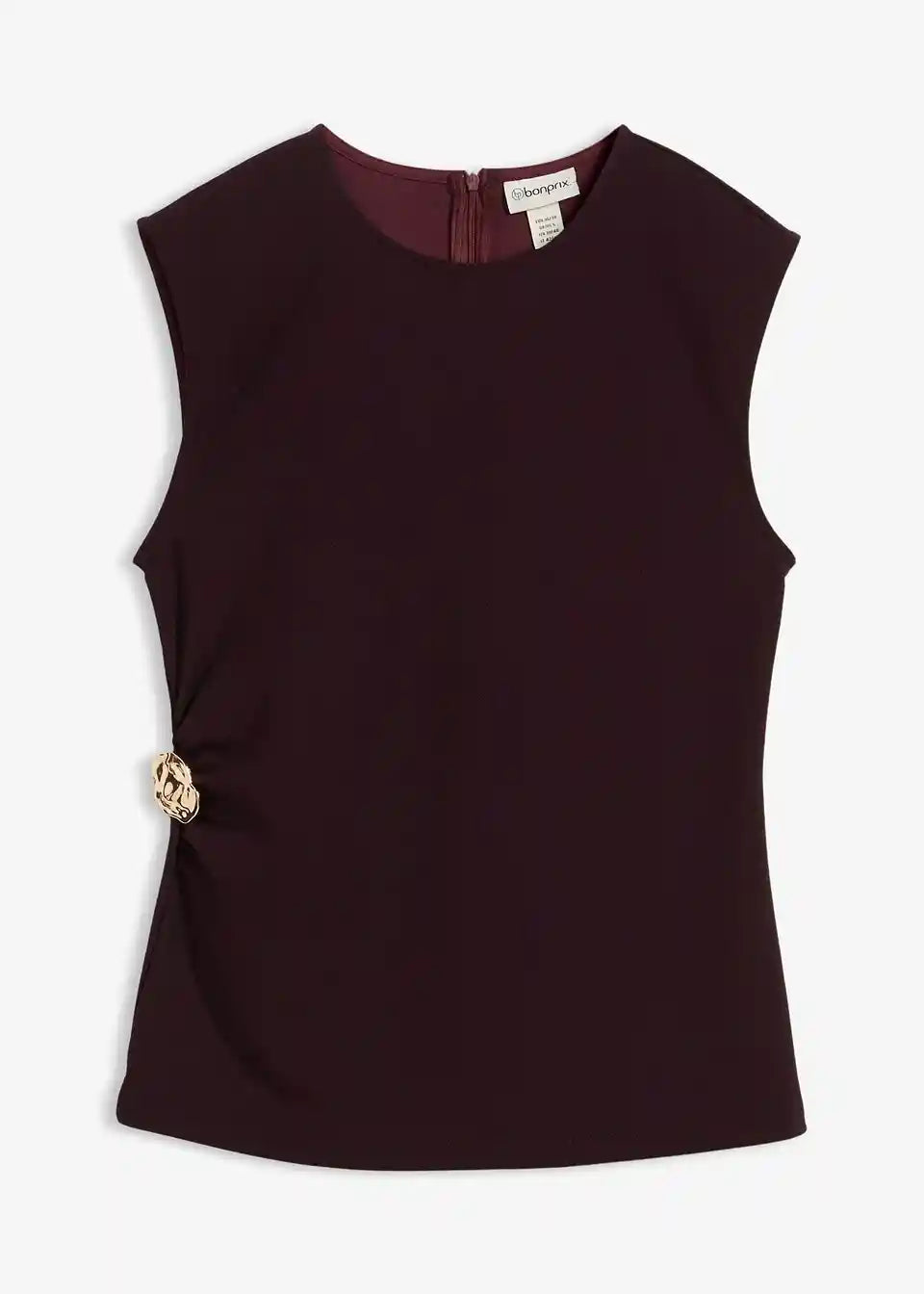 Bezrukavni top s naglašenim strukom i ukrasnom kopčom u struku. Skriveni patentni zatvarač straga.