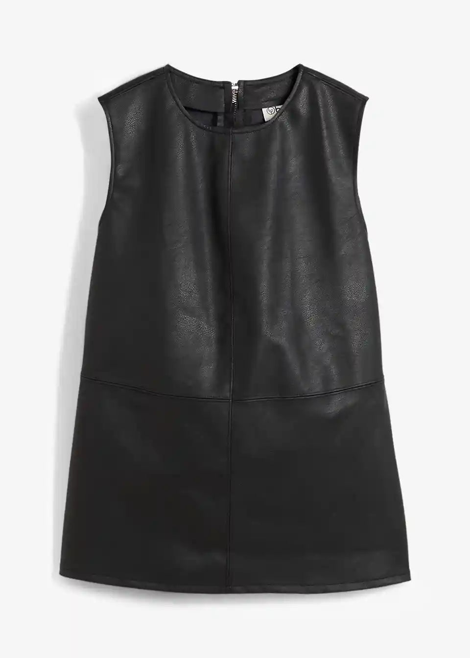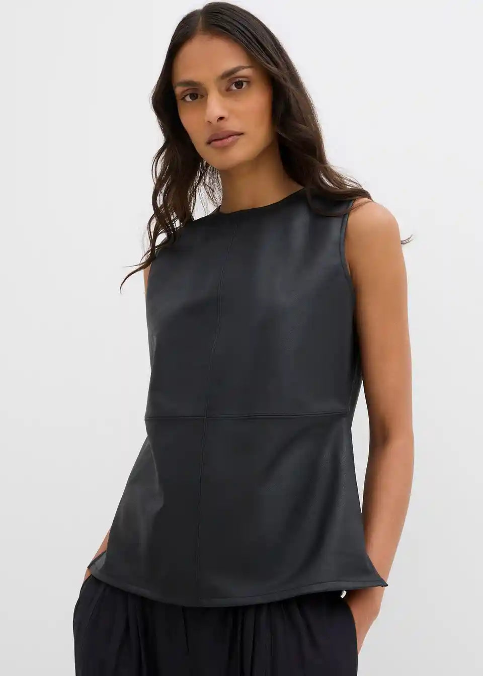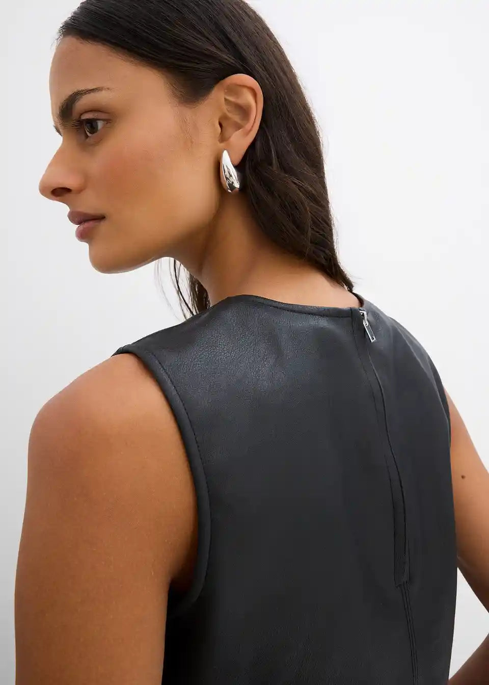 Bezrukavni top od imitacije kože s bojom usklađenim podjeljenim šavovima, prorezima sa strane na rubu te izloženim patentnim zatvaračem na leđima