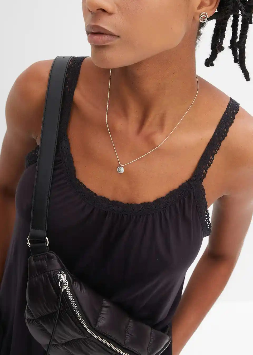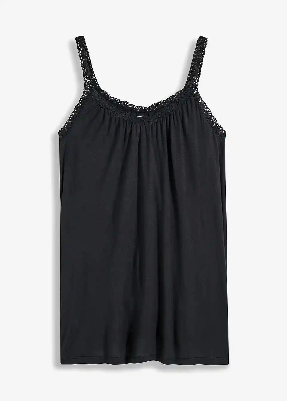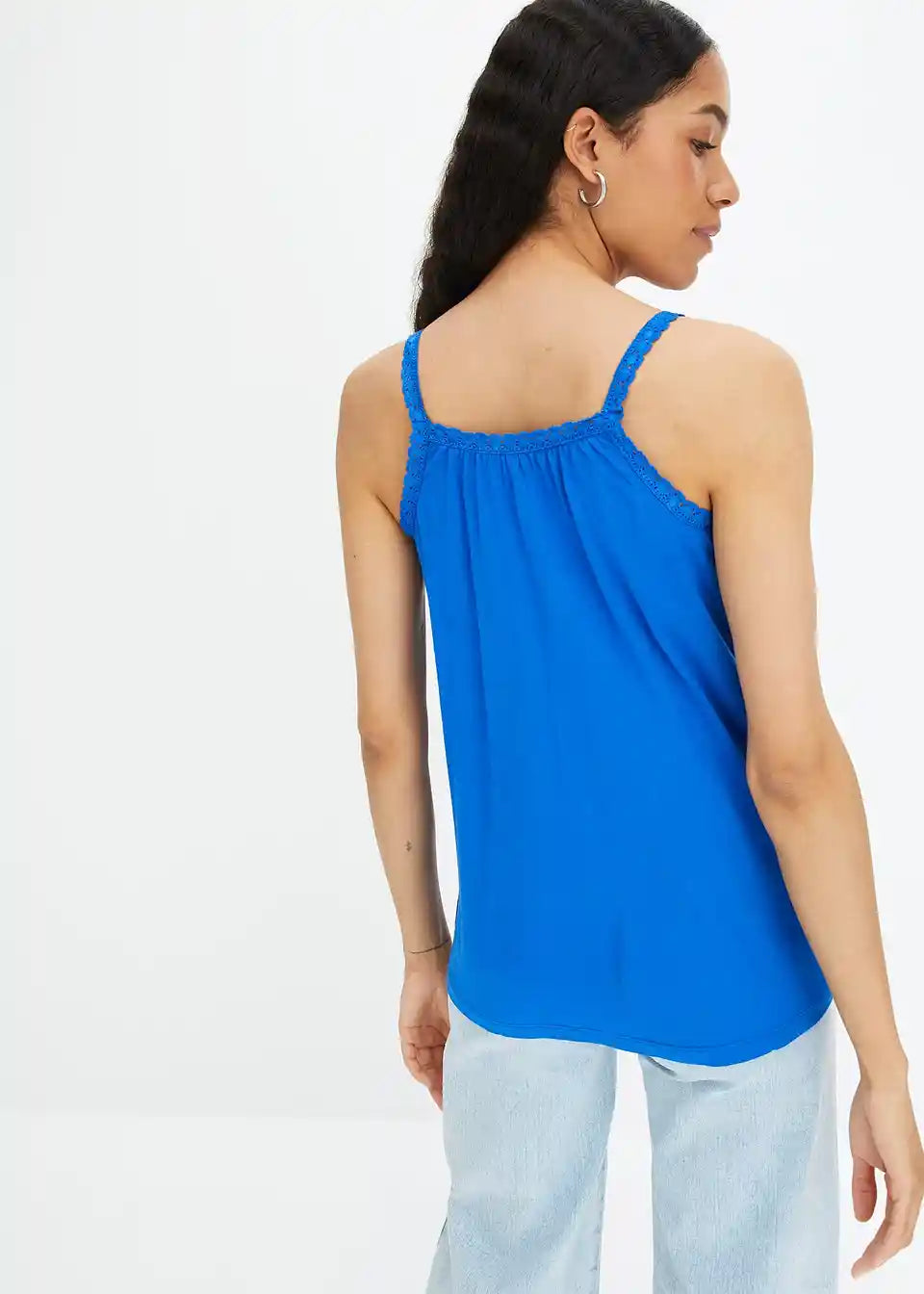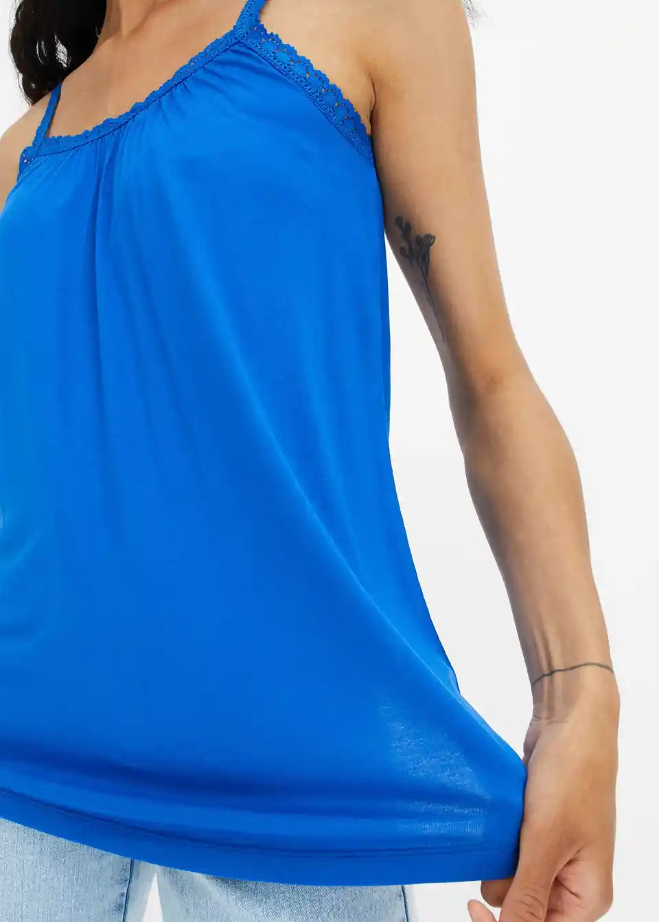 Raznoliki stilovi mogu se postići ovim modernim topom. Gornji dio koji prekriva bokove ukrašen je nježnom čipkastom bordurom na špageti naramenicama i oko izreza. Sa svojim opuštenim krojem pada u nježnim naborima i ležerno ističe figuru. Bez obzira nosi li se s hlačama, kratkim hlačama, trapericama ili suknjom - majica top s čipkastim detaljima može se nositi na mnogo načina.