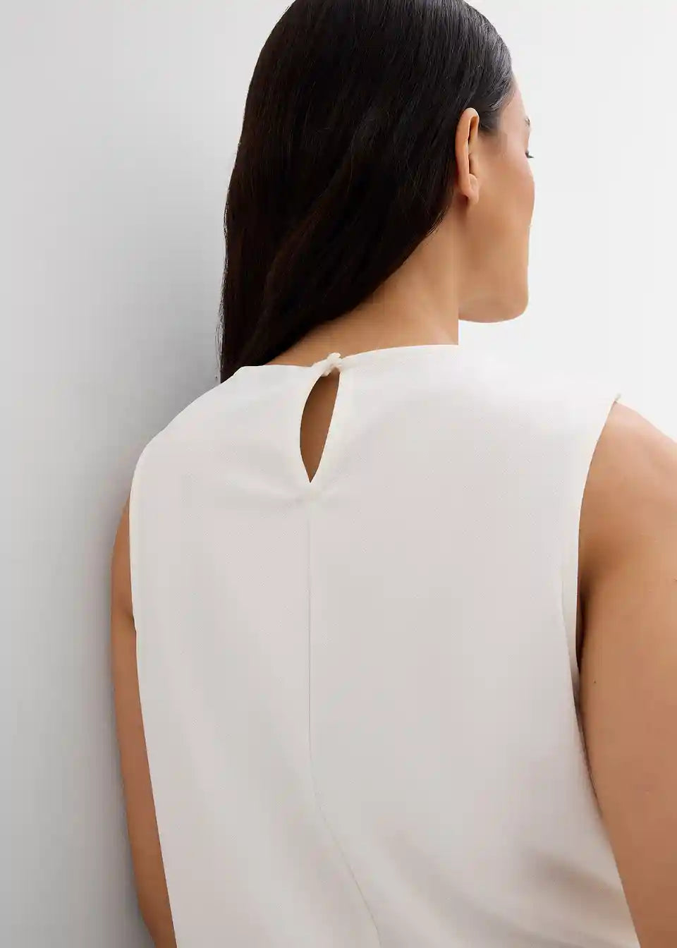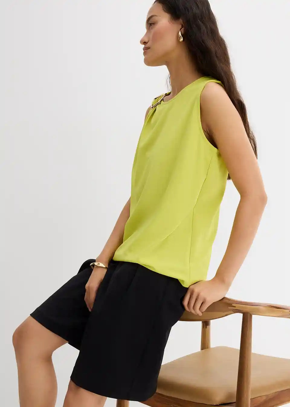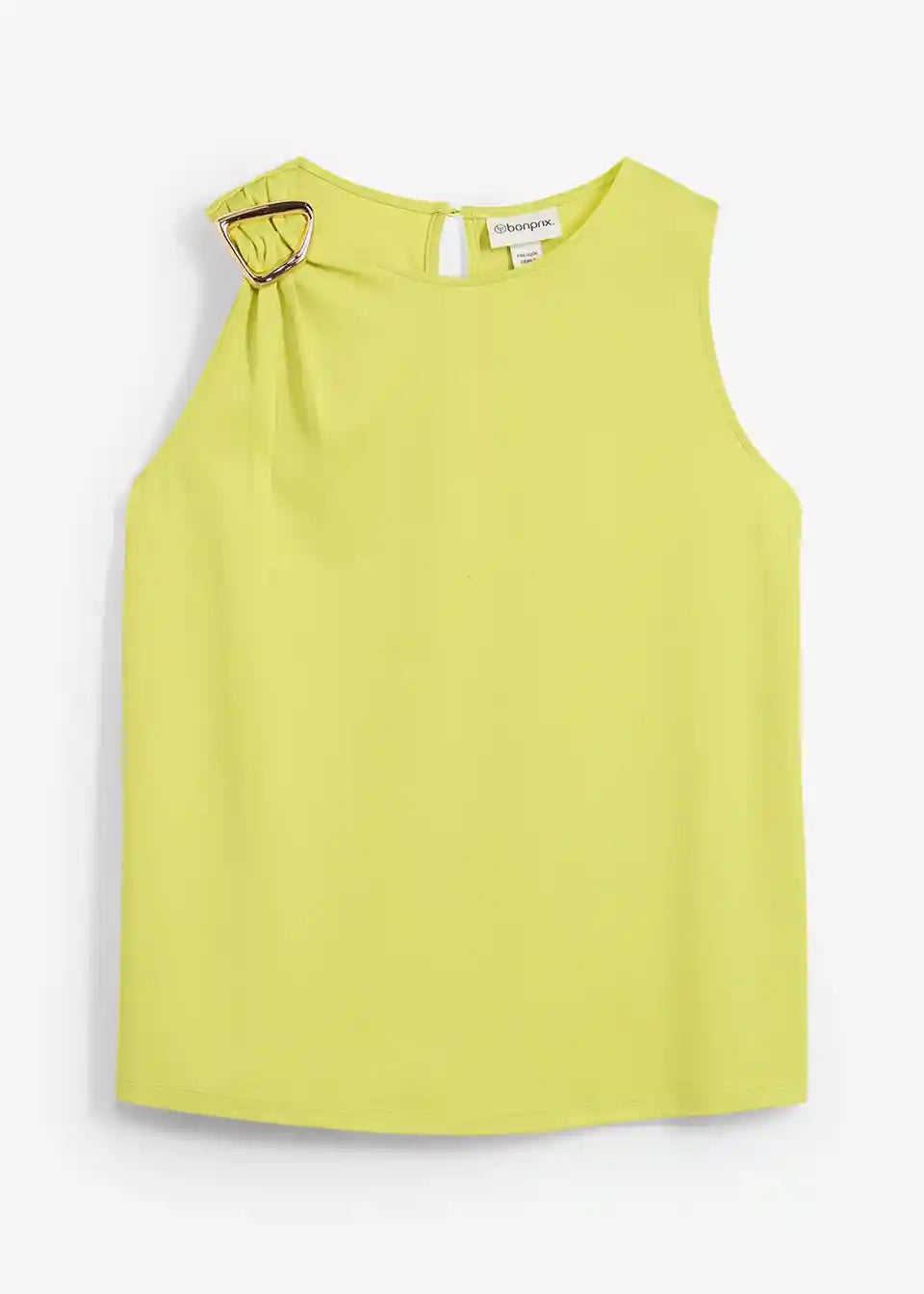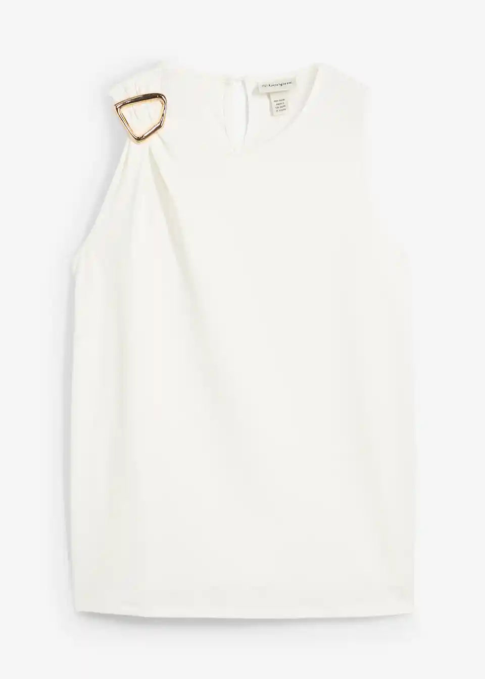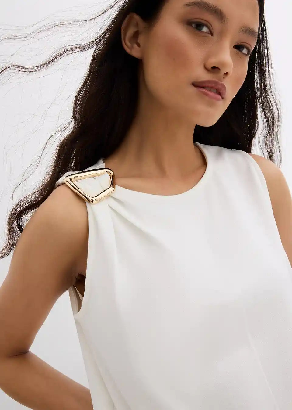 Lepršavi top bez ramena s drapiranim materijalom i metalnom kopčom na ramenu