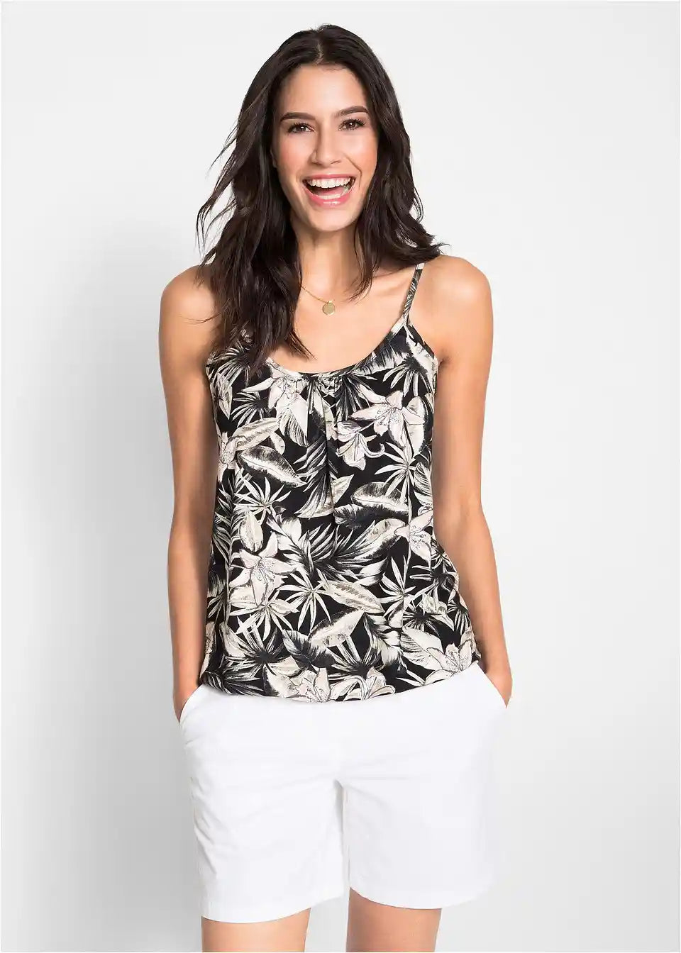 Ležeran, figuri laskajući kroj i mekani materijal koji lijepo pada čine ovaj top s cvjetnim printom iz bpc-a udobnim omiljenim komadom. Duboki okrugli izrez i uske spaghetti naramenice stvaraju poseban izgled. Lagano naboranje sprijeda ovom modelu krojenom tako da prekriva bokove daje dodatnu prozračnost. Print s cvjetnim motivima naglašava ženstveni izgled ovog modernog topa.