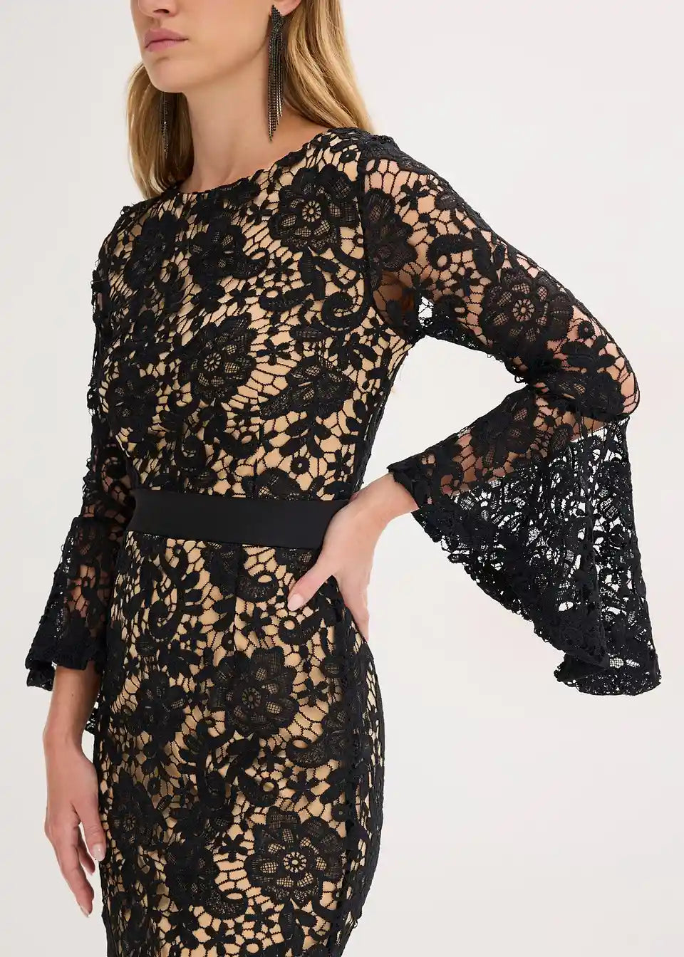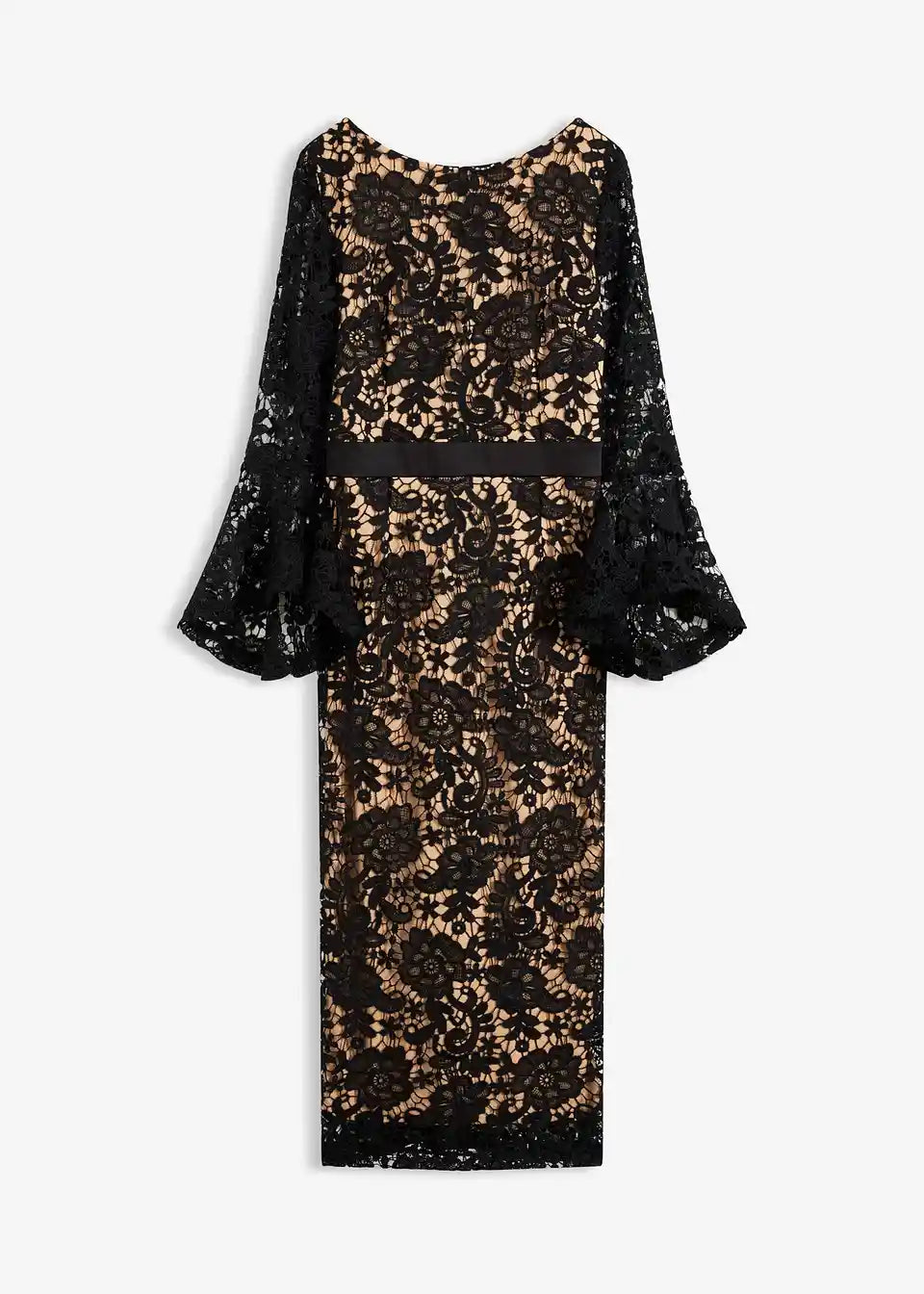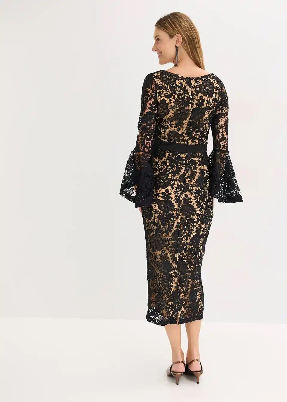 Moderno i ženstveno: večernja haljina od očaravajuće čipke, midi dužine, sa satenskim umetkom u struku i volan rukavima