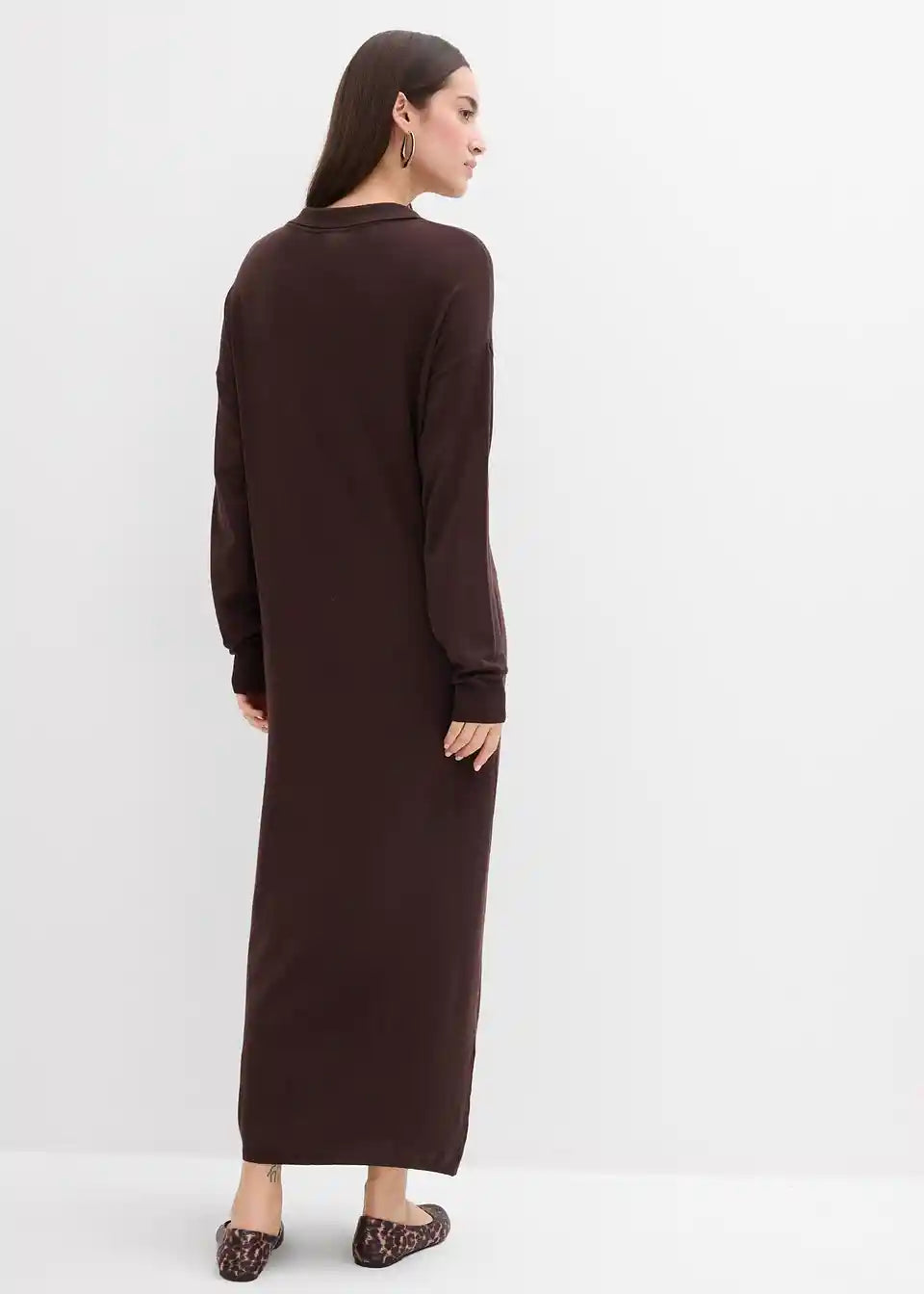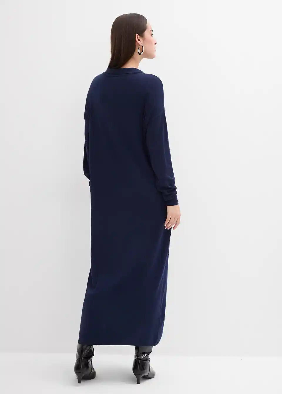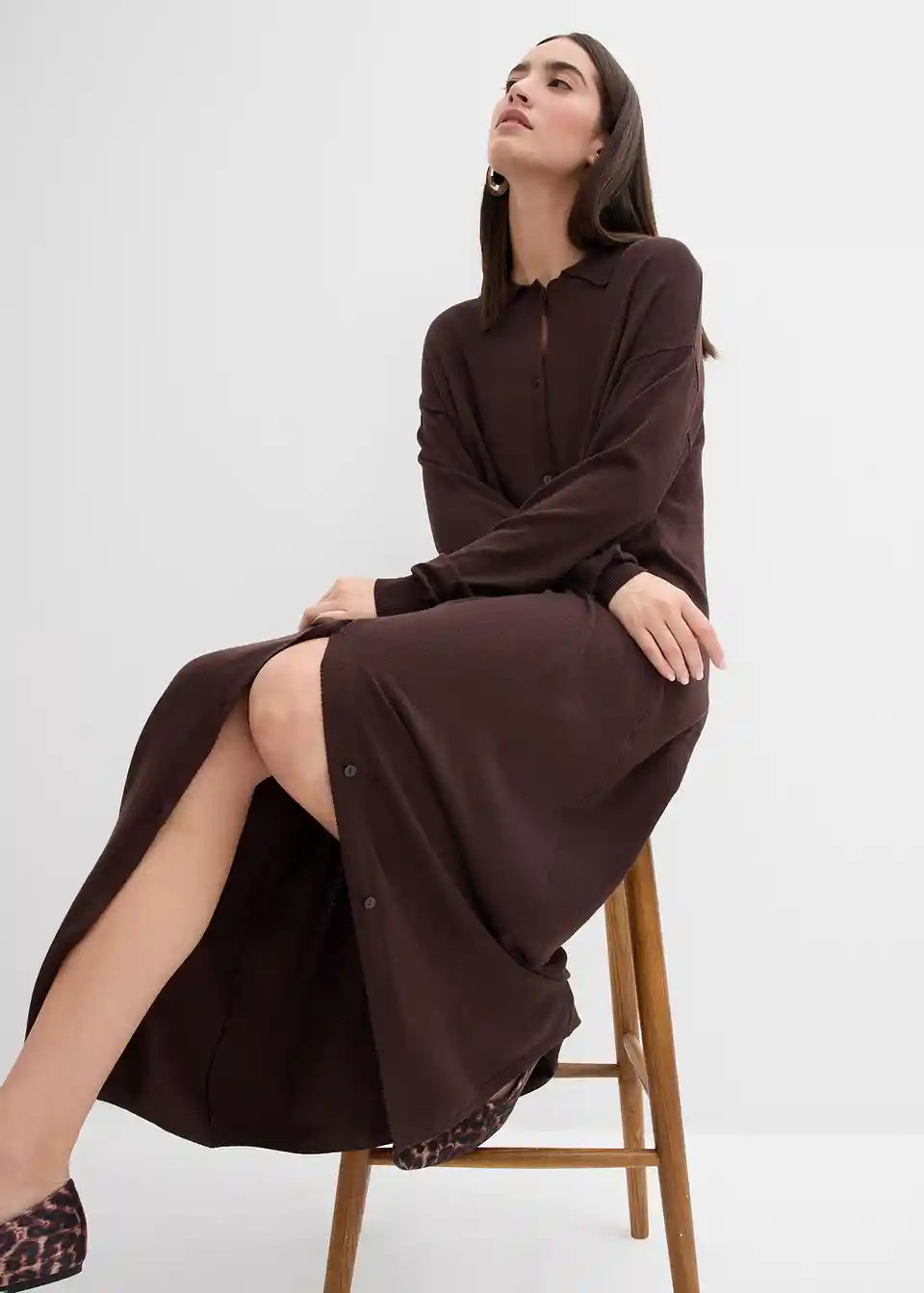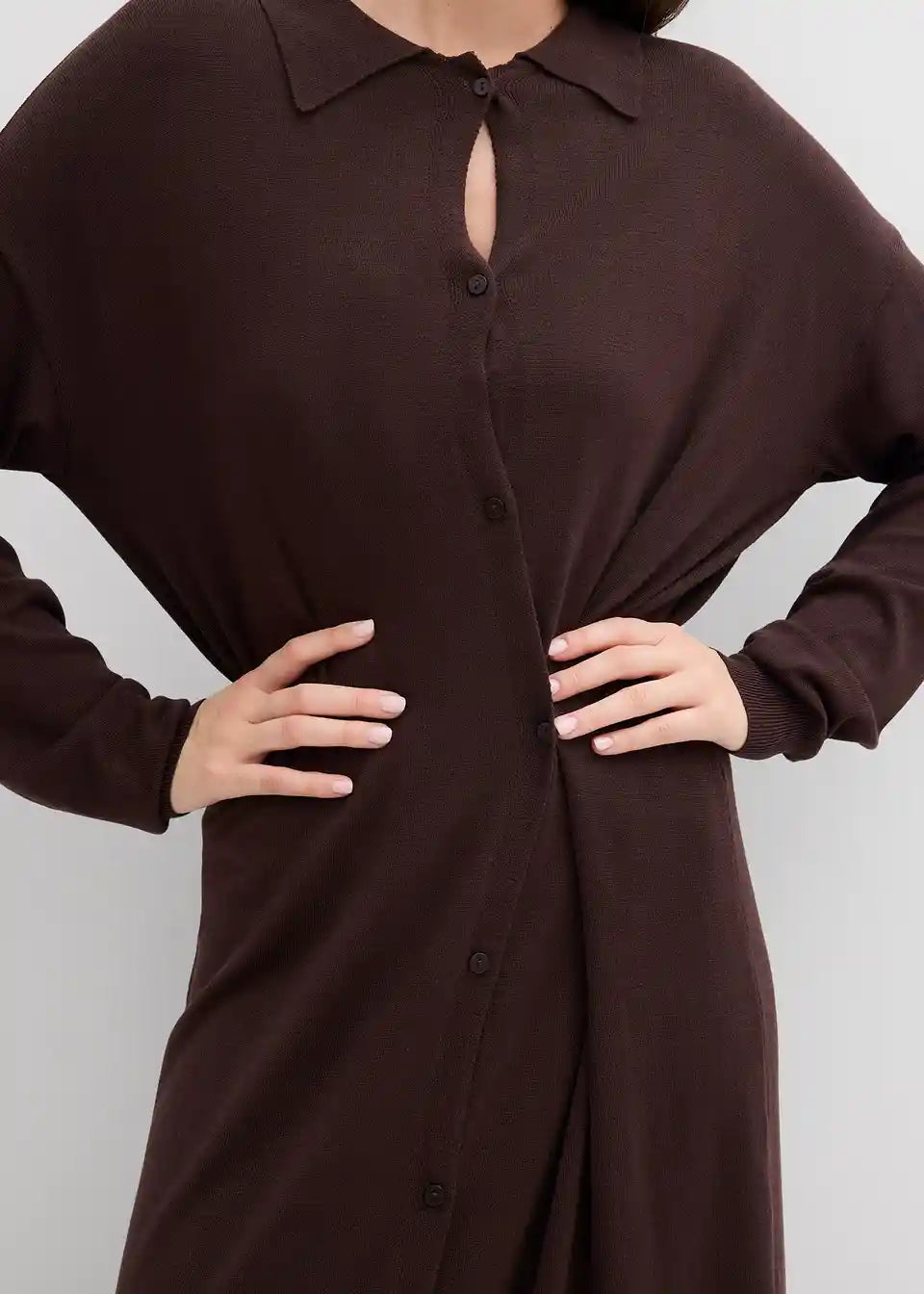 Fina pletena haljina s otvorenim ovratnikom, dugim rukavima i kopčanjem na gumbe sprijeda
