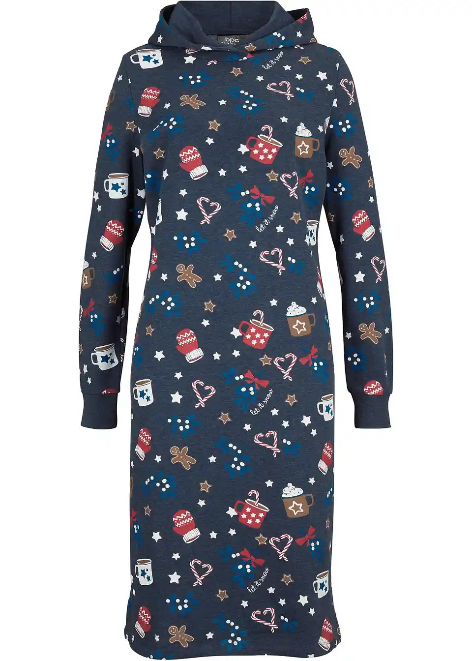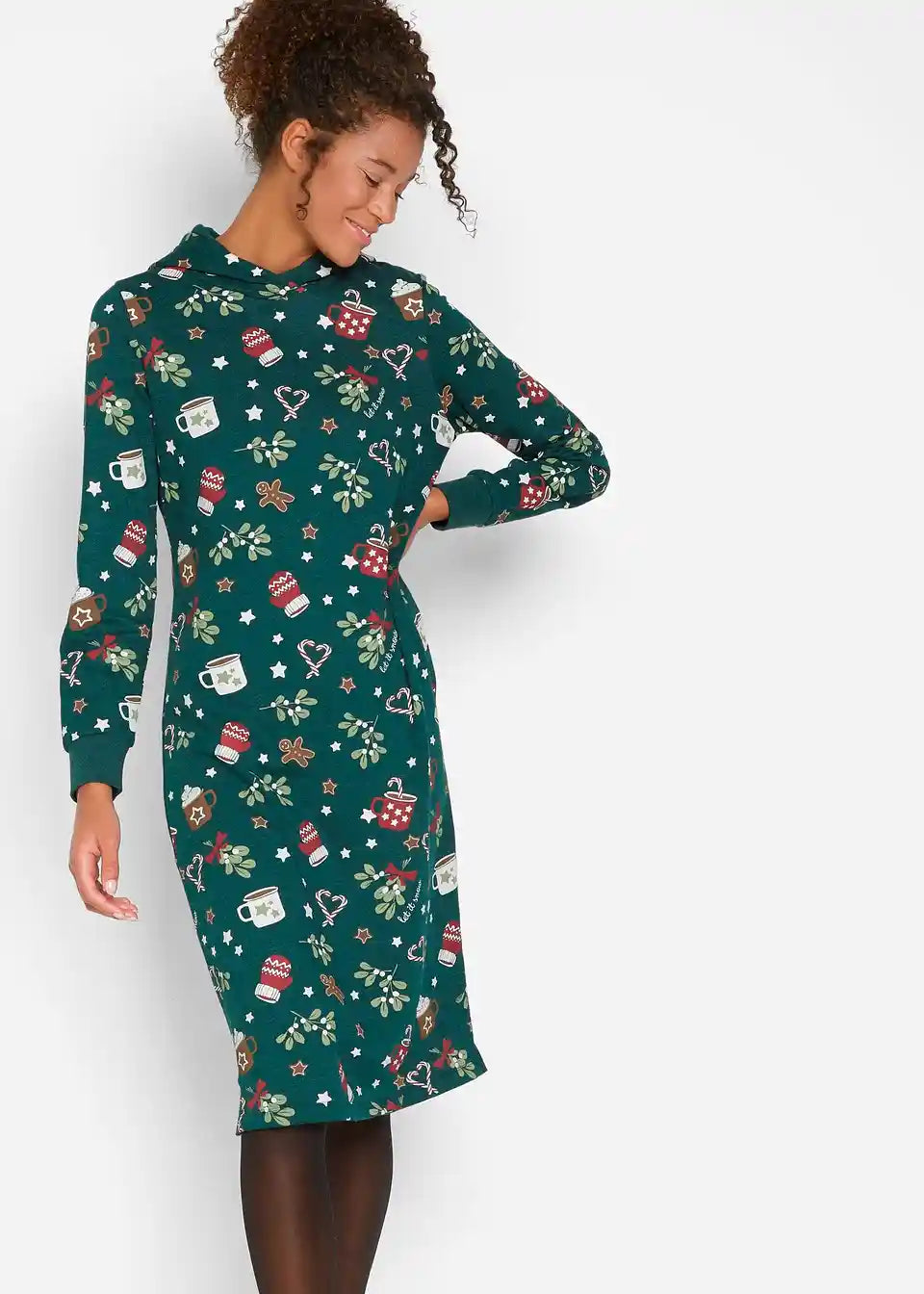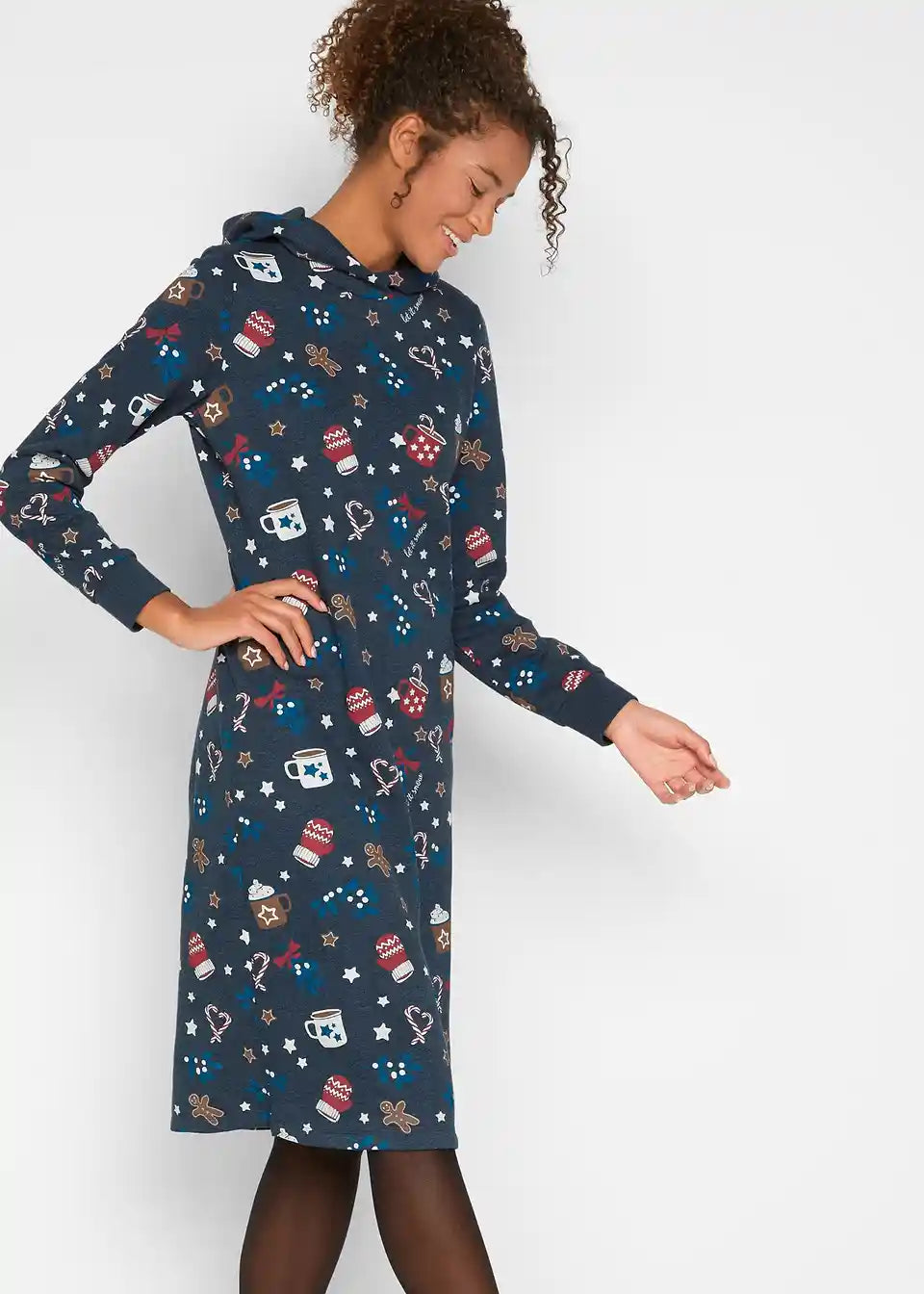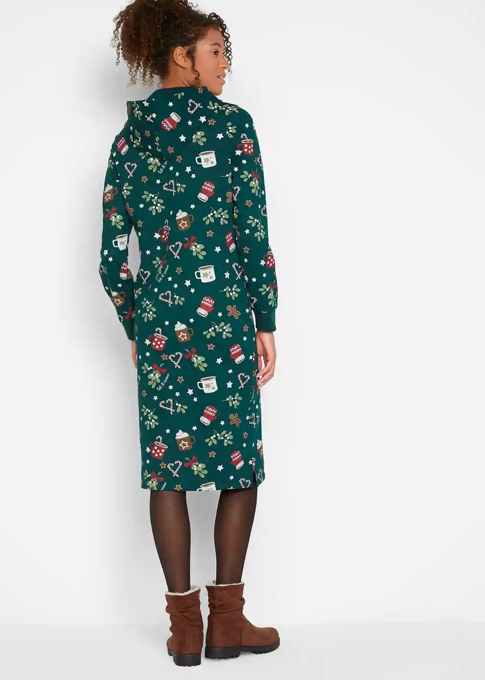 Božićno tiskana Sweat haljina s kapuljačom i bočnim prorezima