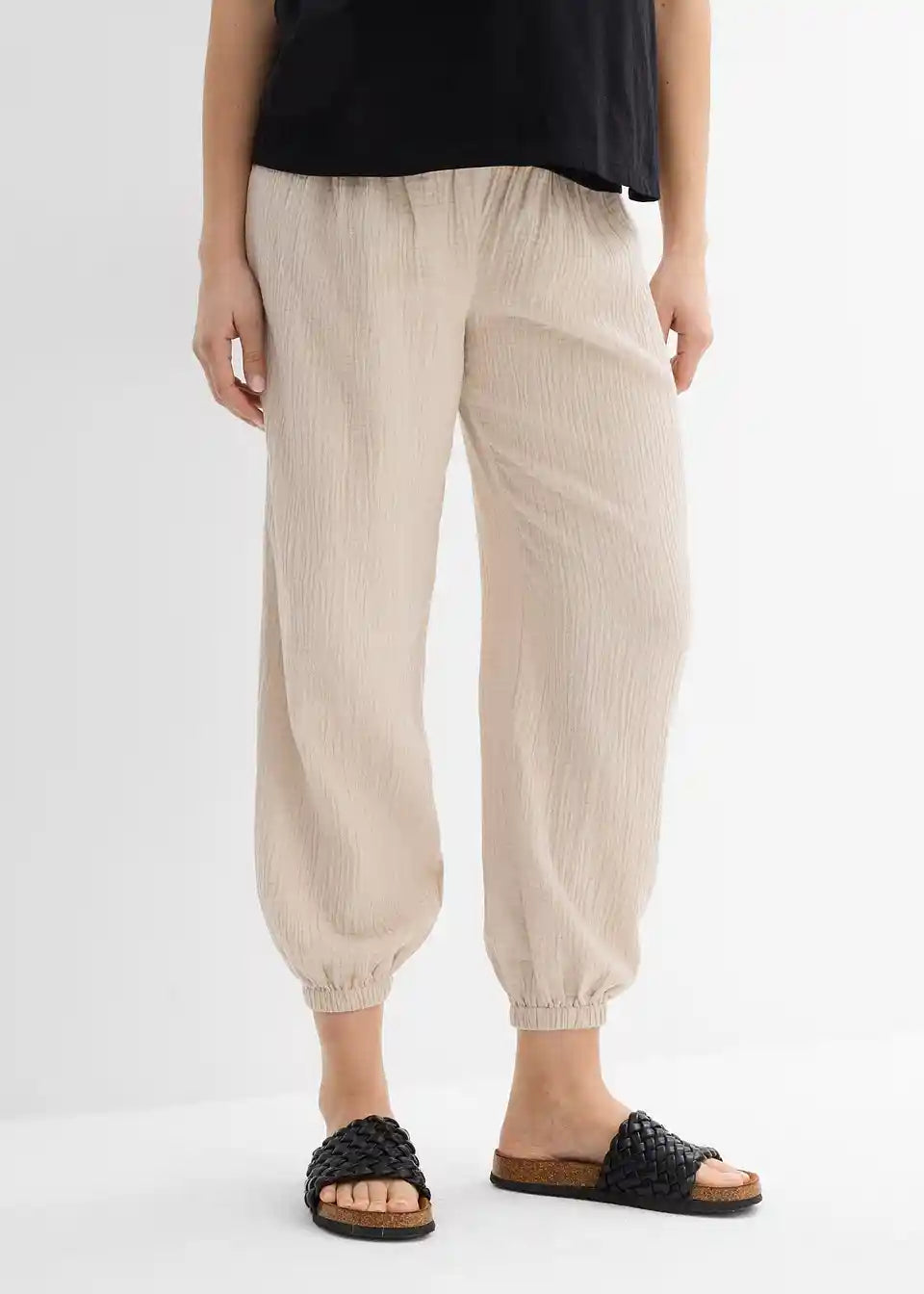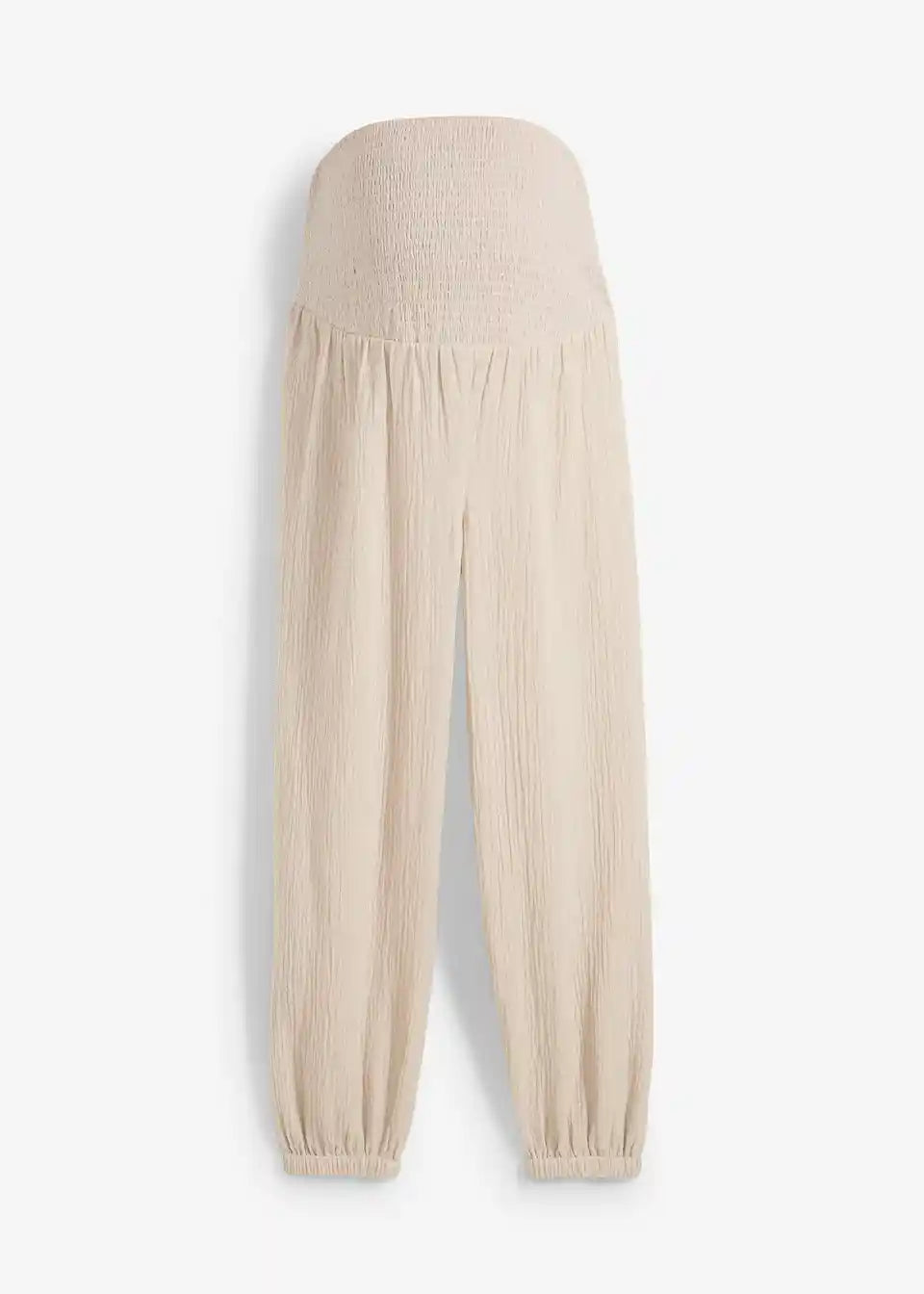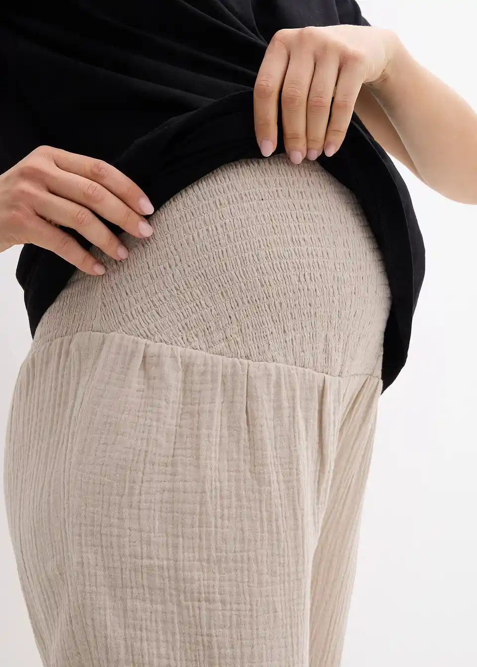 Hlače za trudnice do iznad gležnja s elastičnim smock pojasom. Ovakav kroj prilagođava se rastućem trudničkom trbuhu i nudi fleksibilnost i nakon poroda. Ljetne hlače od laganog, prozračnog pamučnog muslina opremljene su praktičnim ušivenim džepovima i elastičnom trakom u obrubu nogavica.