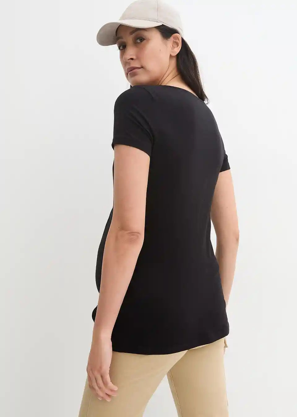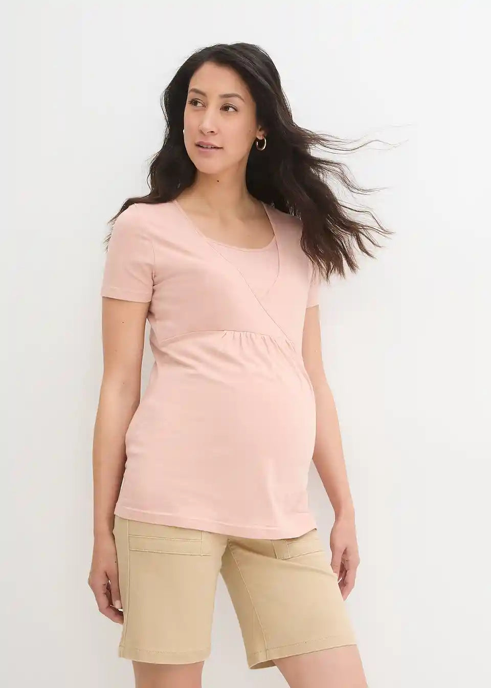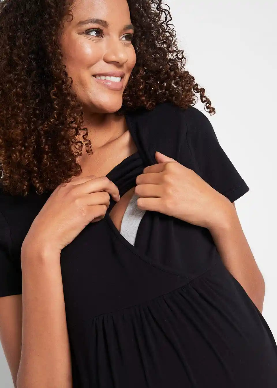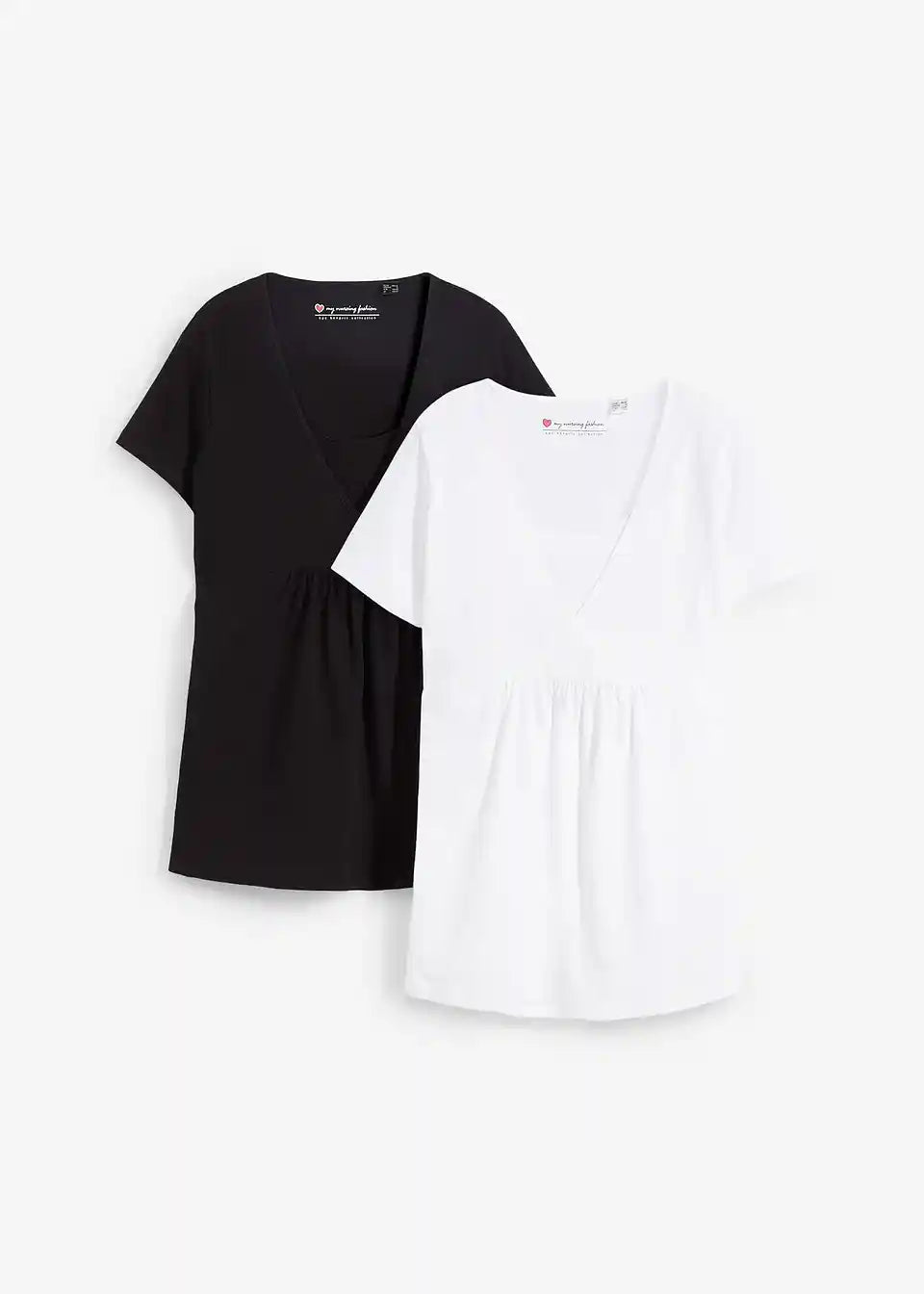 Mekane majčinske majice od jerseya s preklopnim krojem i diskretnom funkcijom za dojenje. Praktičan unutarnji top pomaže izbjeći gubitak topline i omogućuje ugodno dojenje majci i djetetu.