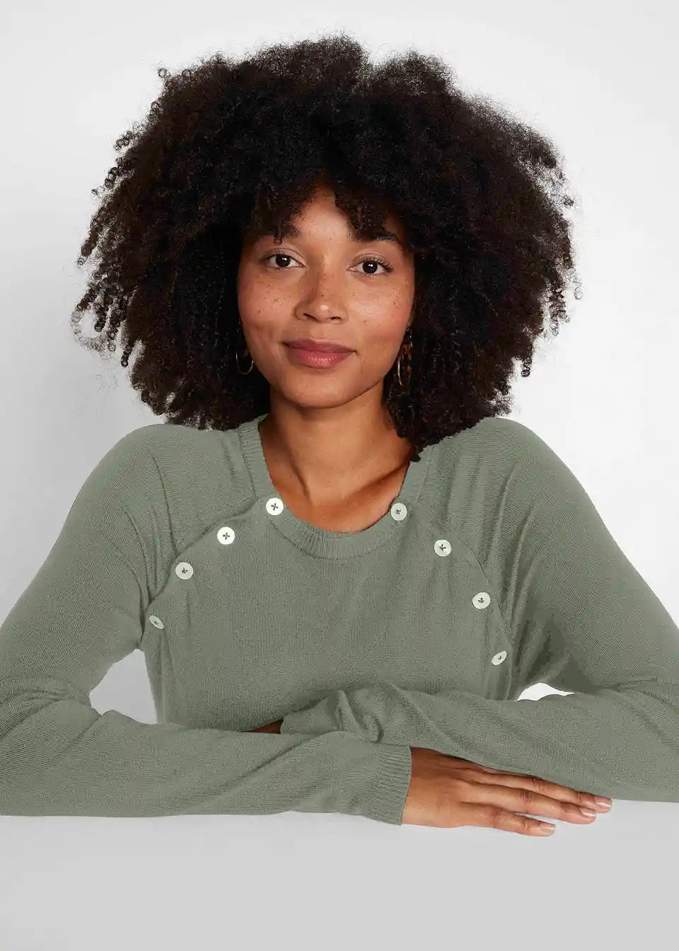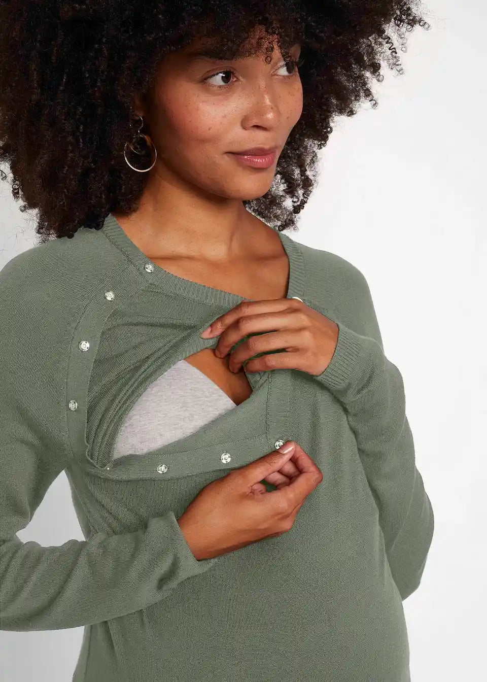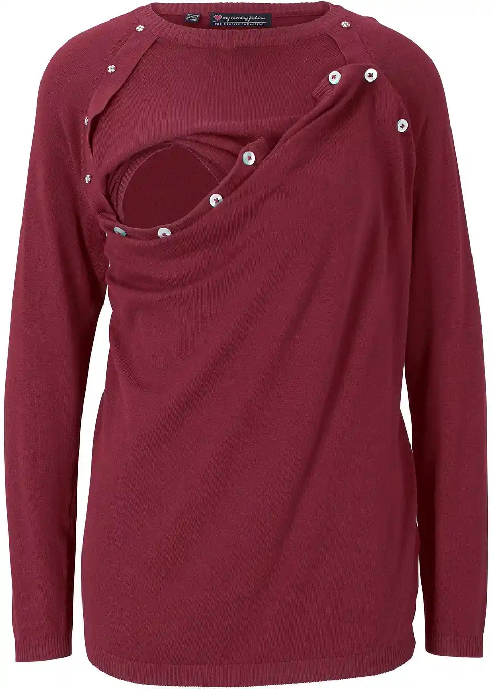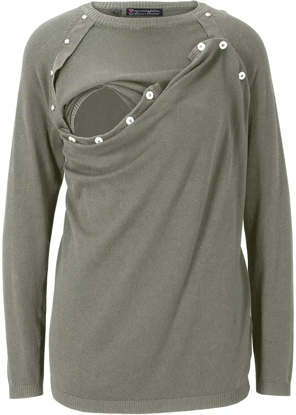 Mekani pulover s okruglim izrezom i dugim rukavima. Gornji dio ima dio koji se može otkopčati. Dizajn s dvostrukim slojevima pomaže u sprječavanju gubitka topline i omogućuje ugodno i diskretno dojenje za majku i dijete.