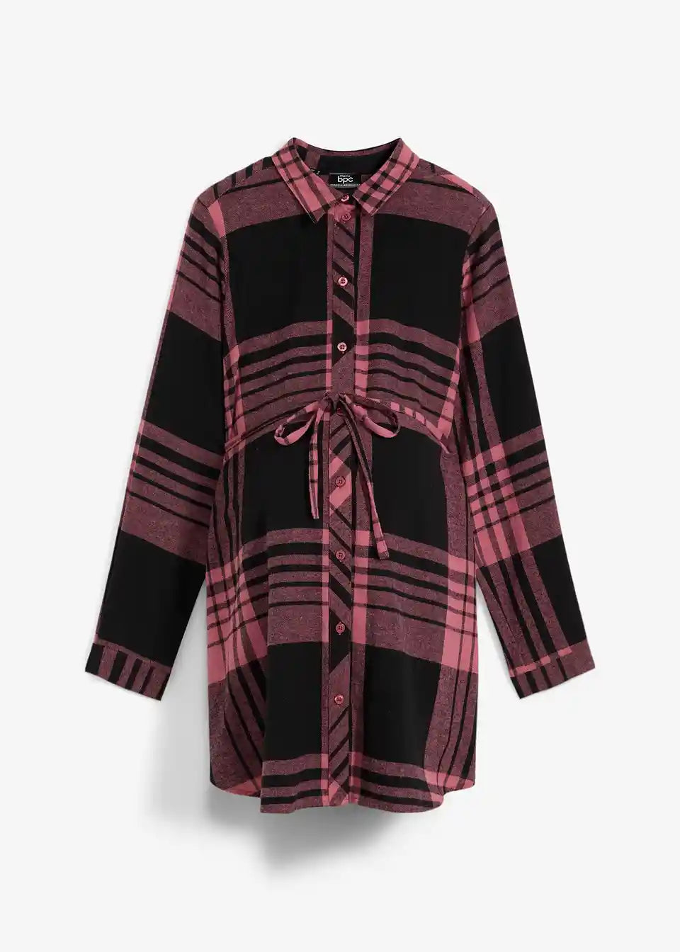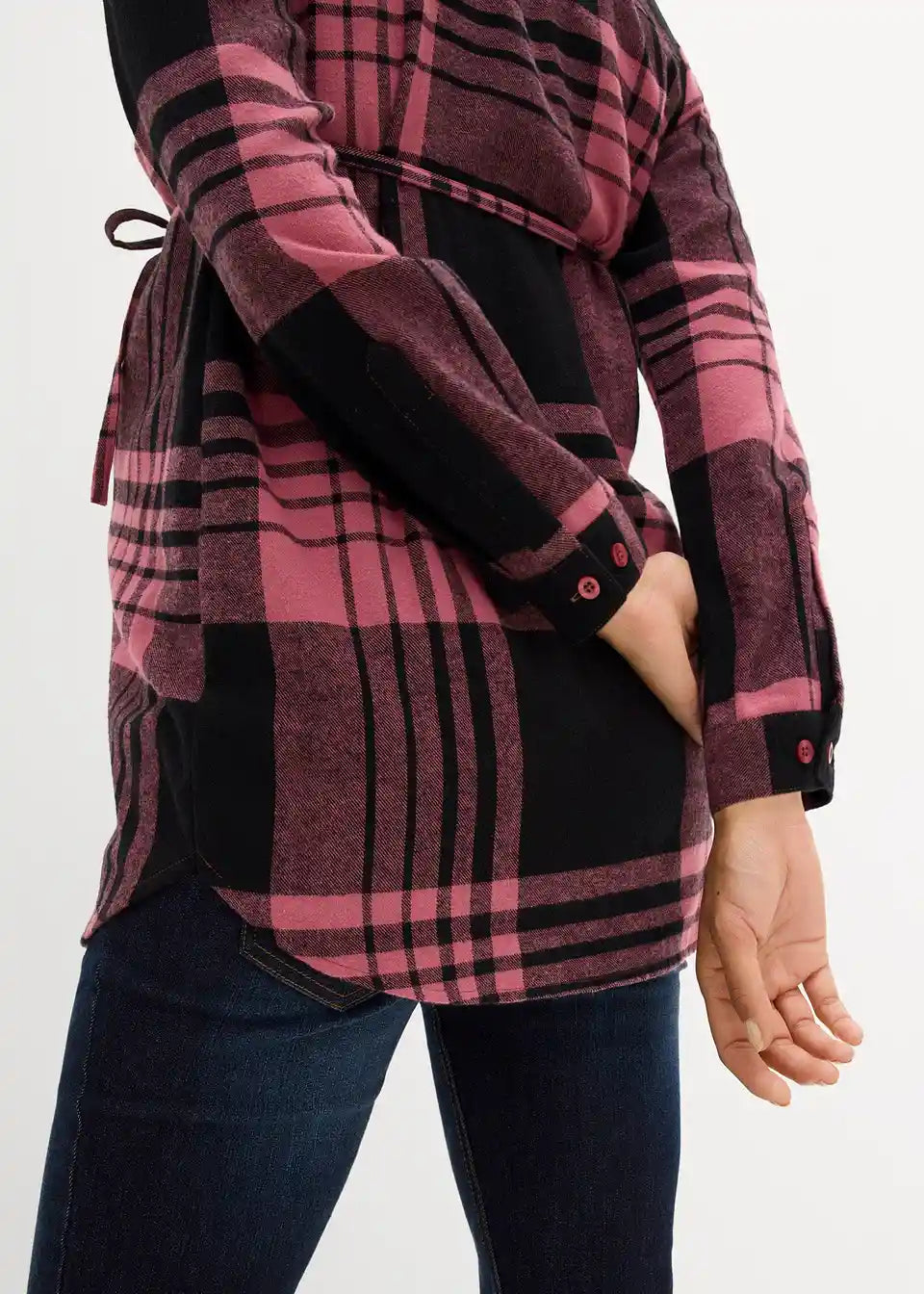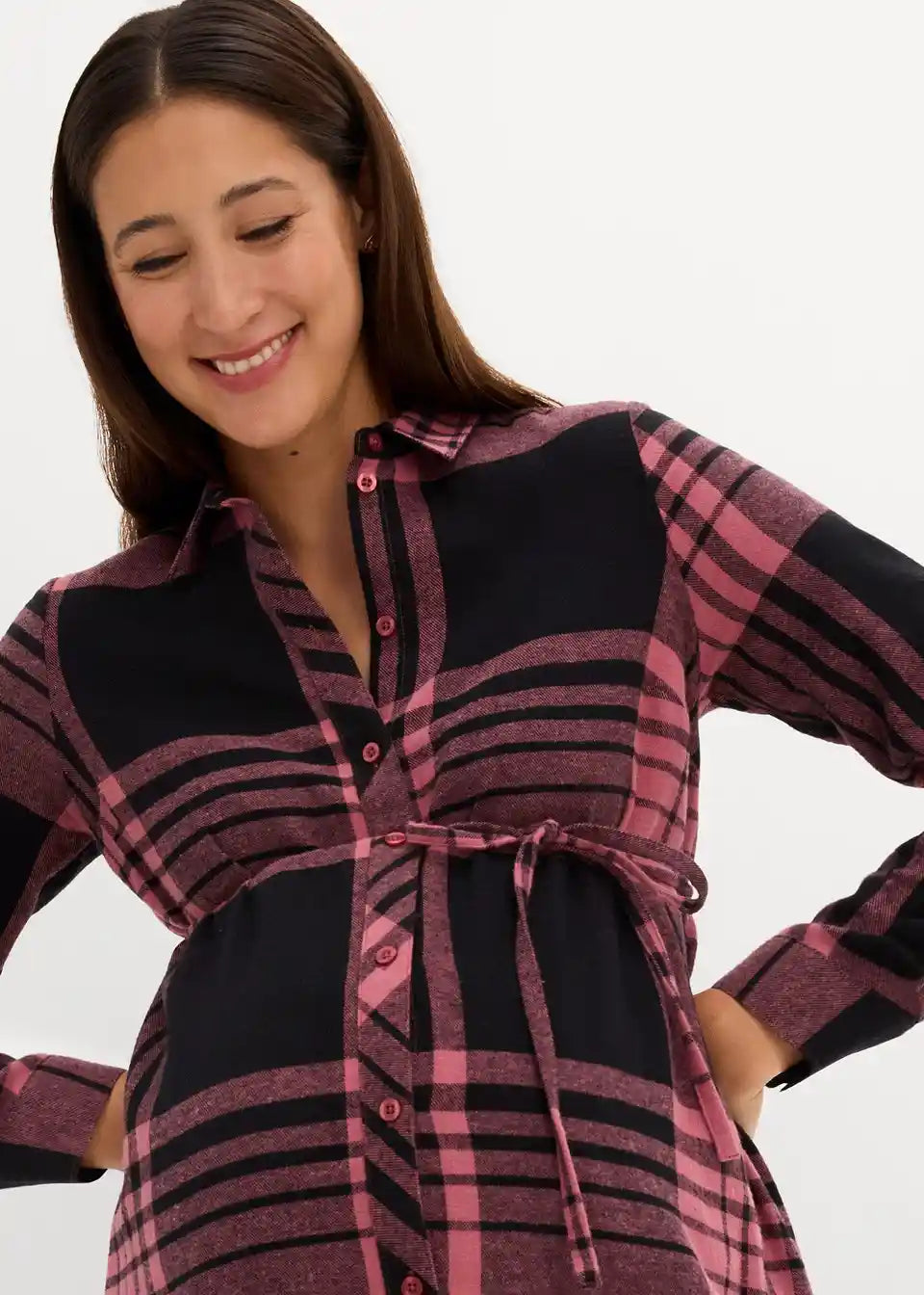 Dugo krojena karirana košulja od čistog pamuka za razdoblje tijekom i nakon trudnoće, s dovoljno prostora za rastući trbuh. Neprekidni niz gumba omogućuje lako dojenje i udobno oblačenje i svlačenje. S uklonjivim pojasom za vezanje.