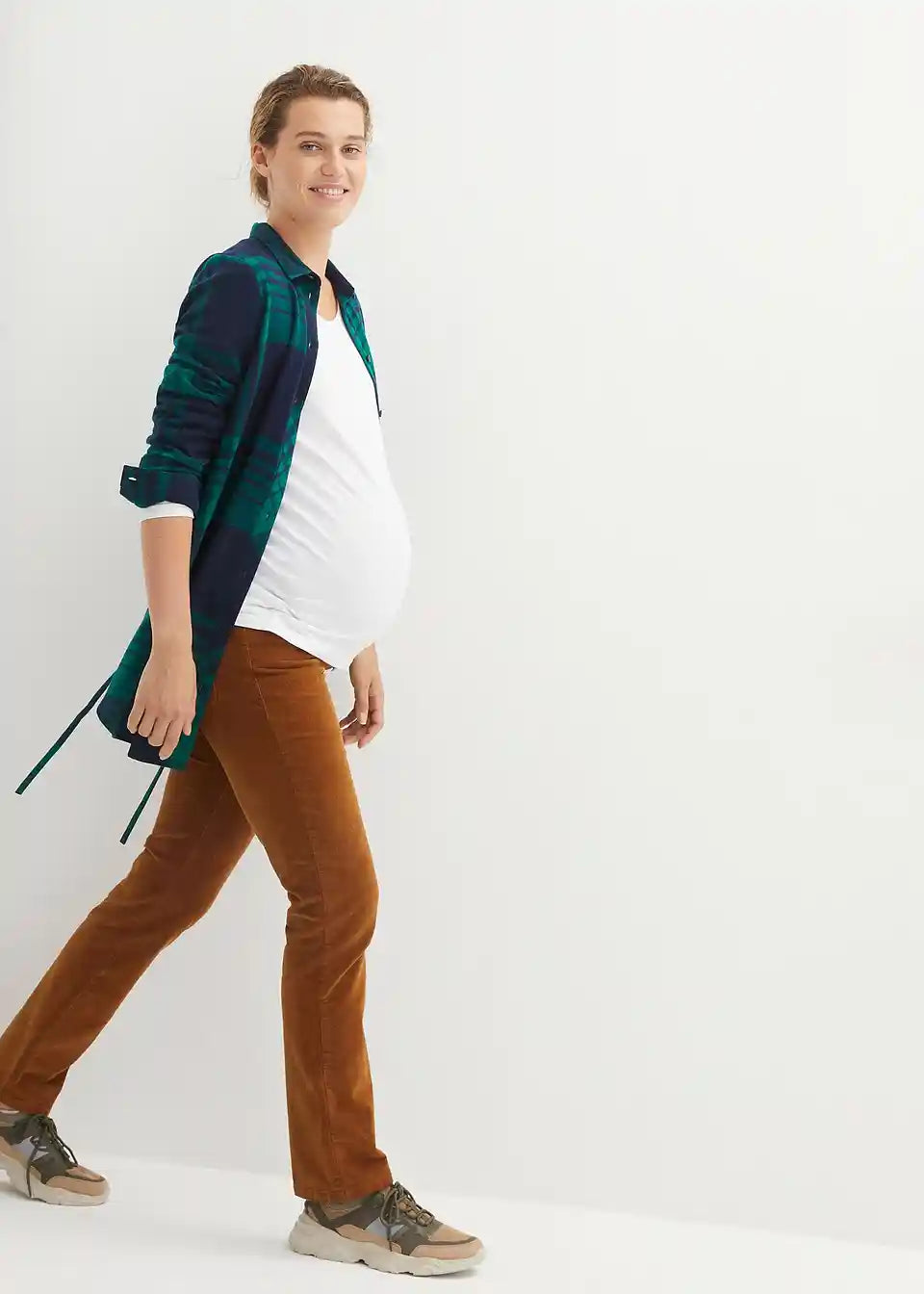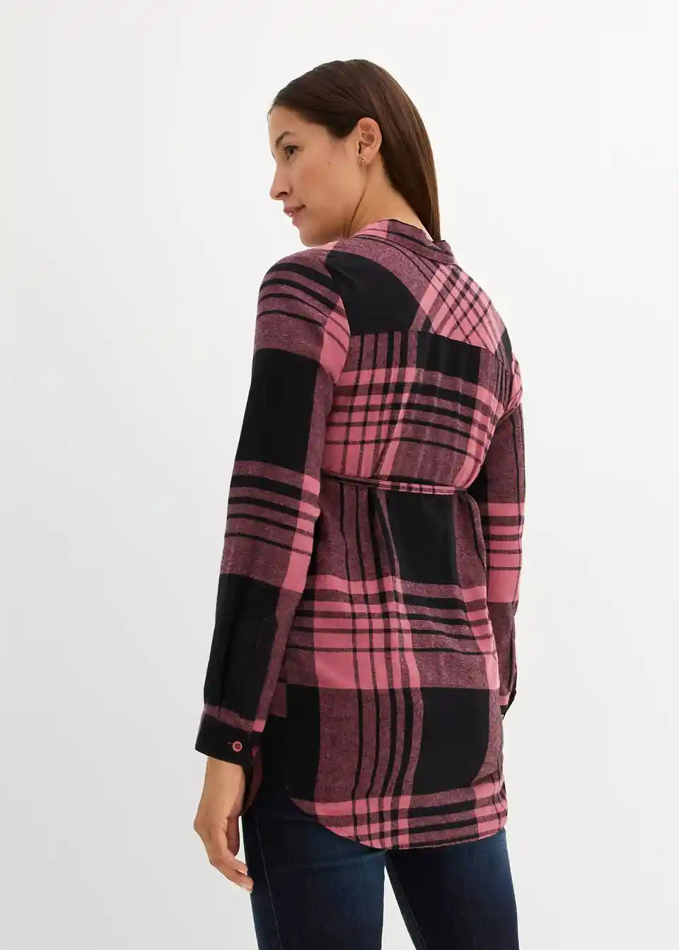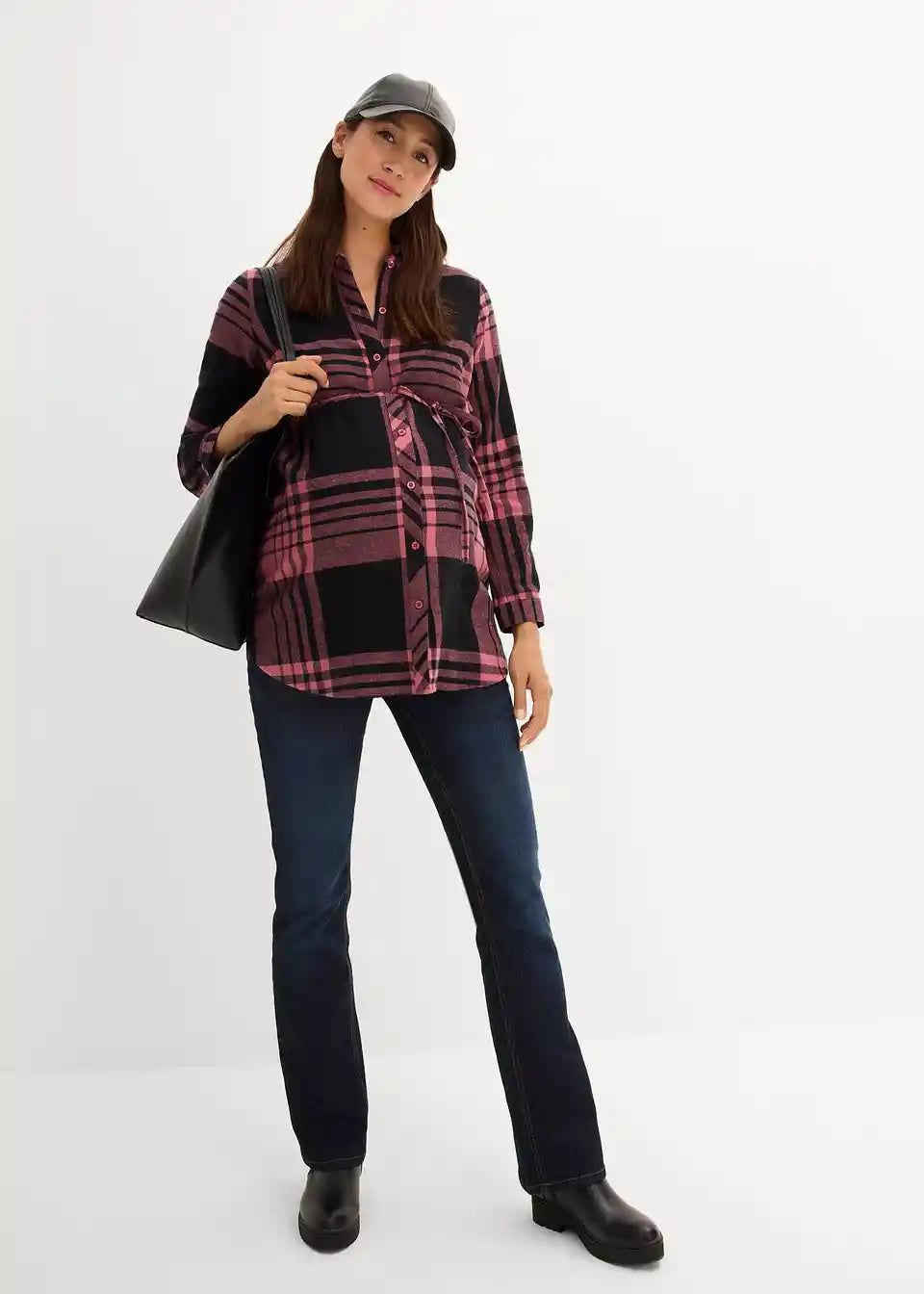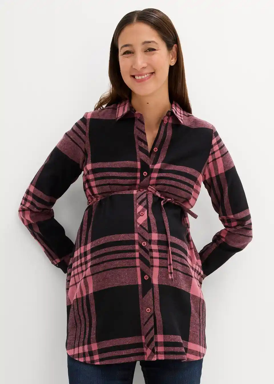 Dugo krojena karirana košulja od čistog pamuka za razdoblje tijekom i nakon trudnoće, s dovoljno prostora za rastući trbuh. Neprekidni niz gumba omogućuje lako dojenje i udobno oblačenje i svlačenje. S uklonjivim pojasom za vezanje.