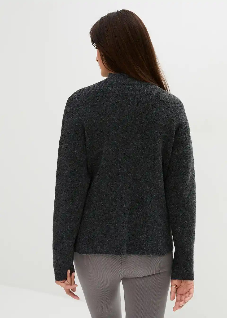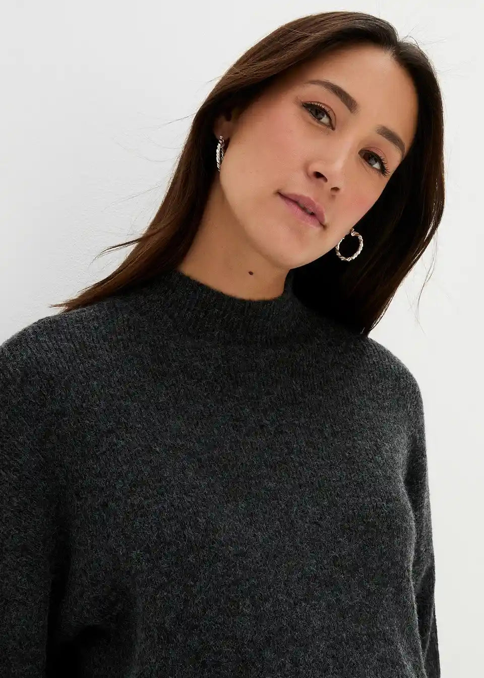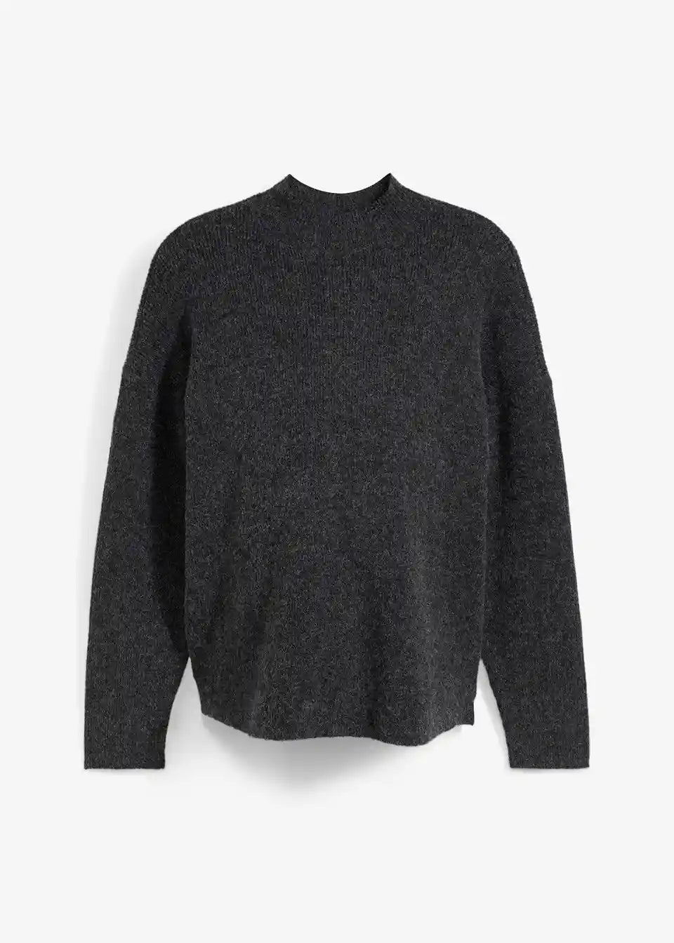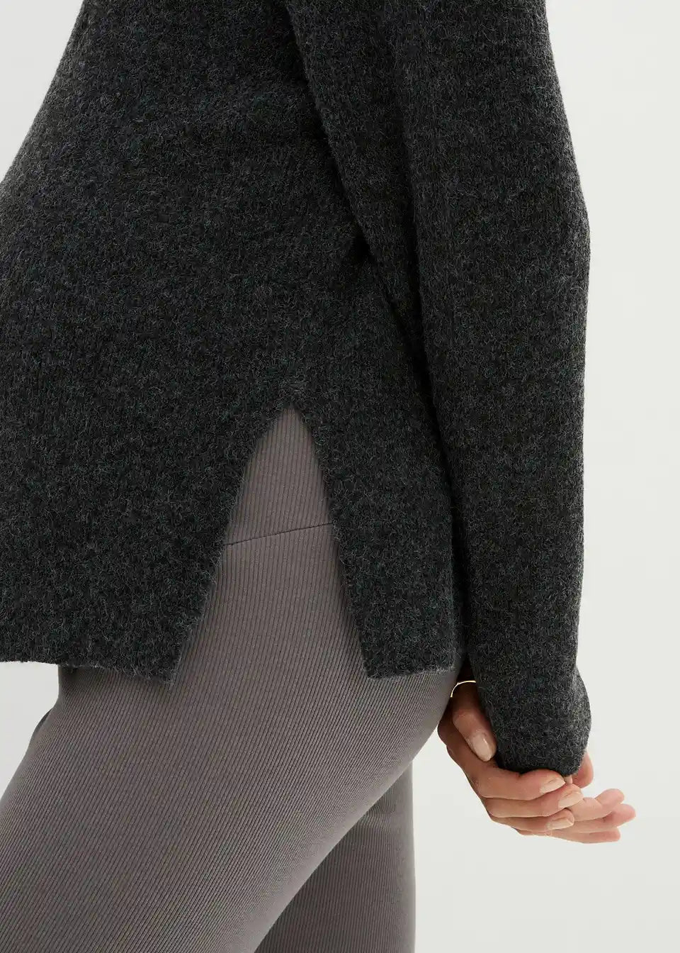 Pulover od mekane fine pletenine s bočnim prorezom za dojenje. S rebrastim okruglim izrezom i spuštenim ramenima.
