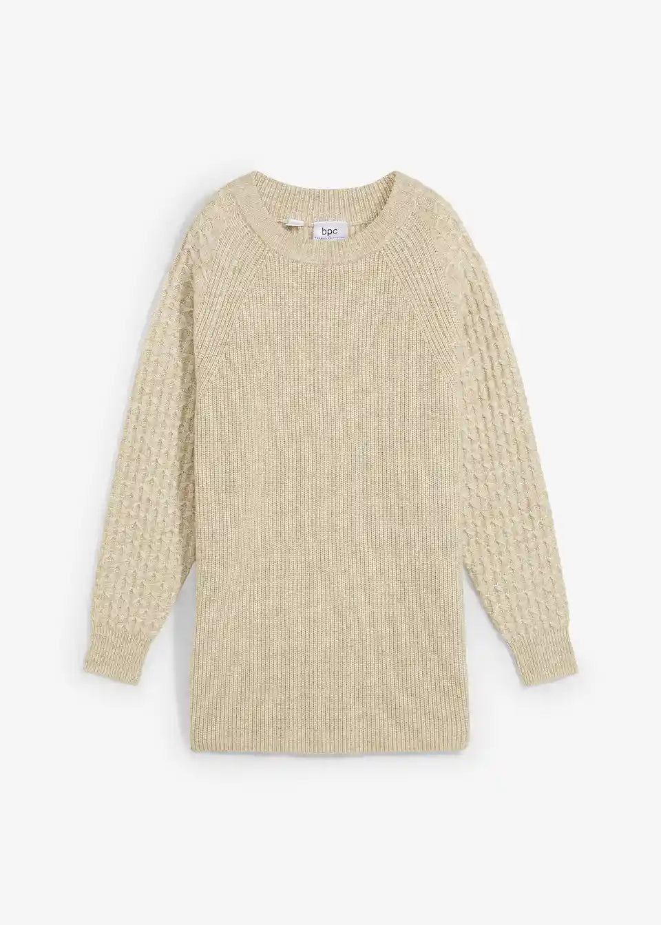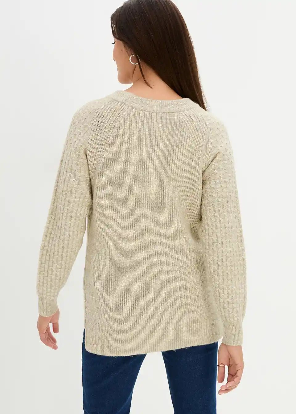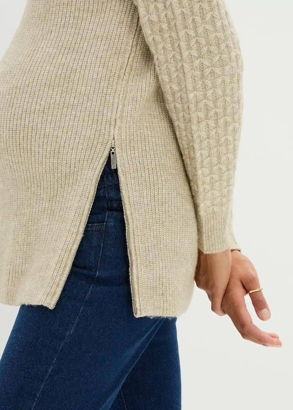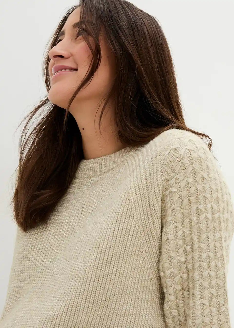 Mekani pleteni pulover za trudnoću i razdoblje dojenja. Na stranama se nalaze otvori s patentnim zatvaračima koji omogućuju udobno dojenje za majku i dijete.