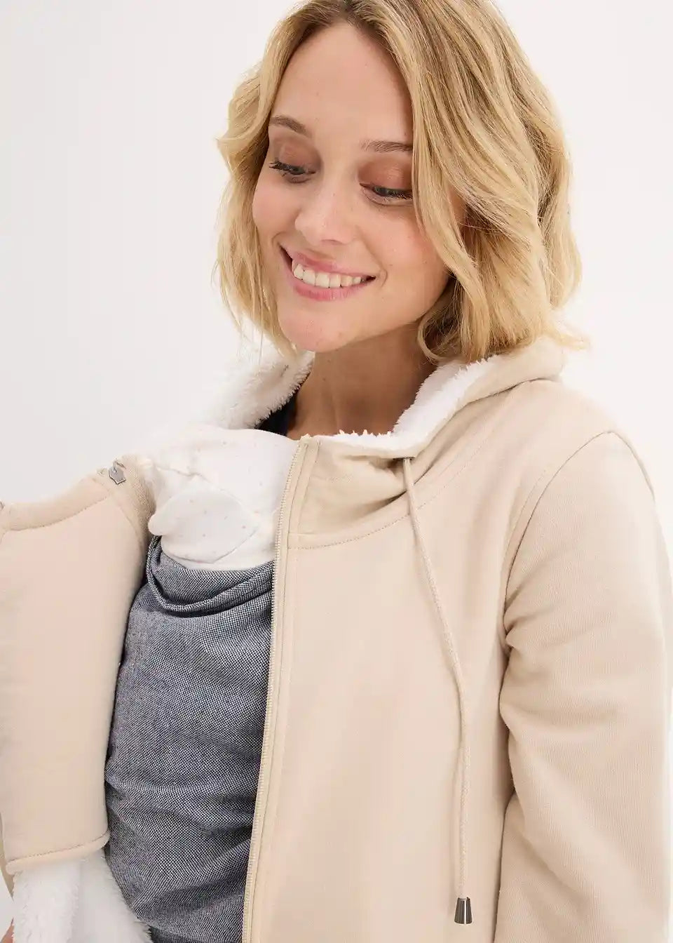 Supermekana trenirka za trudnice i majke posebno je praktična jer dolazi s umetkom za bebu. Tako se nakon porođaja jakna može nositi preko remena za nošenje bebe. Tijekom trudnoće, elastični materijal prilagođava se rastućem trbuhu i pogodna je za svih devet mjeseci. Kontrastna unutrašnjost trenirke je posebno mekana i udobna za majku i dijete. Umetak za nošenje koristi se samo za zaštitu bebe i nema funkciju nošenja!