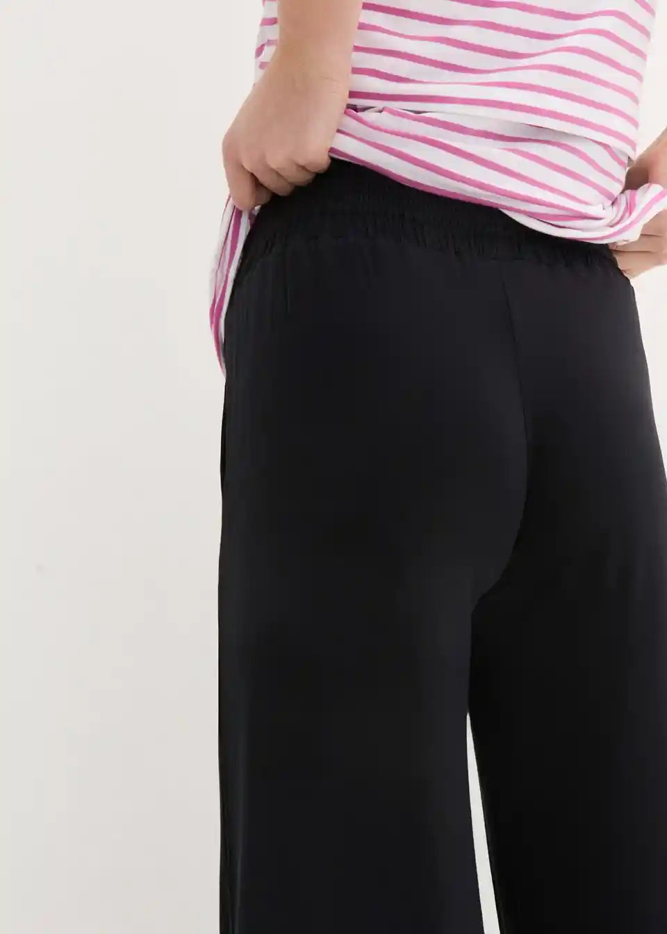 Mekane jersey hlače od nježne viskoze s malo elastana za visoku udobnost nošenja, s dodanim smock pojasom koji se nježno prilagođava svakom mjesecu trudnoće. S praktičnim prednjim džepovima. Udoban kroj sa širokim nogavicama koje nisu do gležnja.