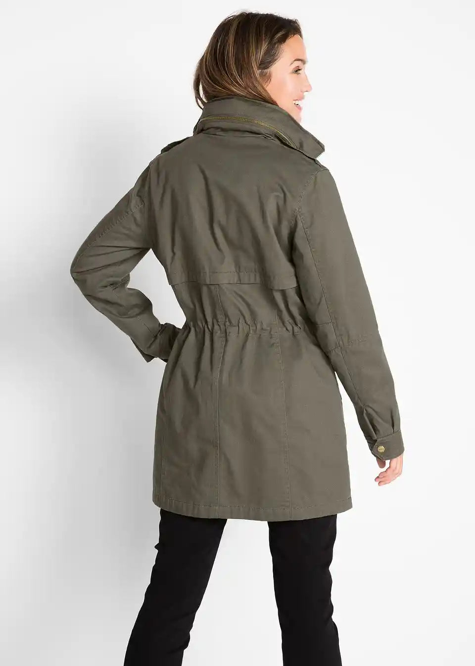Ovaj kratki parka iz bpc-a idealan je za prijelazno razdoblje. Ima laganu jersey podstavu i dva velika našivena džepa s preklopom i drukerima na prednjoj strani. Model je krojen tako da nježno prati figuru, no vezica u struku omogućuje individualno reguliranje širine. Zatvarač ide sve do stojećeg ovratnika i prekriven je preklopom s drukerima.